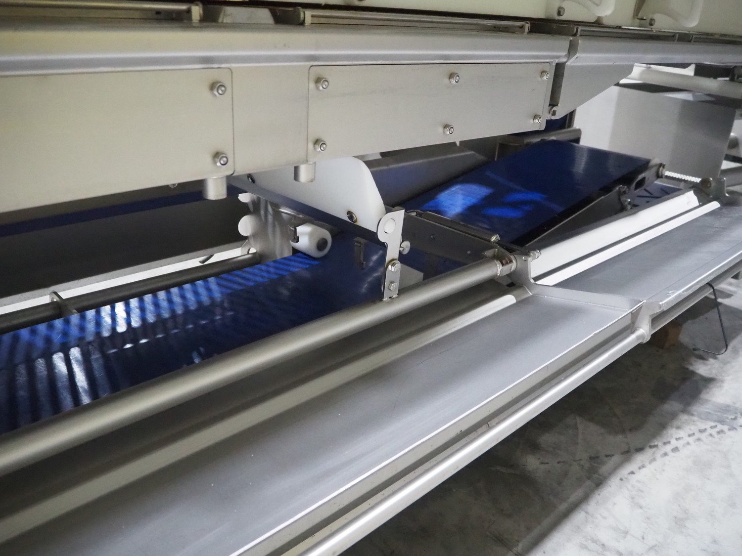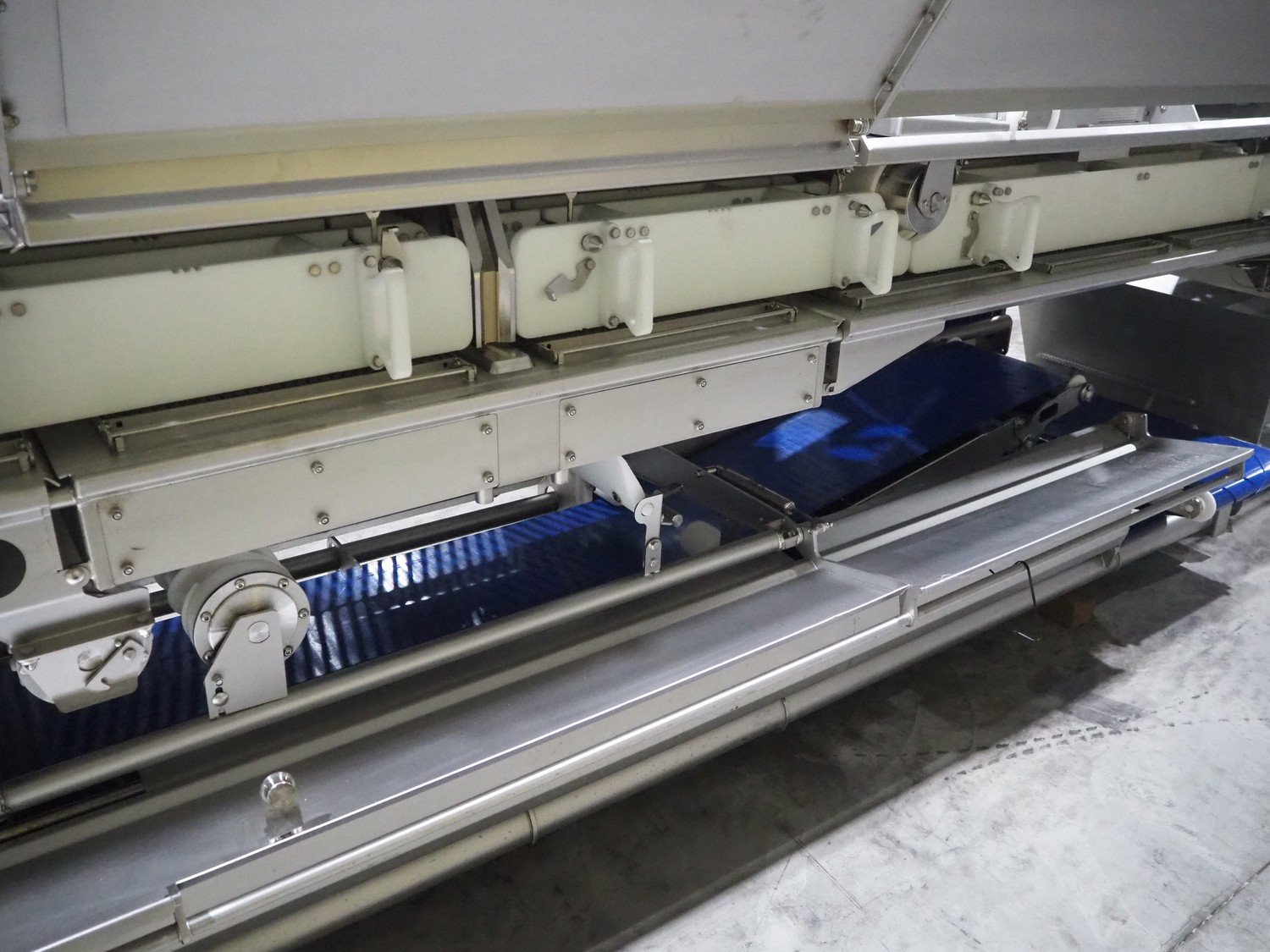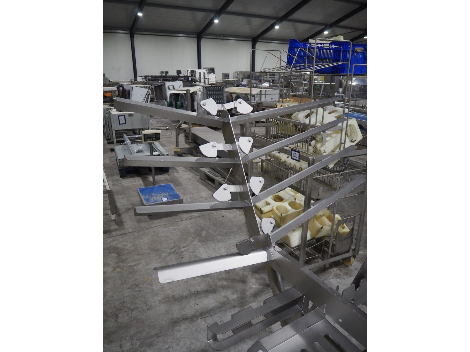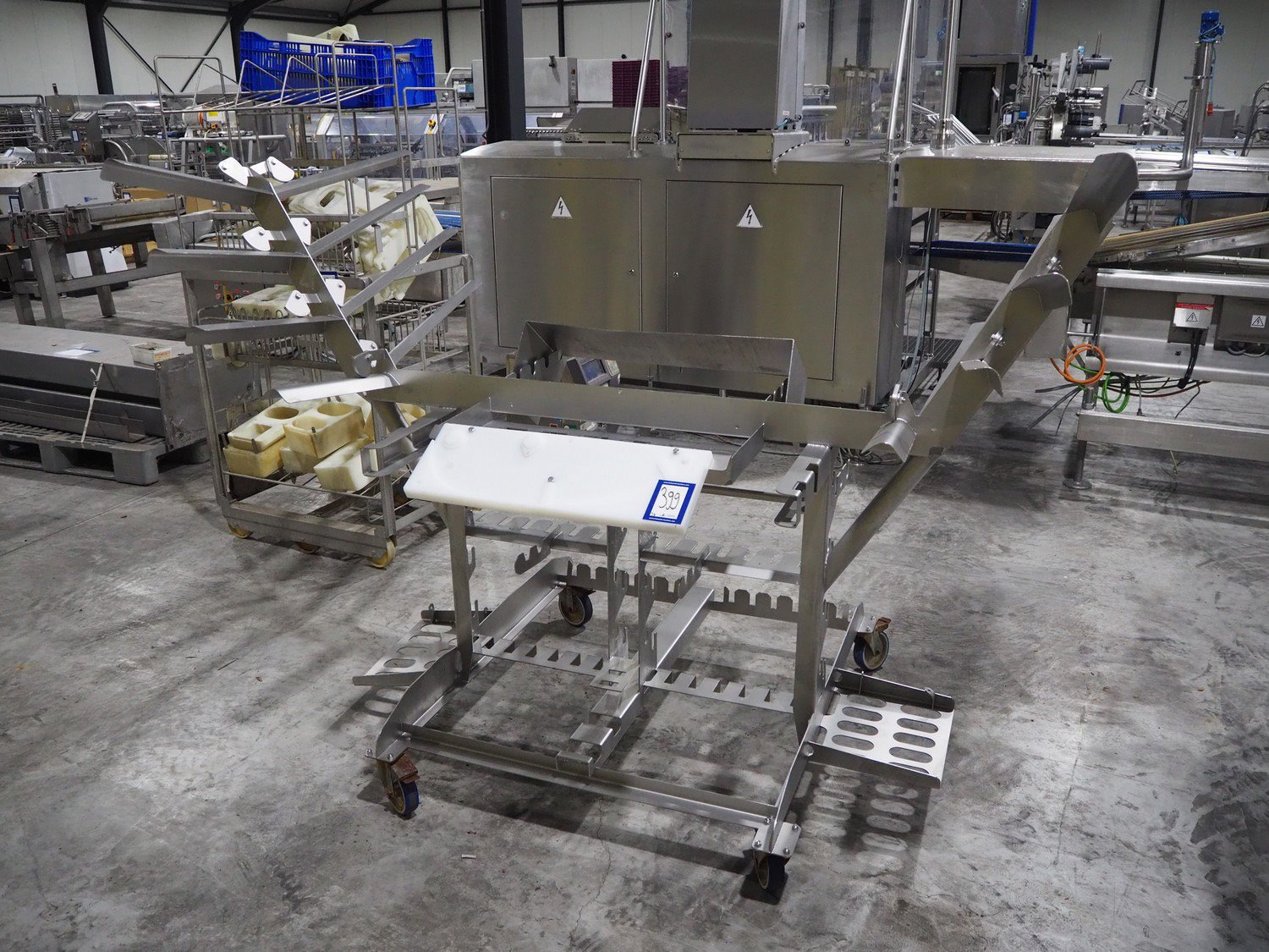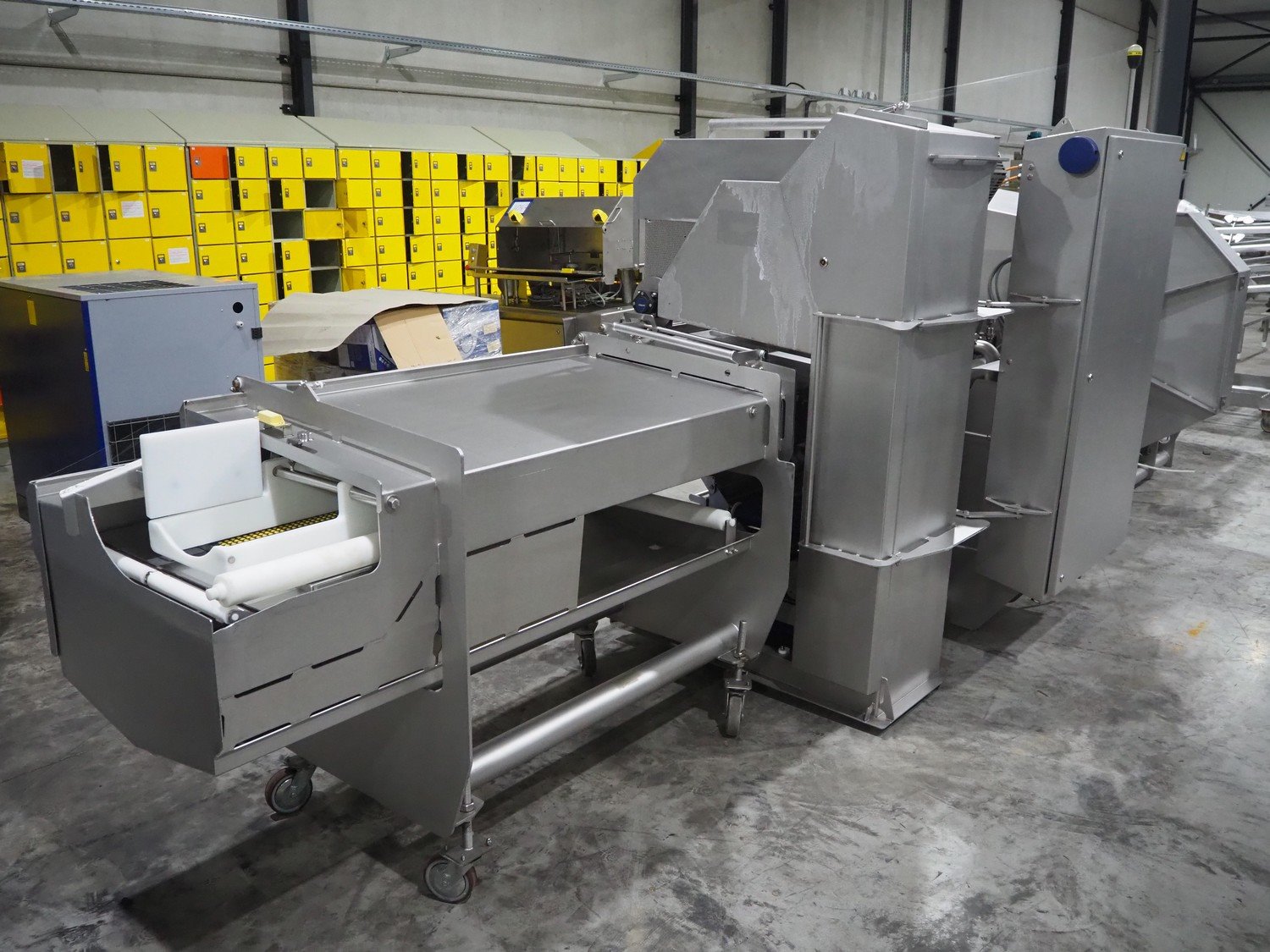 Marel trim inspection and portioning system, model: 850-9000-0011, type: 0012-102-00013, serial number: A143817, year of construction: 2016, plastic infeed belt, belt width: 590 mm, plastic belt, belt width: (2x) 380 mm, plastic mesh belt, belt width: 260 mm and 200 mm, total dimensions: 5150 mm x 1550 mm x 2160 mm. Including outfeed belt, dimensions: 1840 mm x 900 mm x 1180 mm, and 2x trolley for parts, dimensions: 2000 mm x 1150 mm x 1550 mm and 1650 mm x 1450 mm x 980 mm. Kavel locatie: Langereijt 29A, 5091 JP Middelbeers, Nederland
