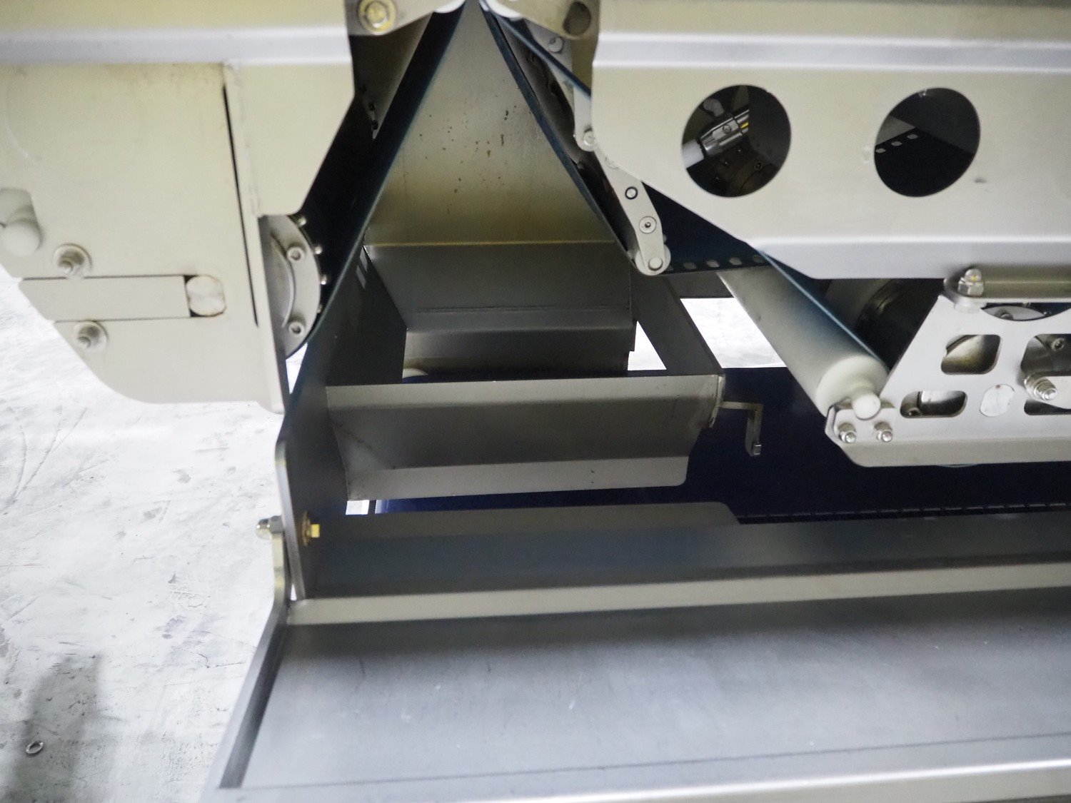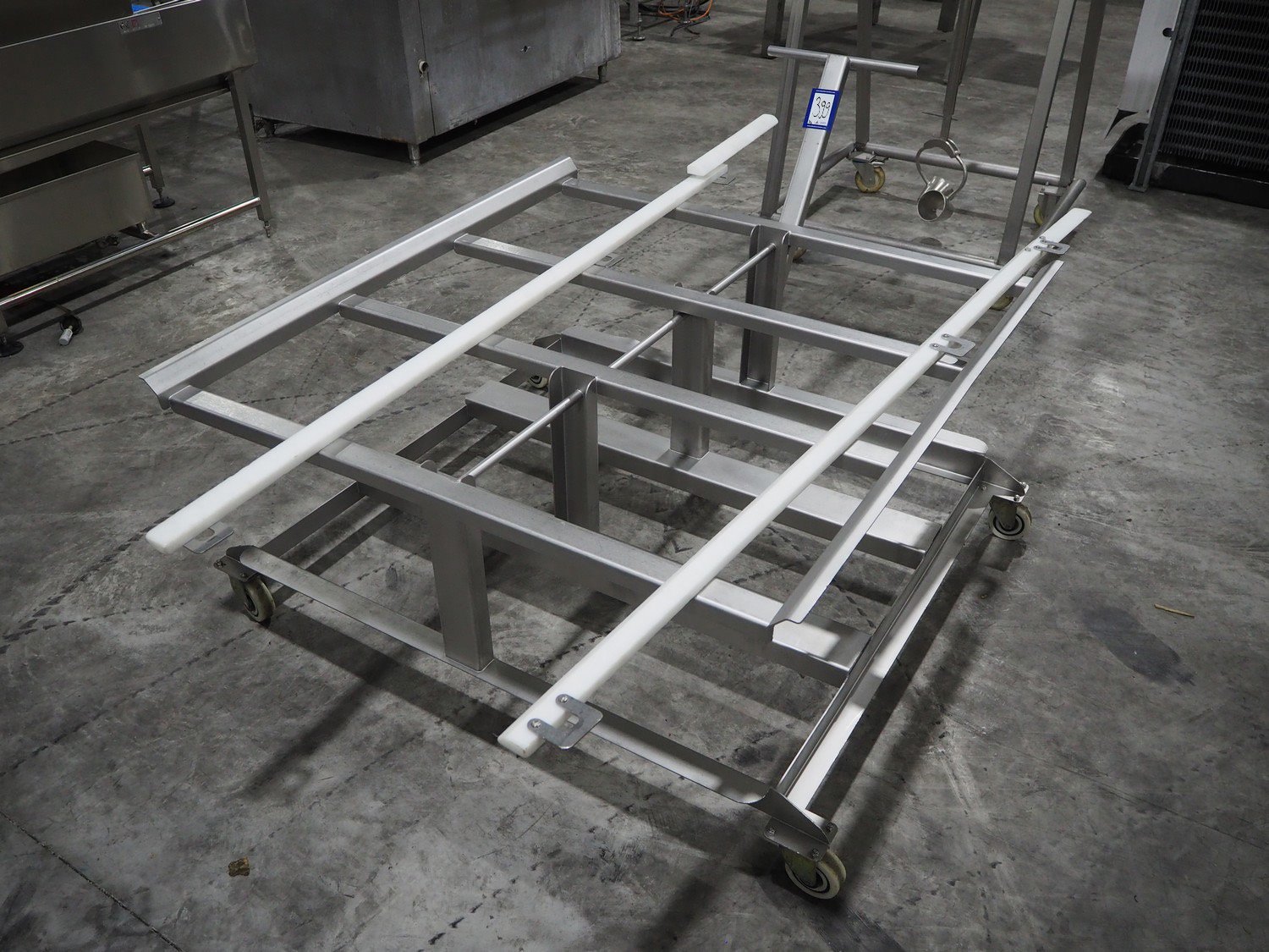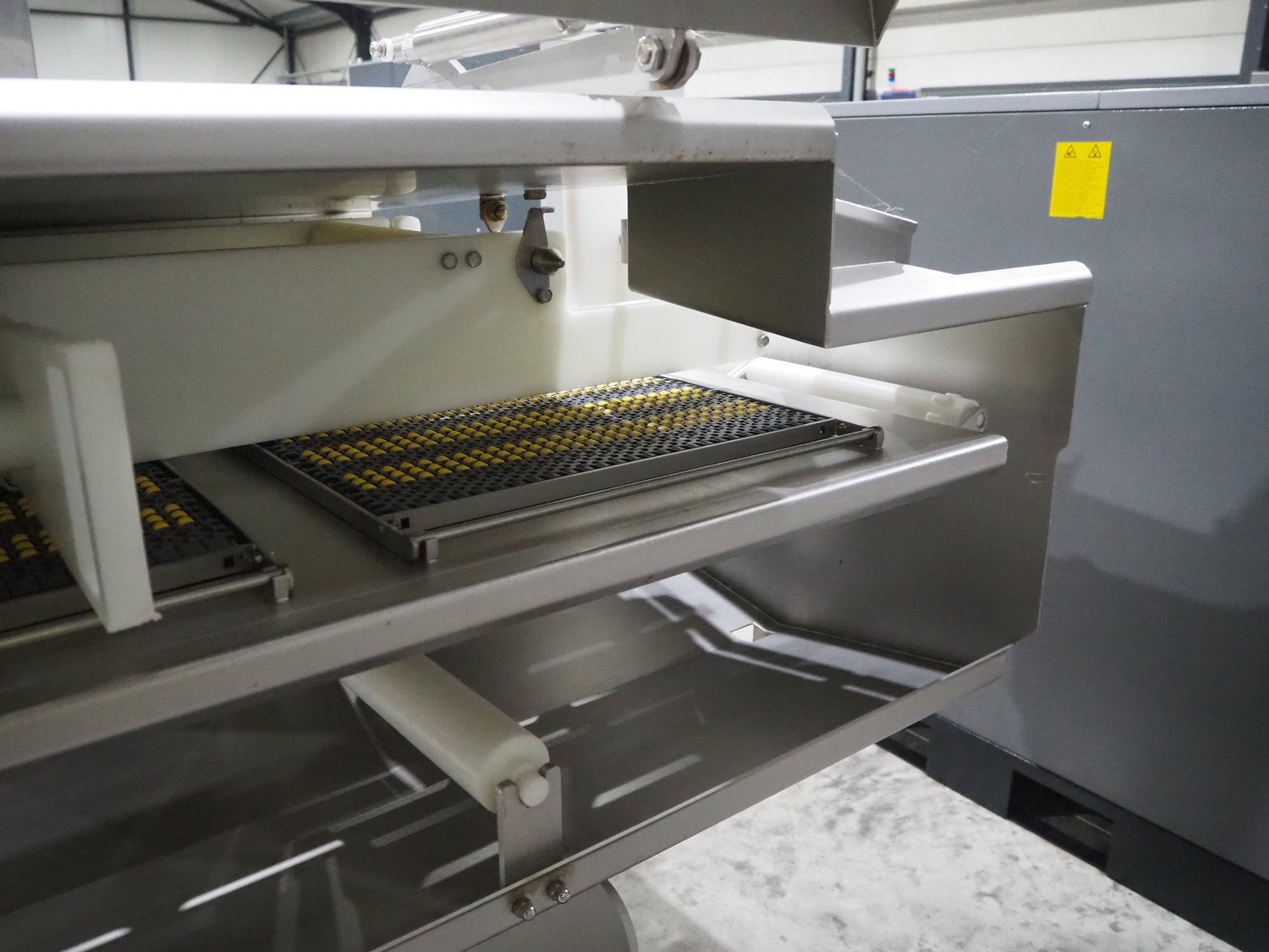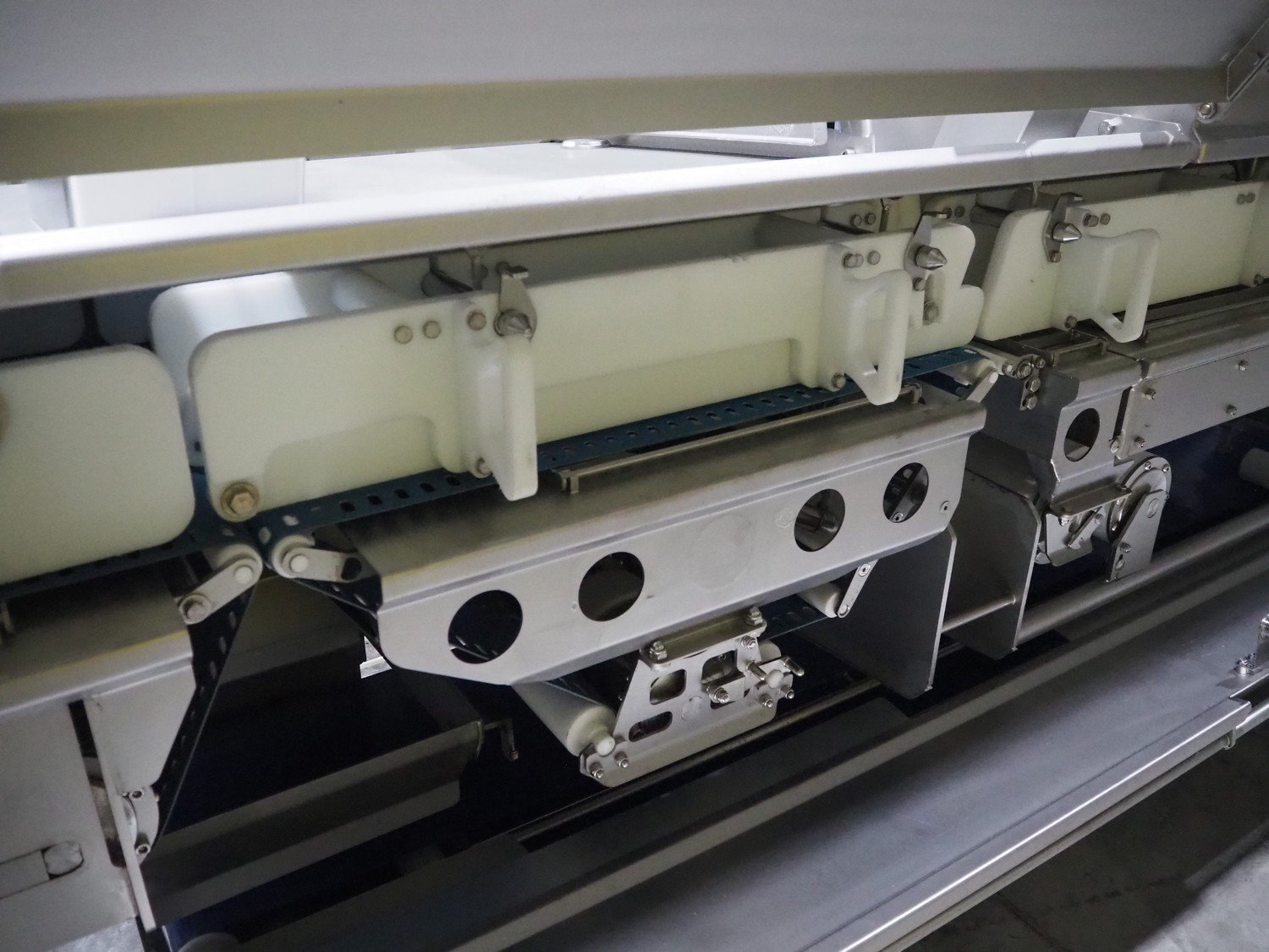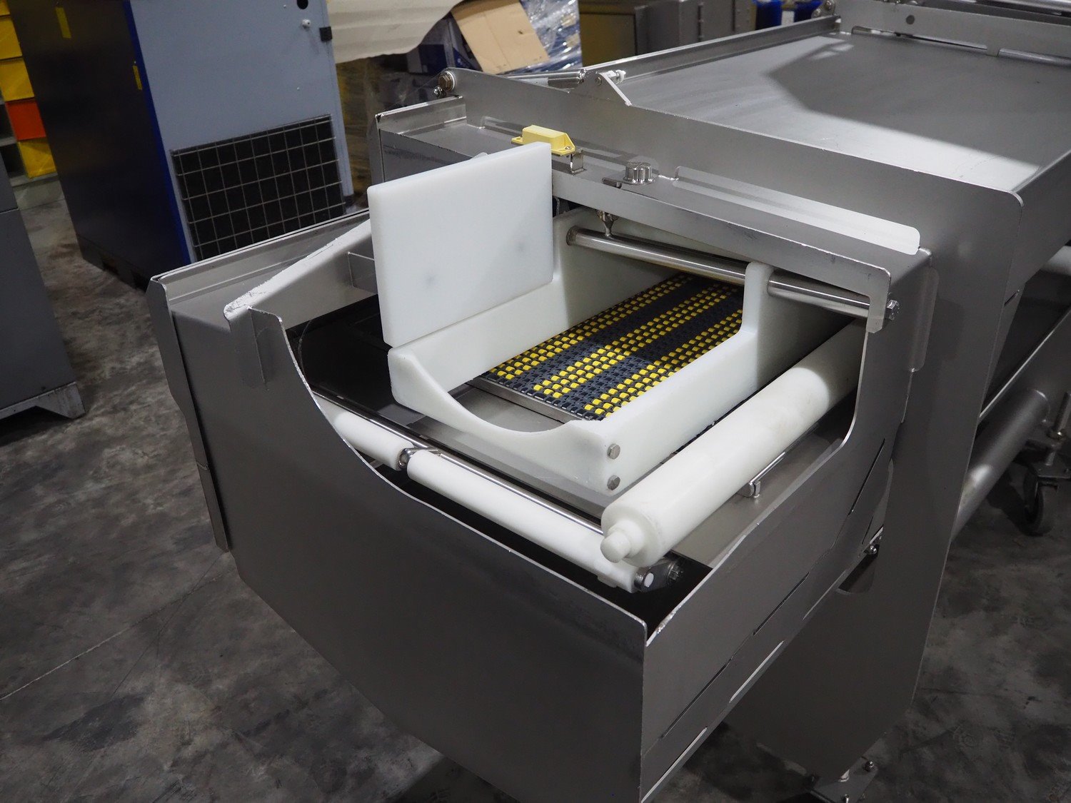 Marel trim inspection and portioning system, model: 850-9000-0011, type: 0012-102-00013, serial number: A143817, year of construction: 2016, plastic infeed belt, belt width: 590 mm, plastic belt, belt width: (2x) 380 mm, plastic mesh belt, belt width: 260 mm and 200 mm, total dimensions: 5150 mm x 1550 mm x 2160 mm. Including outfeed belt, dimensions: 1840 mm x 900 mm x 1180 mm, and 2x trolley for parts, dimensions: 2000 mm x 1150 mm x 1550 mm and 1650 mm x 1450 mm x 980 mm. Kavel locatie: Langereijt 29A, 5091 JP Middelbeers, Nederland