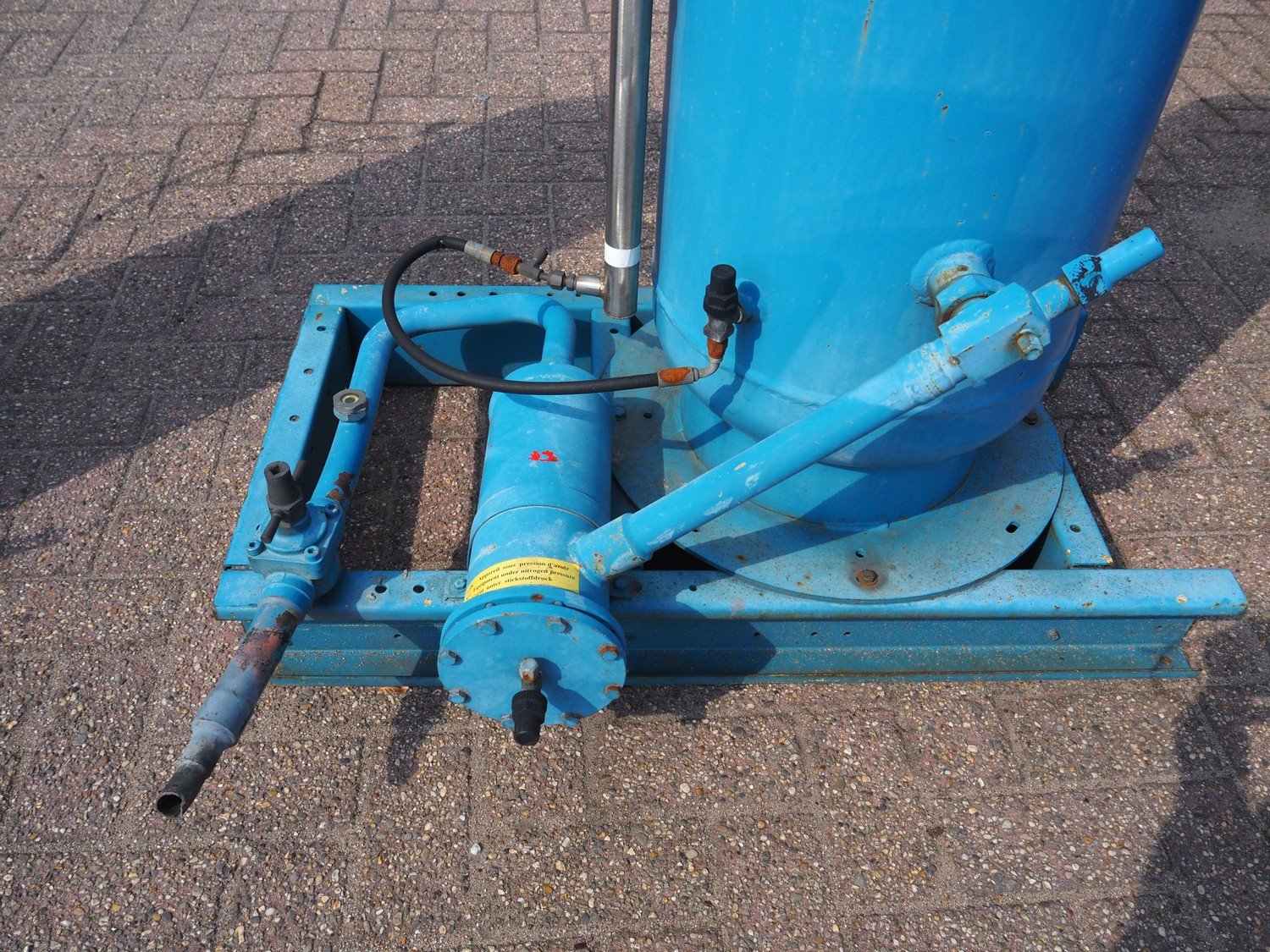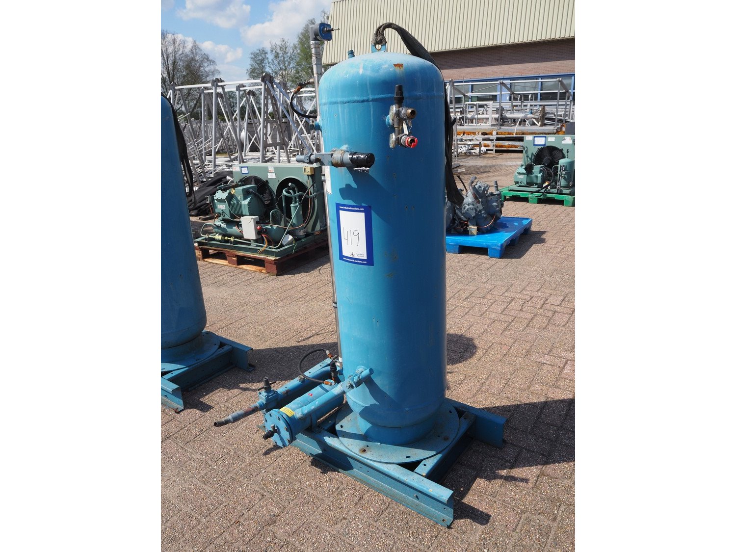 Steel pressure vessel, dimensions tank: Ø 400 mm x 1300 mm, total dimensions: 1000 mm x 750 mm x 1700 mm. Kavel locatie: Westelbeersedijk 18, 5091 SM Oost-, West- en Middelbeers, Nederland