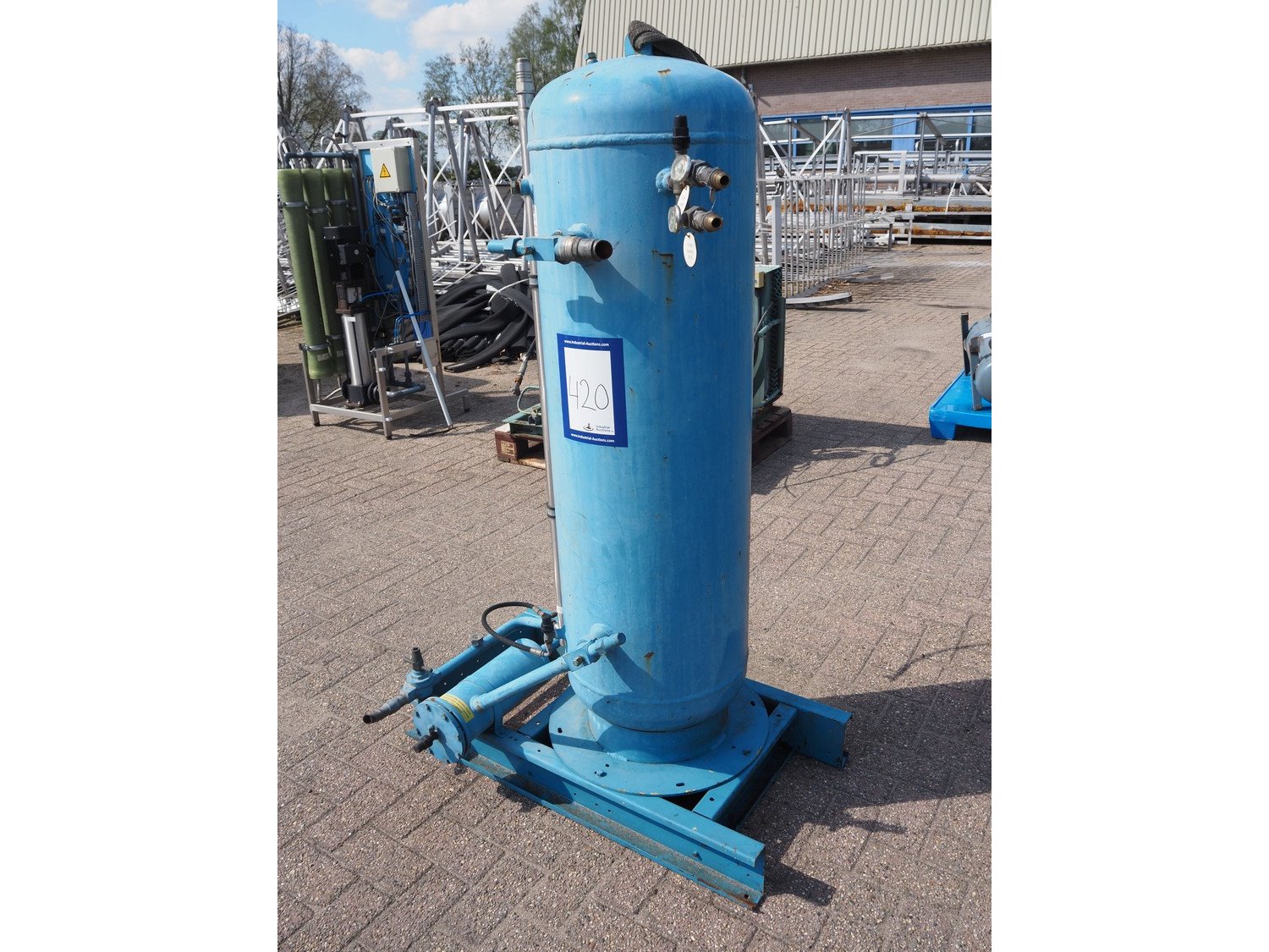 Steel pressure vessel, dimensions tank: Ø 400 mm x 1300 mm, total dimensions: 1000 mm x 750 mm x 1700 mm. Kavel locatie: Westelbeersedijk 18, 5091 SM Oost-, West- en Middelbeers, Nederland