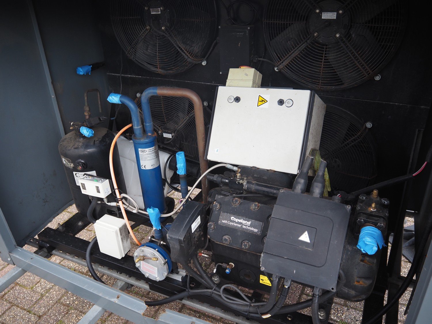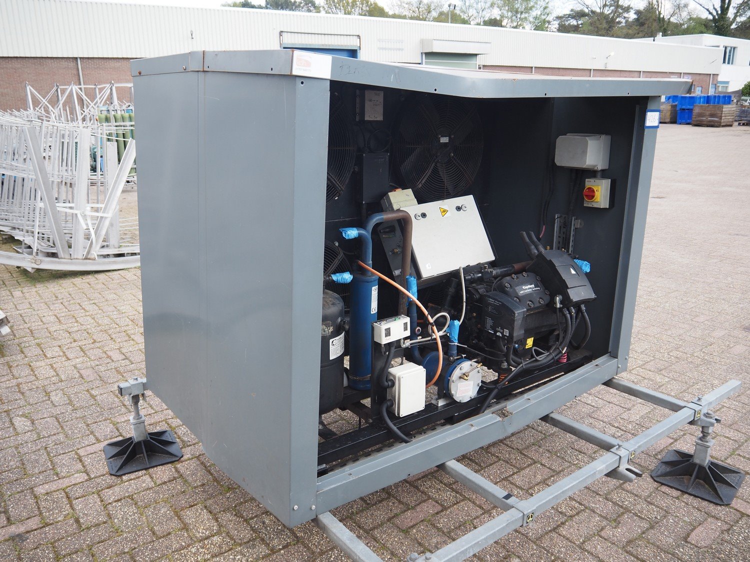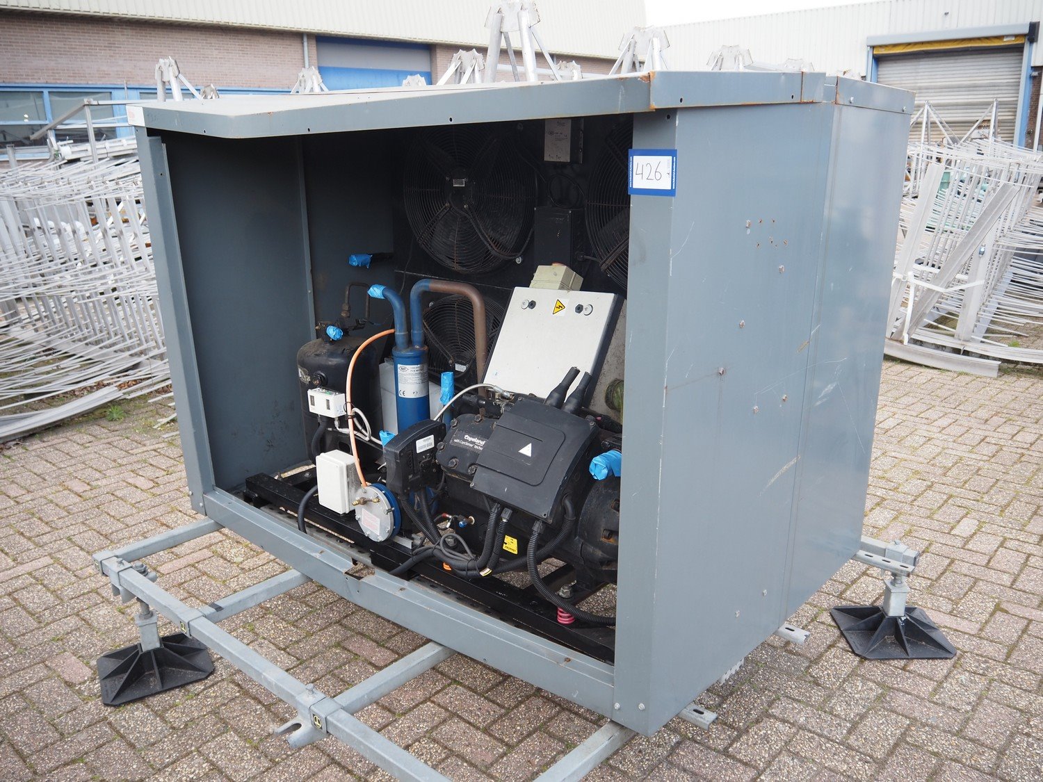 Copeland cooling/condensing unit, type: 4MAI-22x-AWM/D-D, serial number: 19S 45608 M, 440/480 V, 3 Ph, 50 Hz, capacity: 61.70 m³ per hour, dimensions: 2300 mm x 2000 mm x 1700 mm. Kavel locatie: Westelbeersedijk 18, 5091 SM Oost-, West- en Middelbeers, Nederland