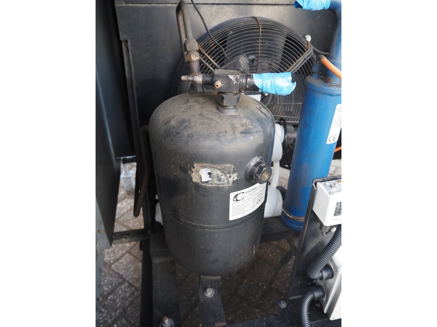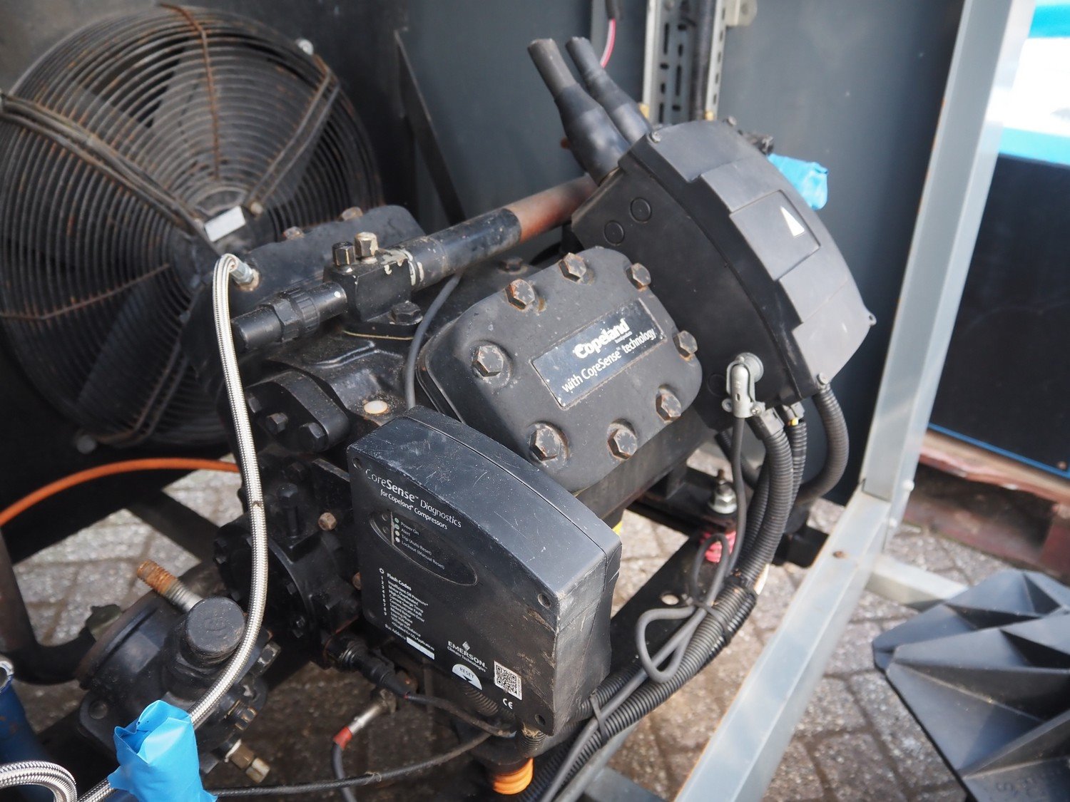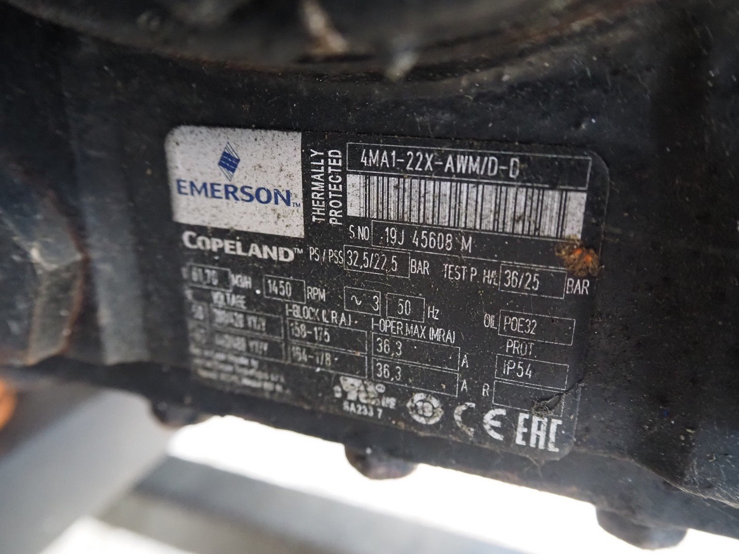 Copeland cooling/condensing unit, type: 4MAI-22x-AWM/D-D, serial number: 19S 45608 M, 440/480 V, 3 Ph, 50 Hz, capacity: 61.70 m³ per hour, dimensions: 2300 mm x 2000 mm x 1700 mm. Kavel locatie: Westelbeersedijk 18, 5091 SM Oost-, West- en Middelbeers, Nederland