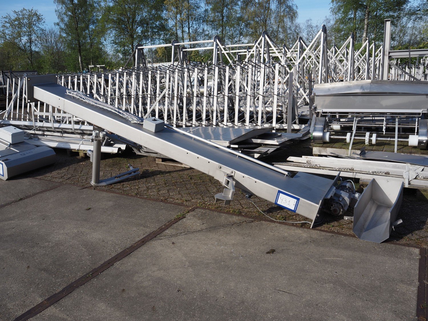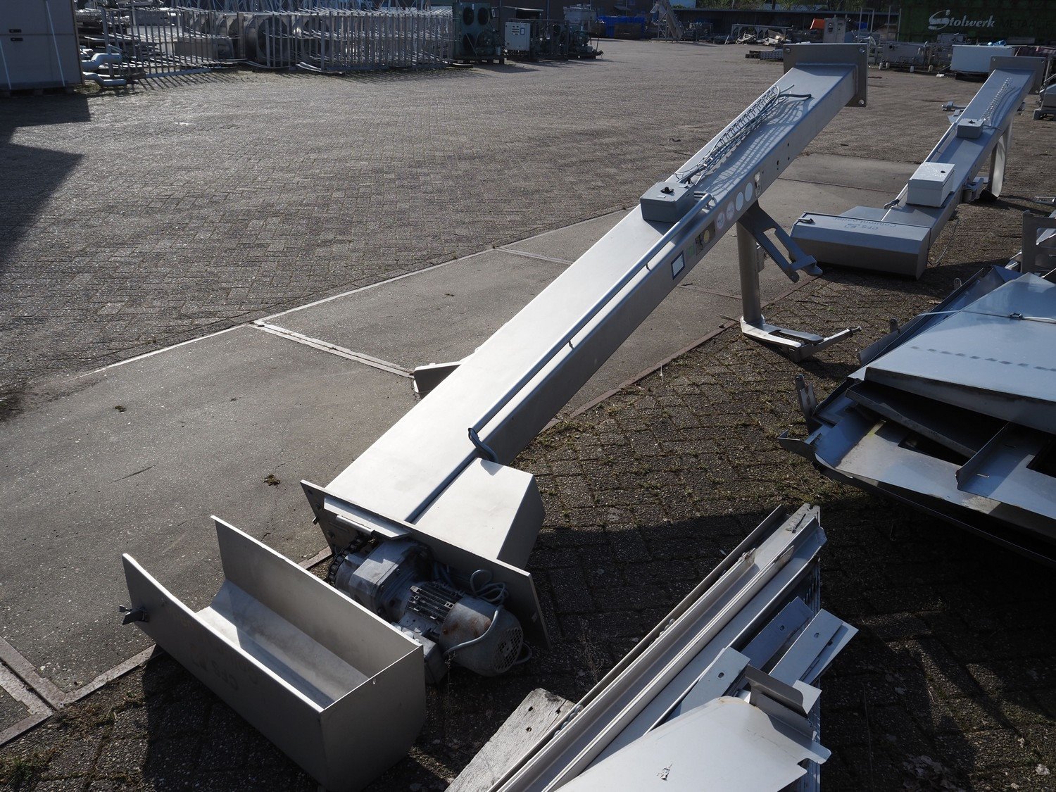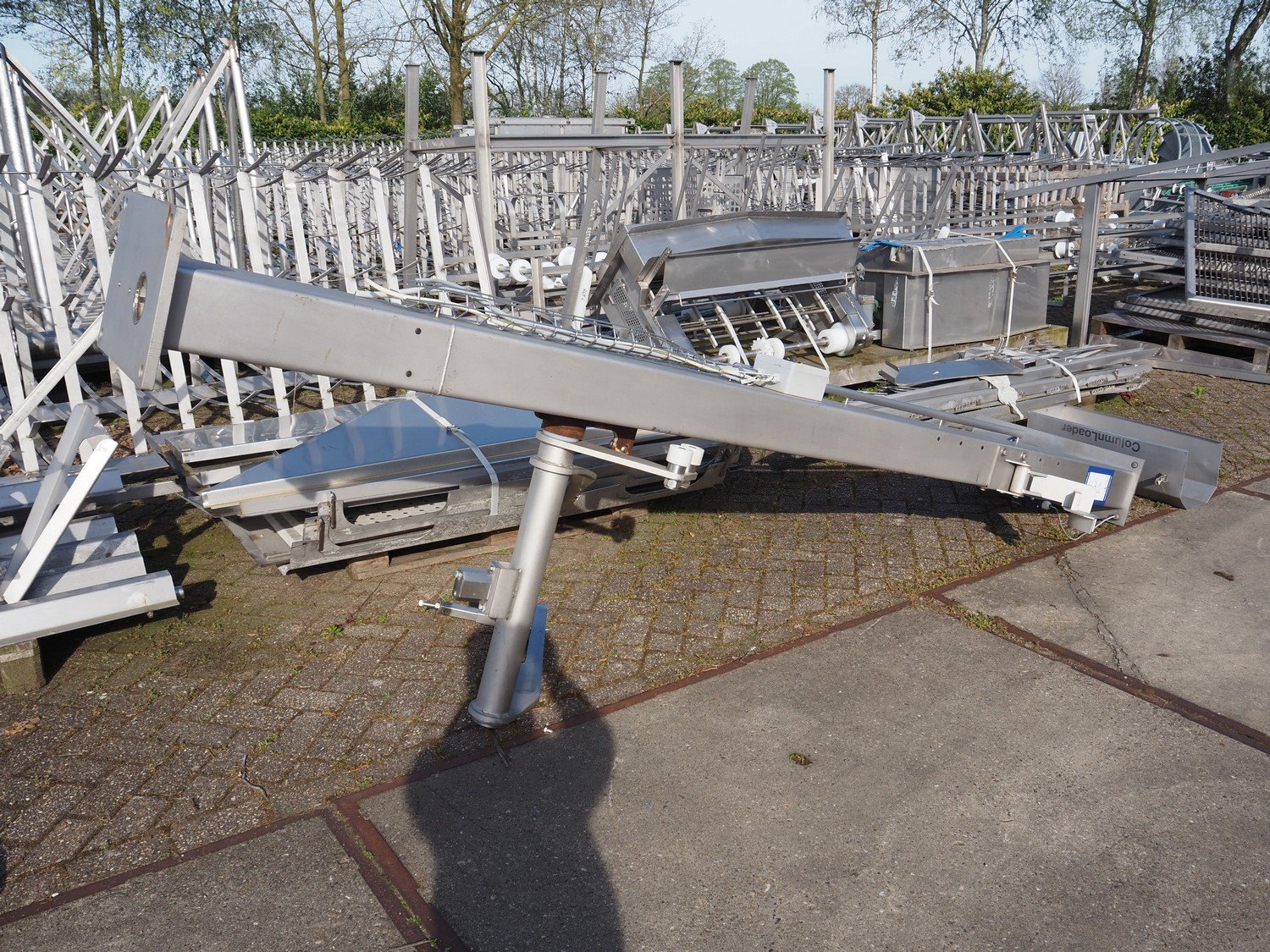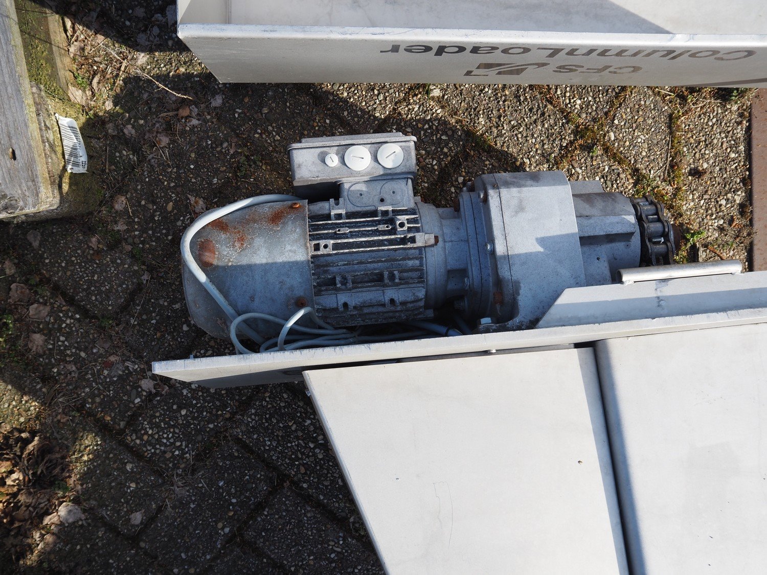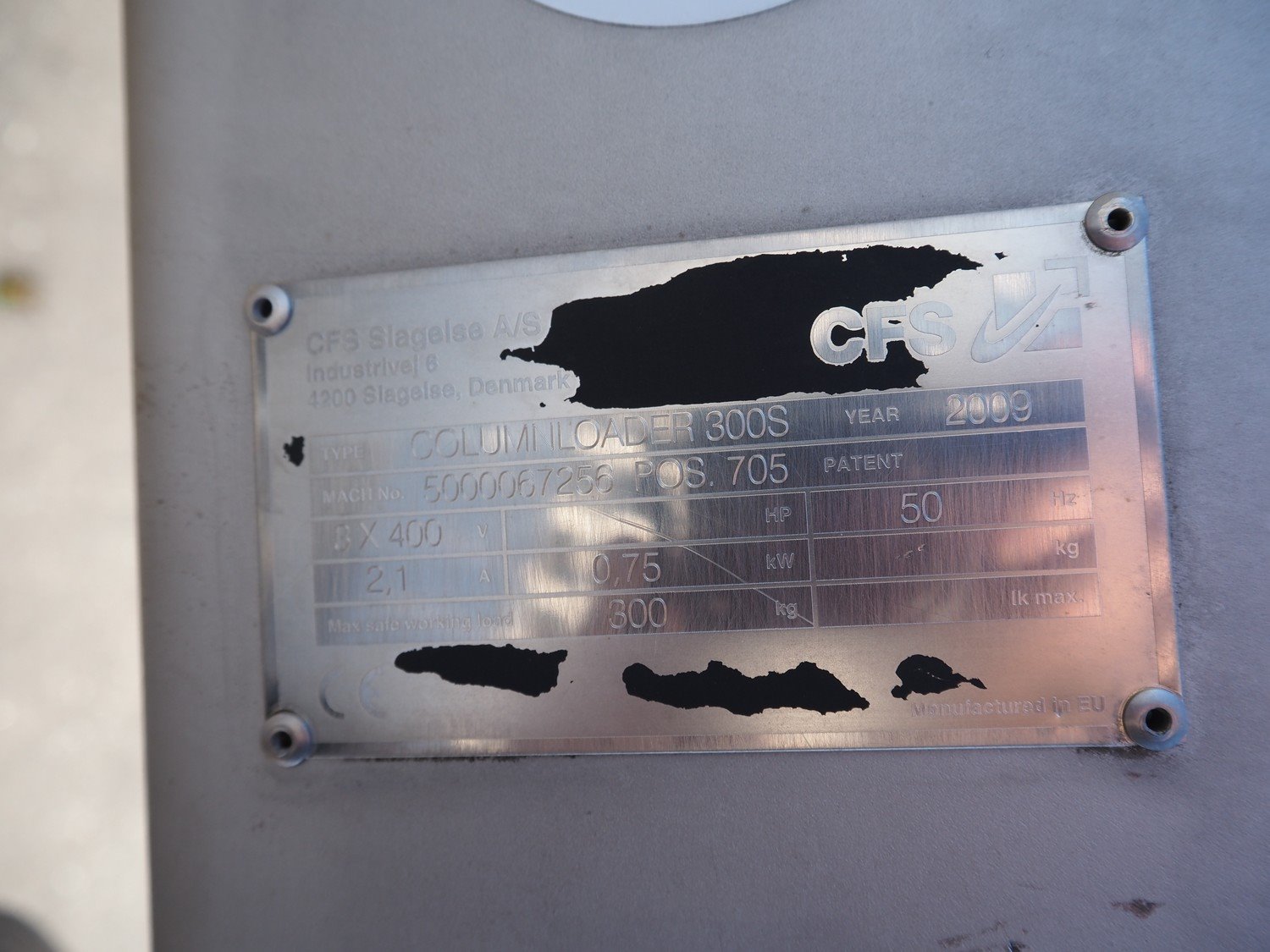 CFS s/s lifter for 200 liter meat bins, type: Columnloader 300S, serial number: 5000067256 POS. 705, year of construction: 2009, 400 V, 3 Ph, 50 Hz, 2.1 A, 0.75 kW, capacity: 300 kg, lifting height: 2400 mm, total dimensions: 1130 mm x 660 mm x 3700 mm. Damaged. Kavel locatie: Westelbeersedijk 18, 5091 SM Oost-, West- en Middelbeers, Nederland
