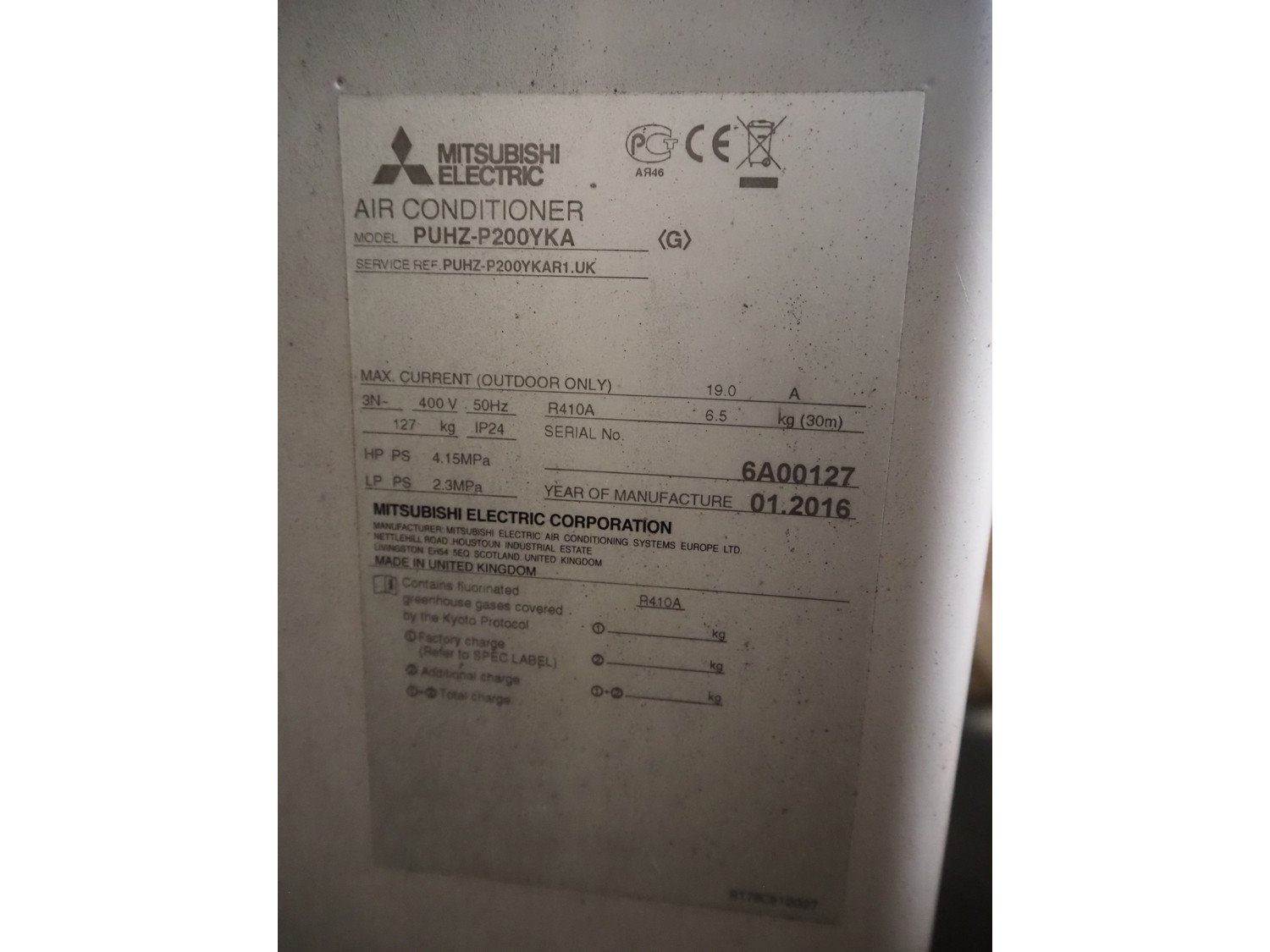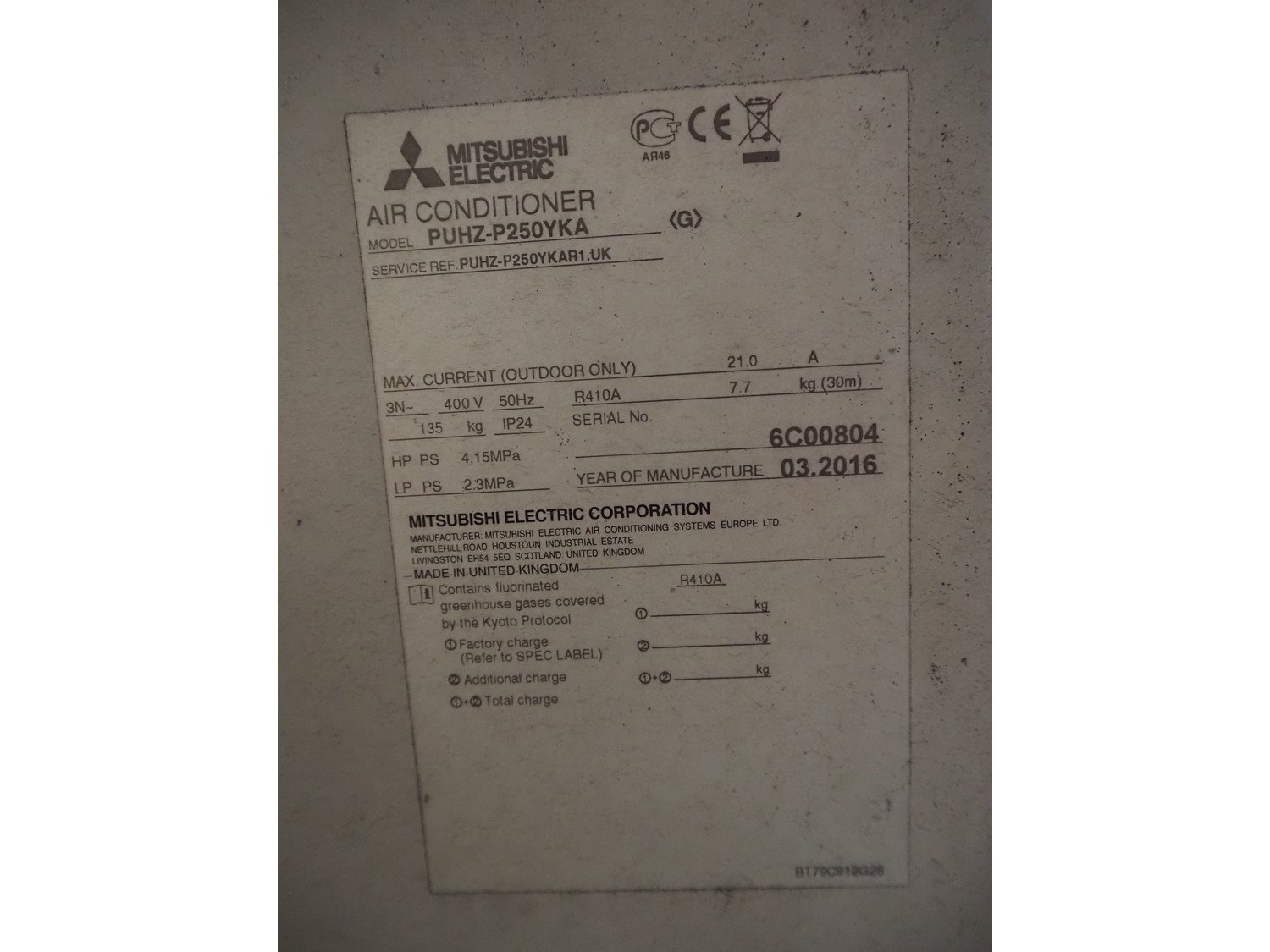 2 Mitsubishi air conditioners, model Mitsubishi air conditioner: (1x) PUHZ-P250YKA, serial number: 6C00804, year of construction: 03-2016, 400 V, 3 Ph, 50 Hz, 21 A, refrigerant: R110a, 7.7 kg, weight: 135 kg, (1x) PUHZ P200127, serial number: 6A00127, year of construction: 01-2016, 400 V, 3 Ph, 50 Hz, 19 A, refrigerant: R410a, 6.5 kg, weight: 127 kg, dimensions ventilator: 3850 mm x 1750 mm x 1780 mm, dimensions air conditioners: (2x) 1050 mm x 400 mm x 1350 mm. Kavel locatie: Westelbeersedijk 18, 5091 SM Oost-, West- en Middelbeers, Nederland