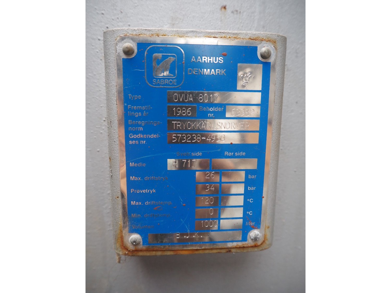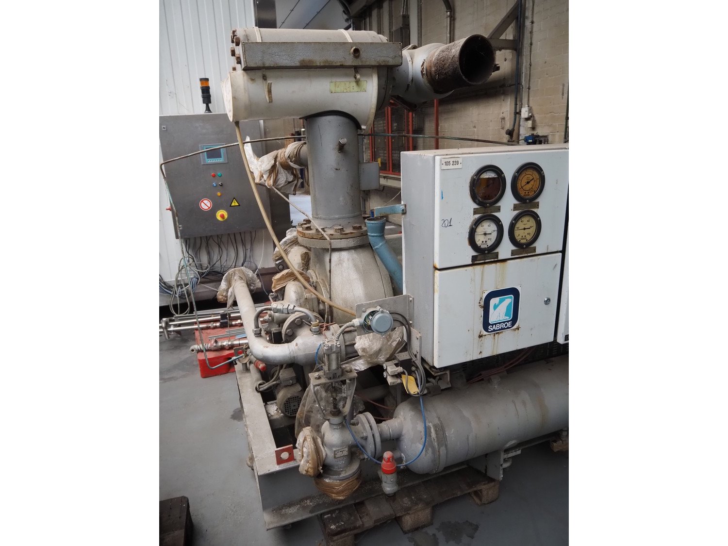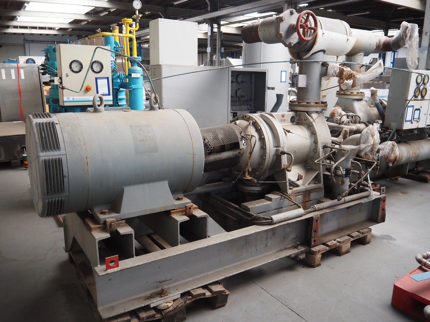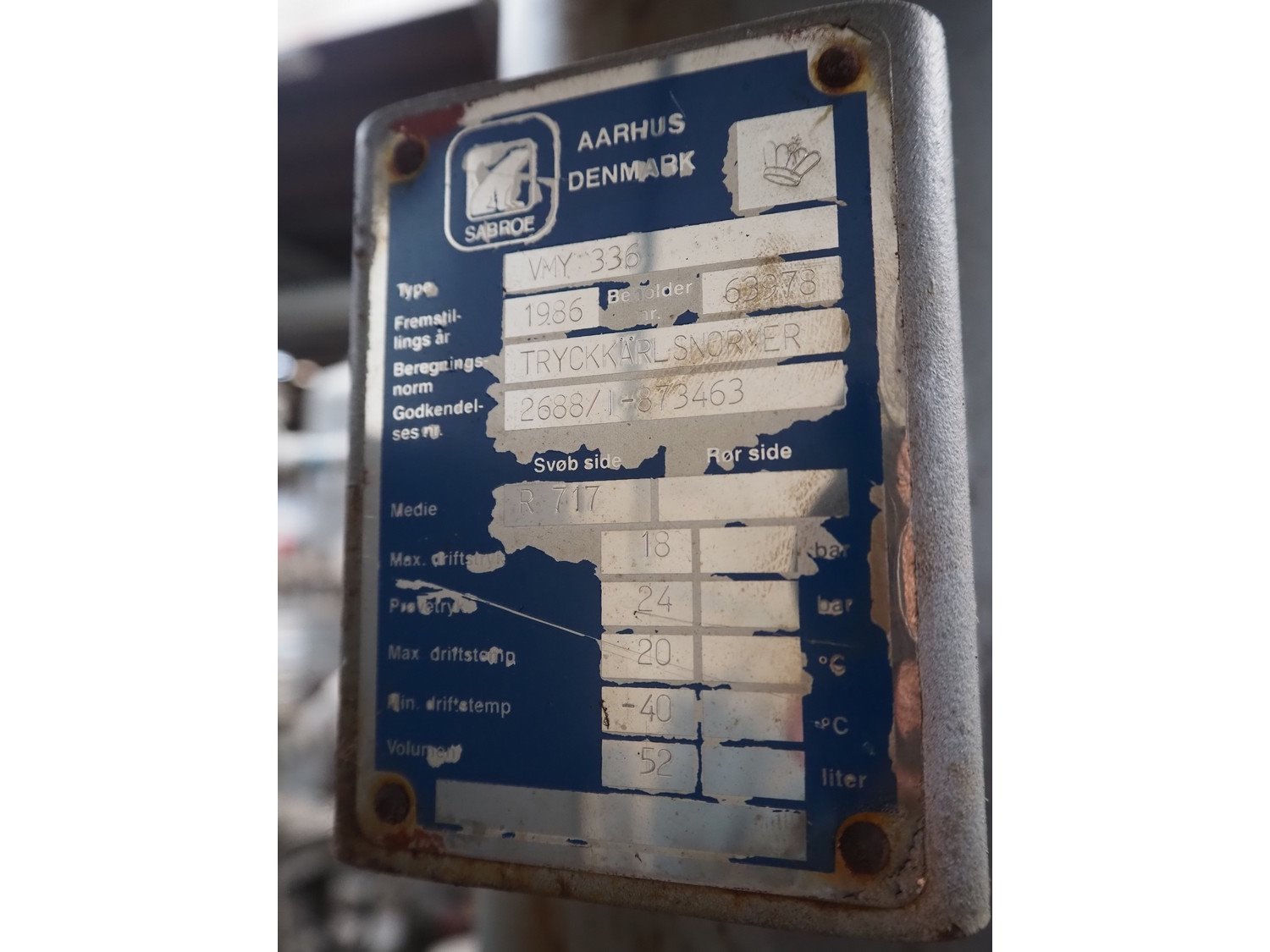 Sabroe screw cooling compressor, type: VMY 336, serial number: 268811-873463, year of construction: 1986, refrigerant: R717, minimum temperature: -40 °C, maximum temperature: 20 °C, with Sabroe refrigerant tank, type: OVUA 8017, serial number: 573238-4950, year of construction: 1986, volume: 1000 liter, dimensions compressor: 3000 mm x 1450 mm x 2100 mm, dimensions tank: 1150 mm x 1100 mm x 2500 mm. Kavel locatie: Westelbeersedijk 18, 5091 SM Oost-, West- en Middelbeers, Nederland