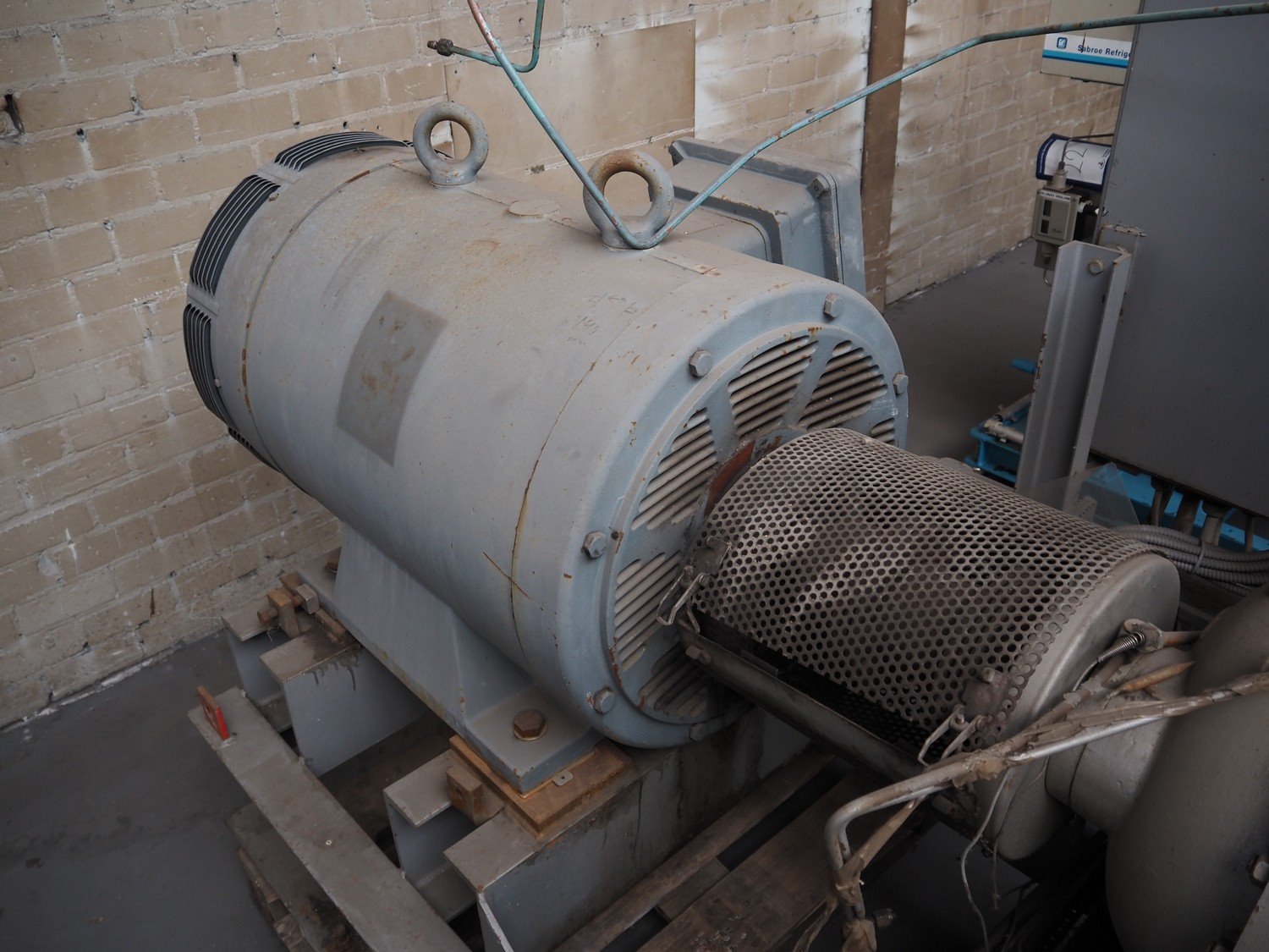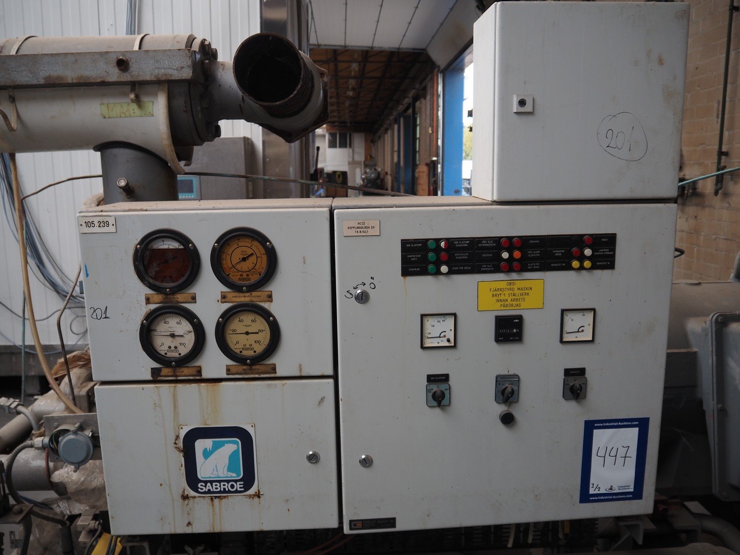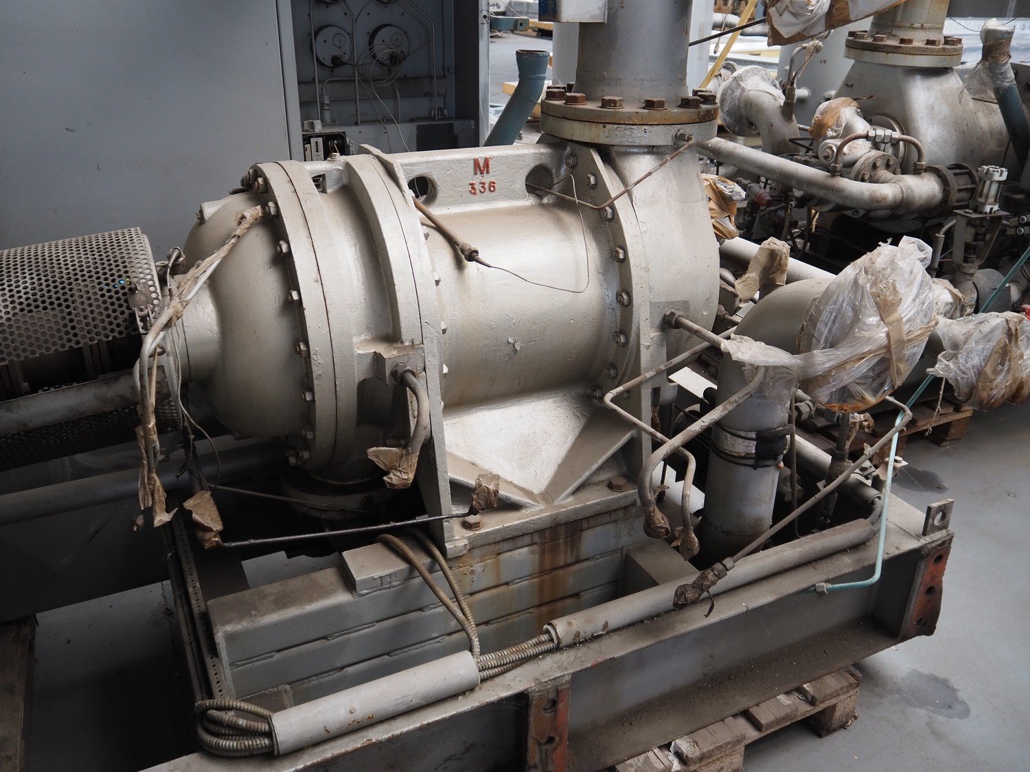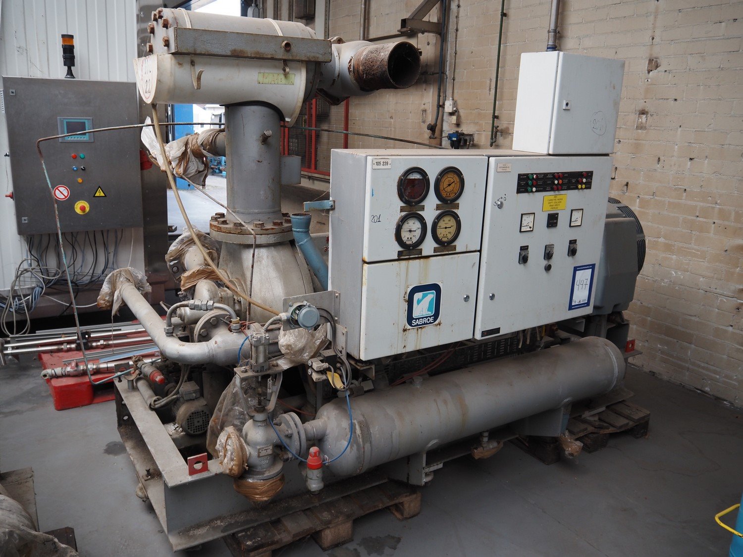 Sabroe screw cooling compressor, type: VMY 336, serial number: 268811-873463, year of construction: 1986, refrigerant: R717, minimum temperature: -40 °C, maximum temperature: 20 °C, with Sabroe refrigerant tank, type: OVUA 8017, serial number: 573238-4950, year of construction: 1986, volume: 1000 liter, dimensions compressor: 3000 mm x 1450 mm x 2100 mm, dimensions tank: 1150 mm x 1100 mm x 2500 mm. Kavel locatie: Westelbeersedijk 18, 5091 SM Oost-, West- en Middelbeers, Nederland