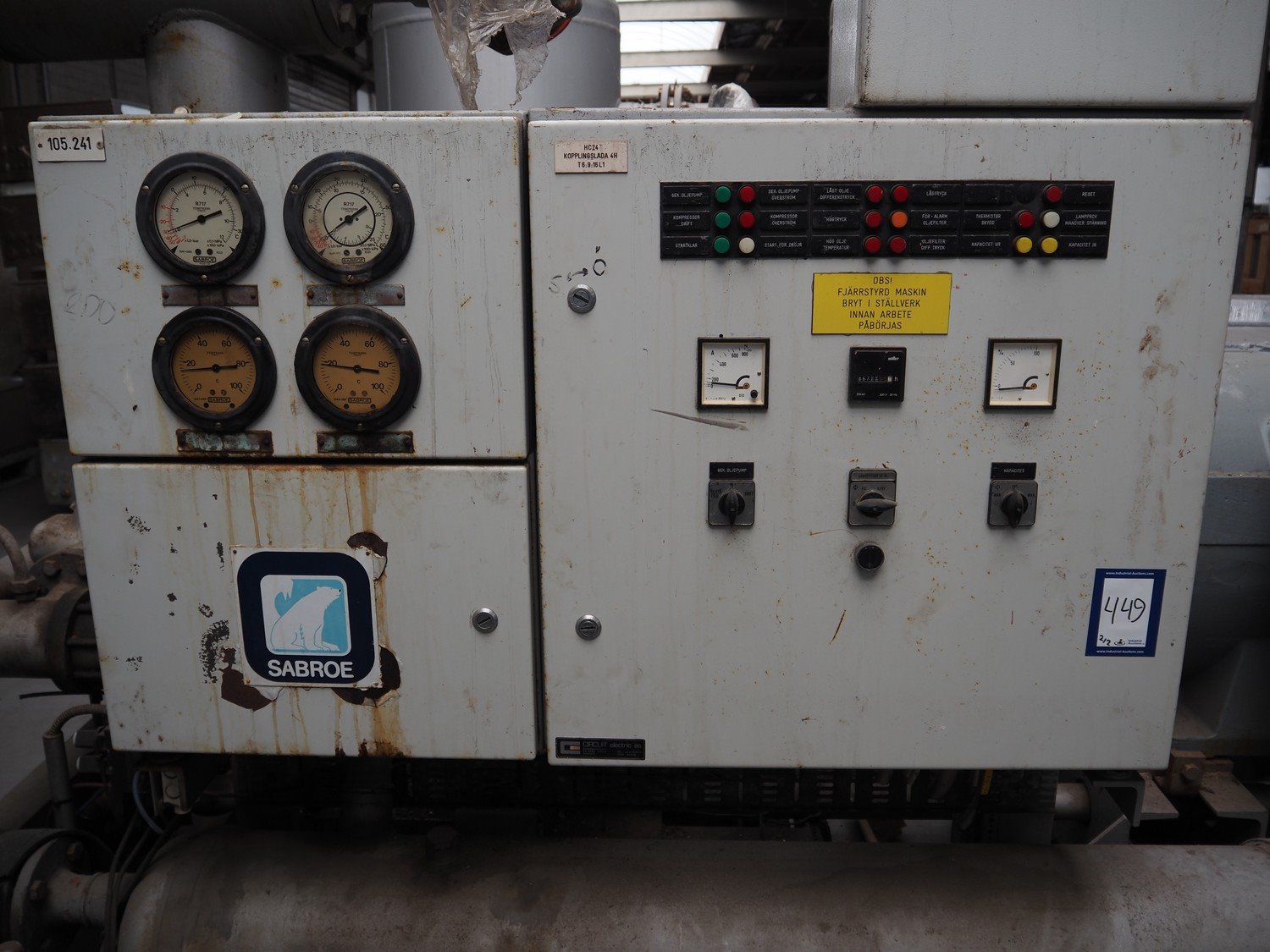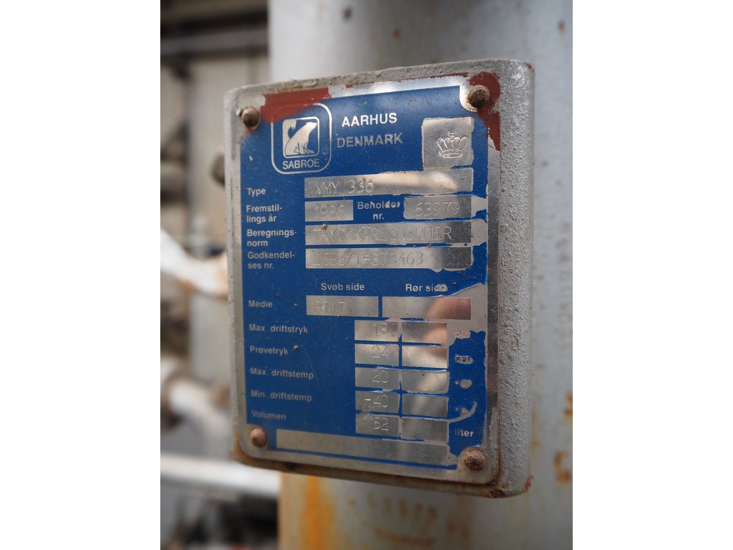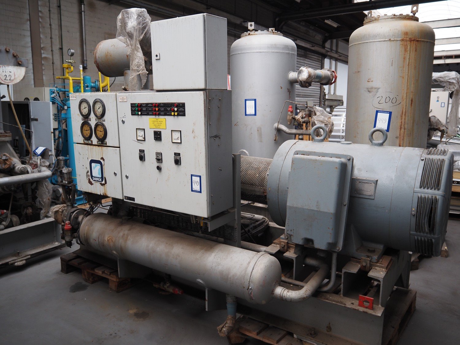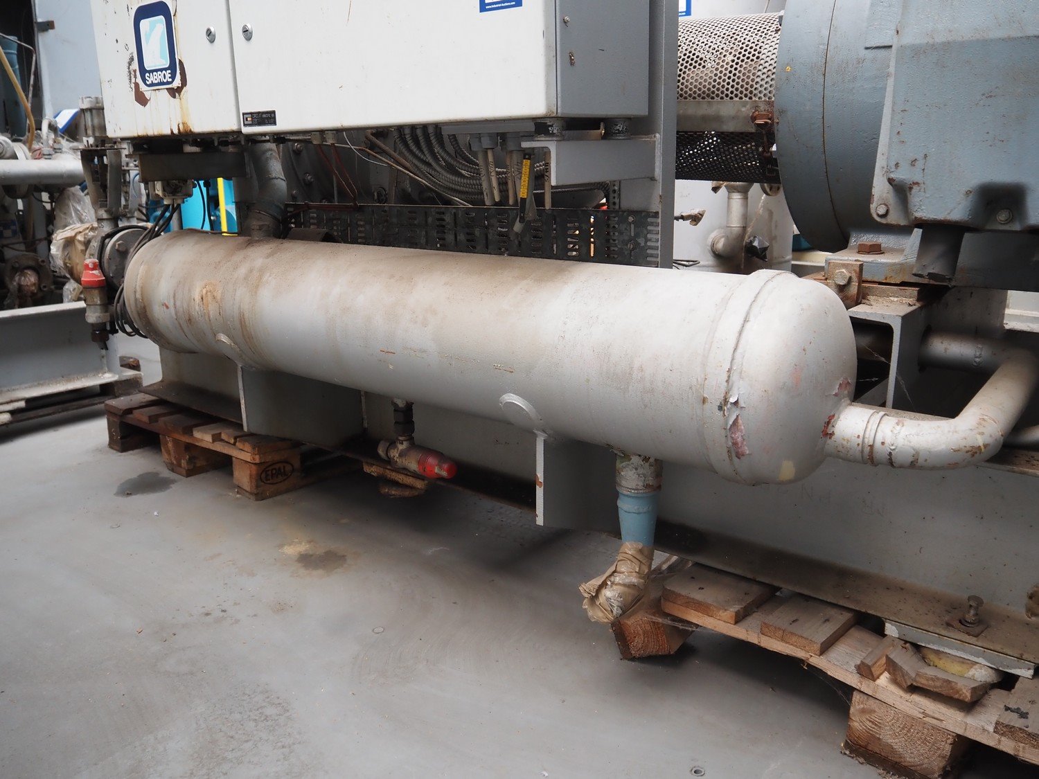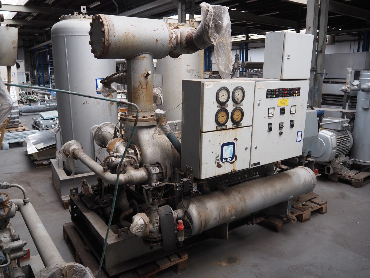 Sabroe screw cooling compressor, type: VMY 336, serial number: 268811-873463, year of construction: 1986, refrigerant: R717, minimum temperature: -40 °C, maximum temperature: 20 °C, with Sabroe refrigerant tank, type: OVUA 8017, serial number: 573238-4950, year of construction: 1986, volume: 1000 liter, dimensions compressor: 3000 mm x 1450 mm x 2100 mm, dimensions tank: 1150 mm x 1100 mm x 2500 mm. Kavel locatie: Westelbeersedijk 18, 5091 SM Oost-, West- en Middelbeers, Nederland