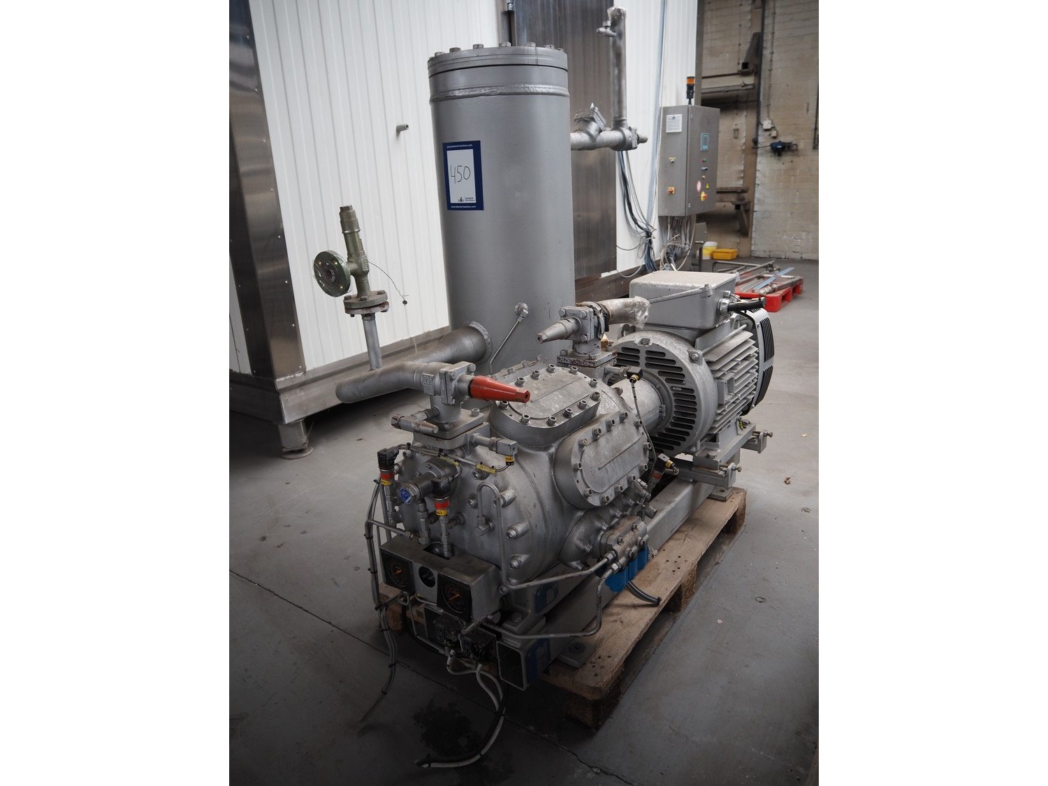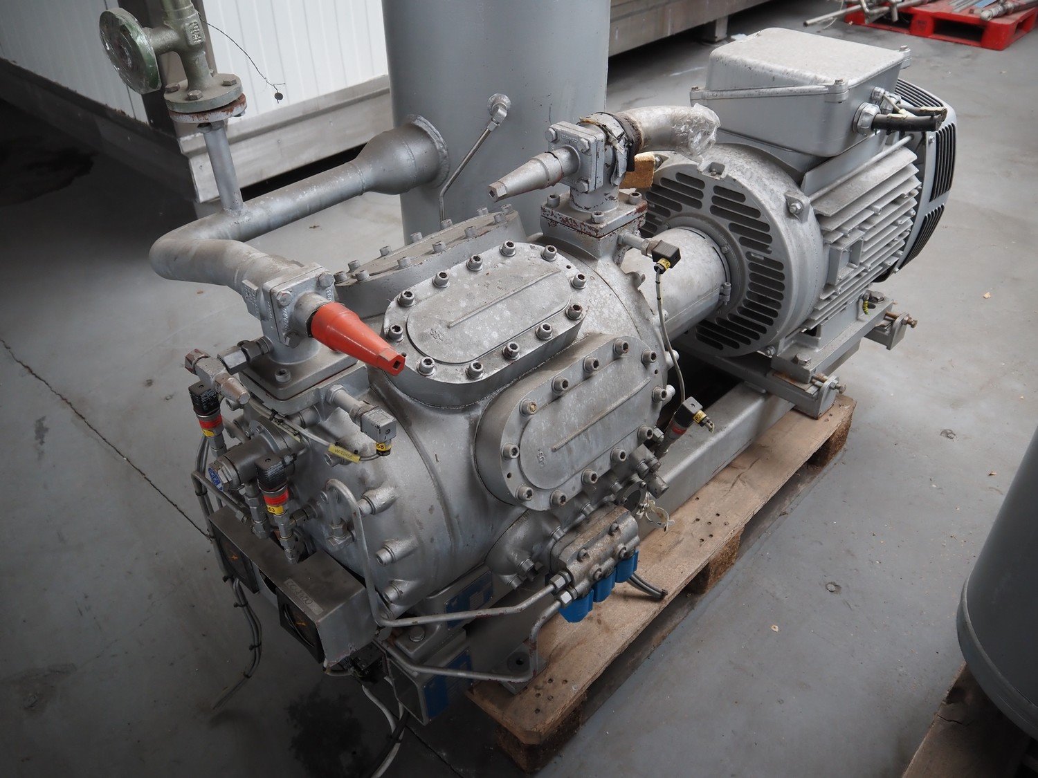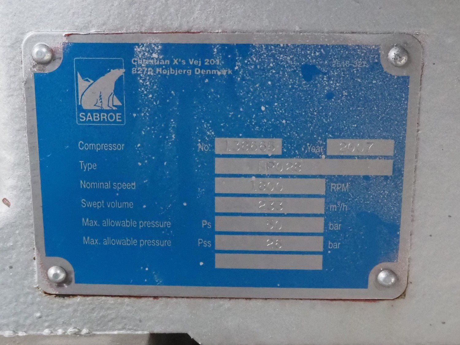 Sabroe high pressure reciprocating compressor, type: HP028, serial number: 138664, year of construction: 2007, volume: 233 m³ per hour, fluid group: R744, maximum pressure: 26/49 bar, maximum temperature: -60/43 and -10/170° Celsius, Leroy Somer motor, type: PLS250MP-T, 90-103 kW, Johnson Controls Systems pressure vessel, type: OVUR 4113 D, year of construction: 2007, dimensions: 2000 mm x 1000 mm x 1600 mm. Kavel locatie: Westelbeersedijk 18, 5091 SM Oost-, West- en Middelbeers, Nederland