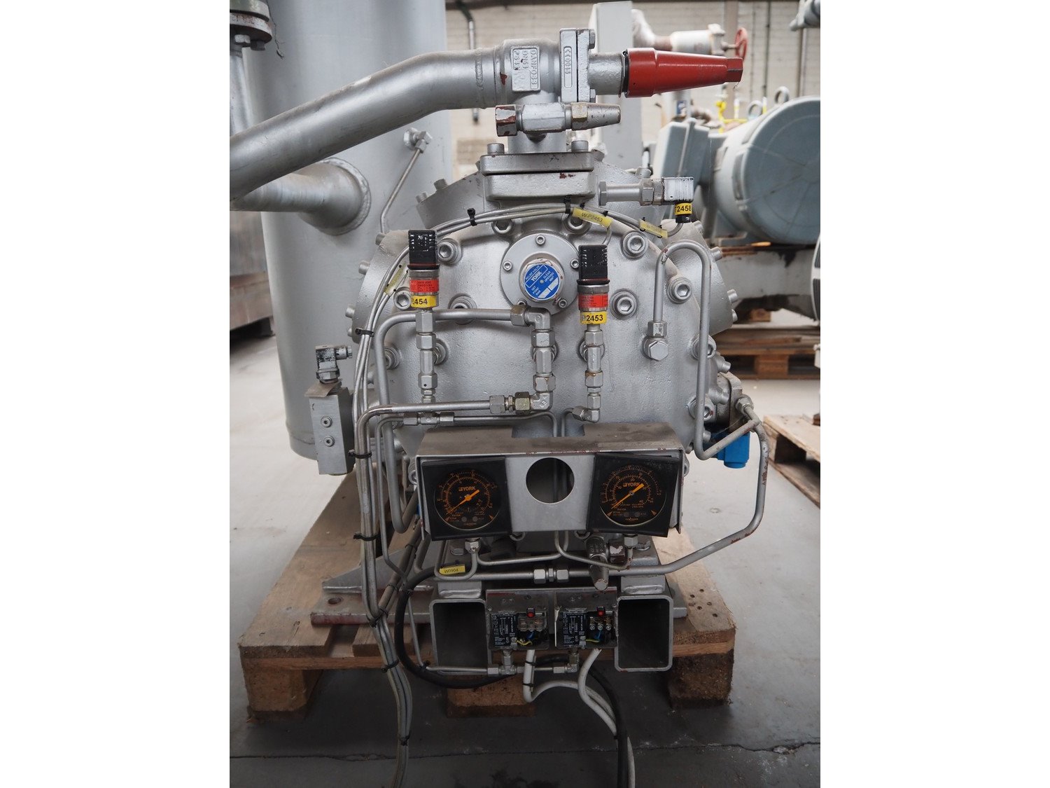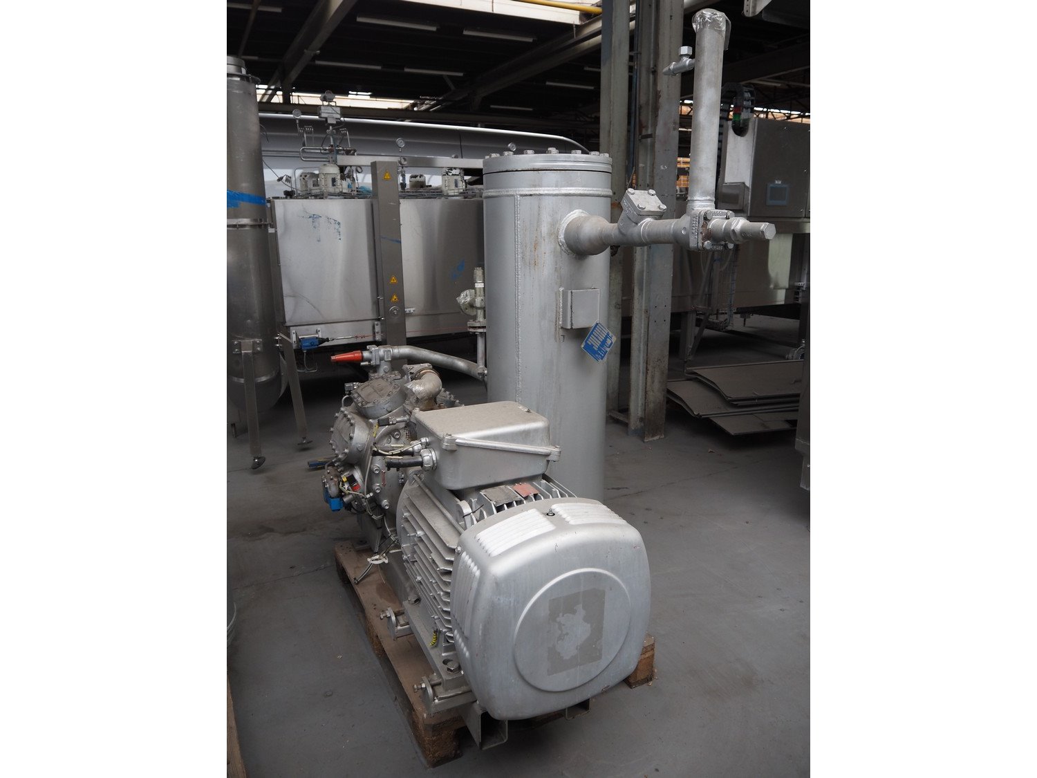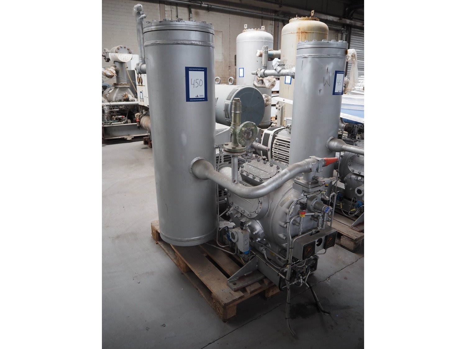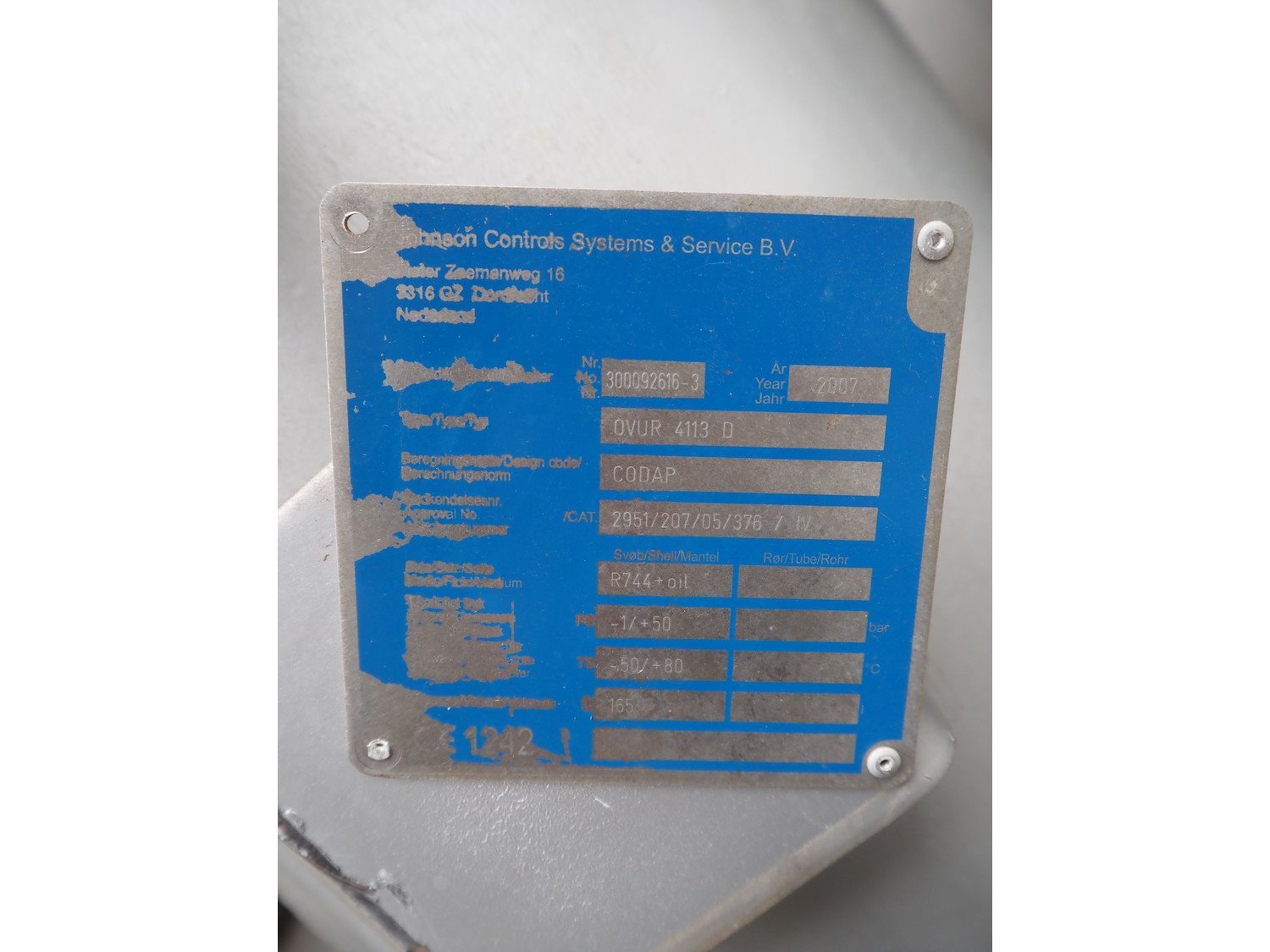 Sabroe high pressure reciprocating compressor, type: HP028, serial number: 138664, year of construction: 2007, volume: 233 m³ per hour, fluid group: R744, maximum pressure: 26/49 bar, maximum temperature: -60/43 and -10/170° Celsius, Leroy Somer motor, type: PLS250MP-T, 90-103 kW, Johnson Controls Systems pressure vessel, type: OVUR 4113 D, year of construction: 2007, dimensions: 2000 mm x 1000 mm x 1600 mm. Kavel locatie: Westelbeersedijk 18, 5091 SM Oost-, West- en Middelbeers, Nederland