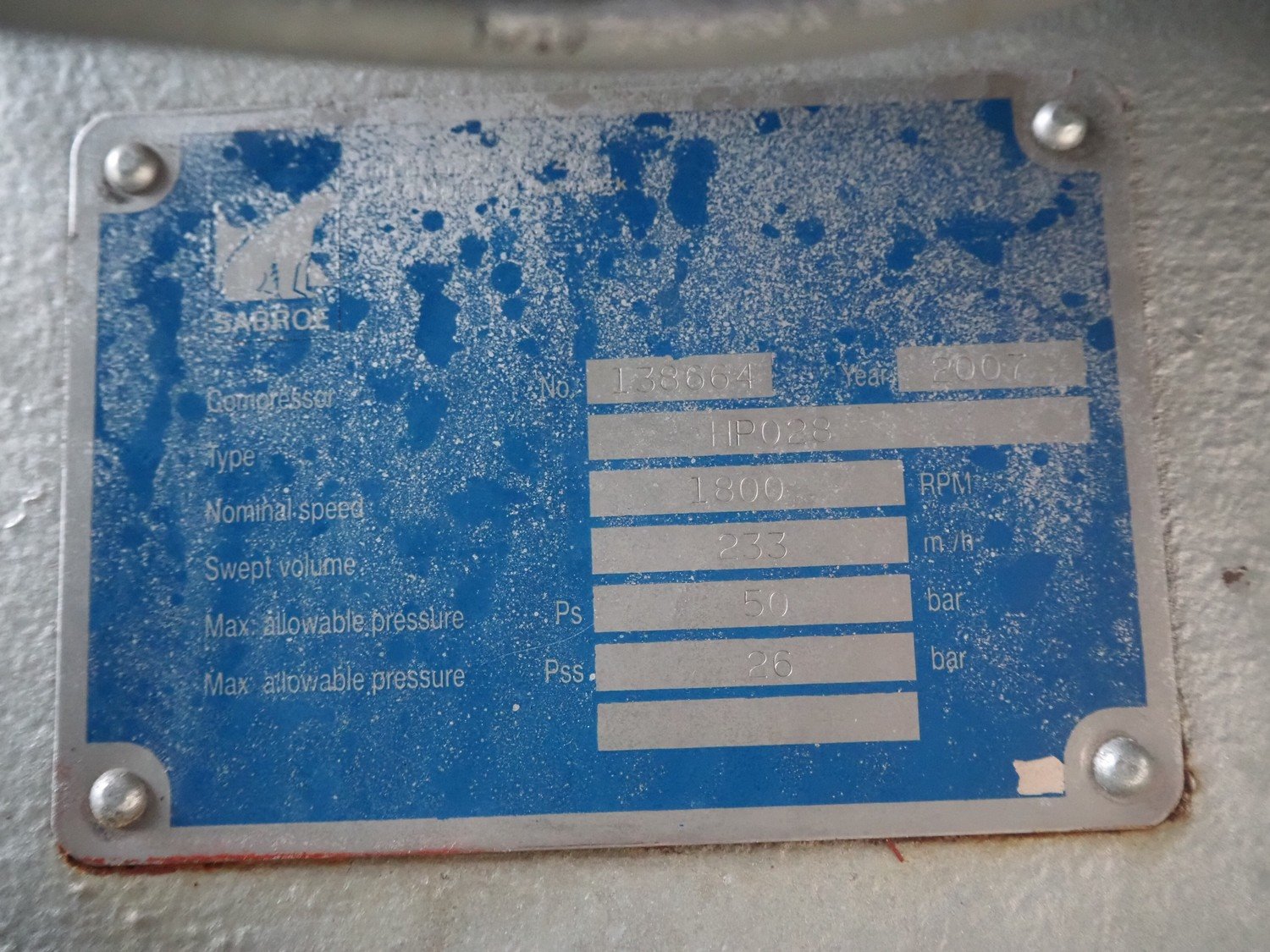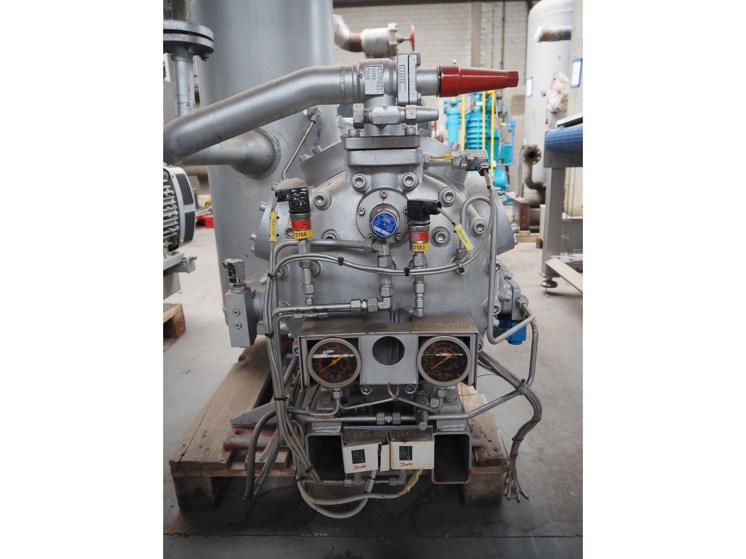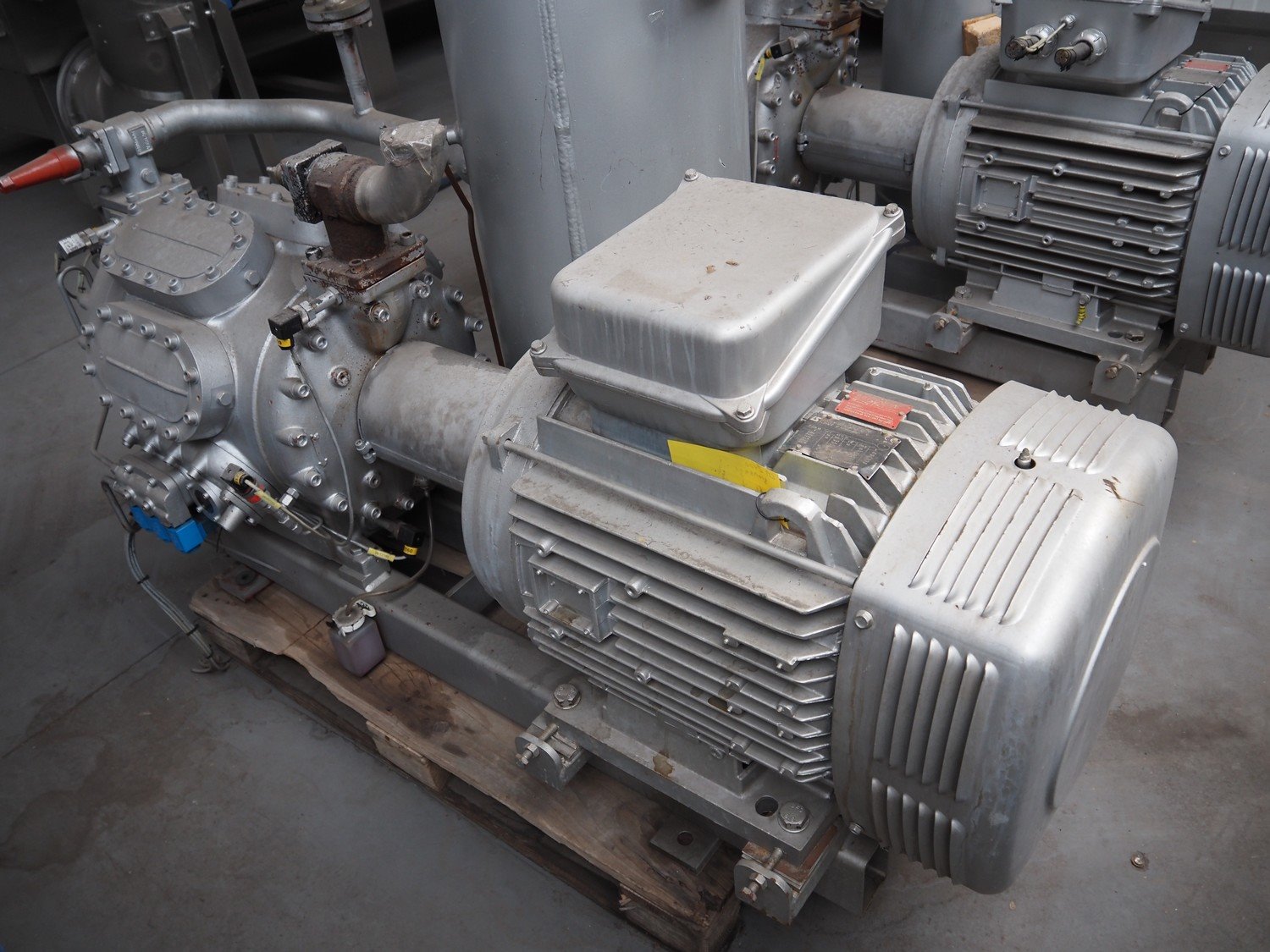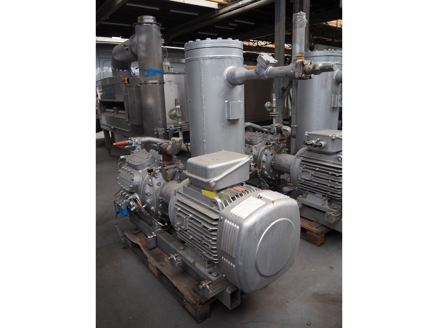 Sabroe high pressure reciprocating compressor, type: HP028, serial number: 138664, year of construction: 2007, volume: 233 m³ per hour, fluid group: R744, maximum pressure: 26/49 bar, maximum temperature: -60/43 and -10/170° Celsius, Leroy Somer motor, type: PLS250MP-T, 90-103 kW, Johnson Controls Systems pressure vessel, type: OVUR 4113 D, year of construction: 2007, dimensions: 2000 mm x 1000 mm x 1600 mm. Kavel locatie: Westelbeersedijk 18, 5091 SM Oost-, West- en Middelbeers, Nederland