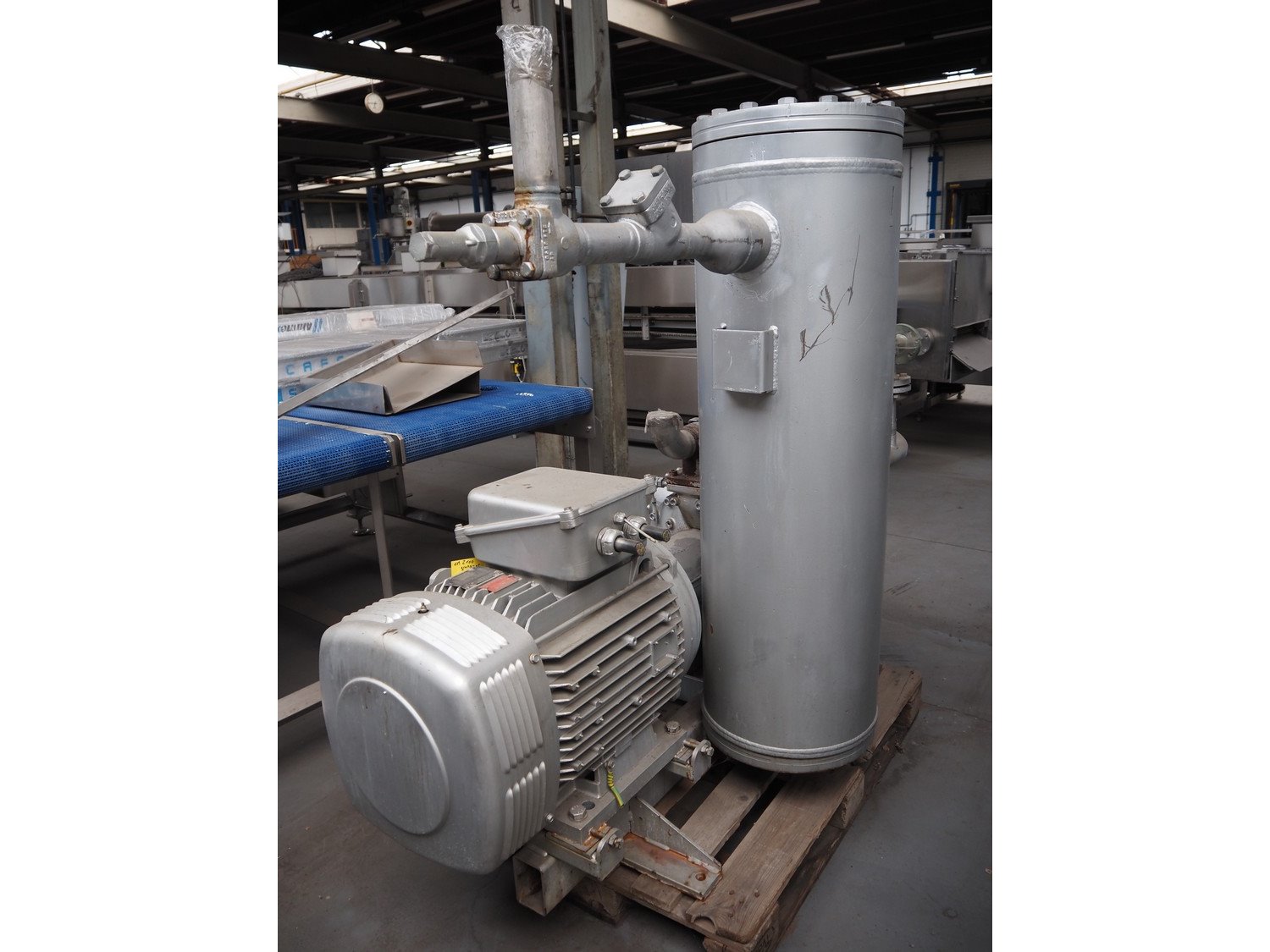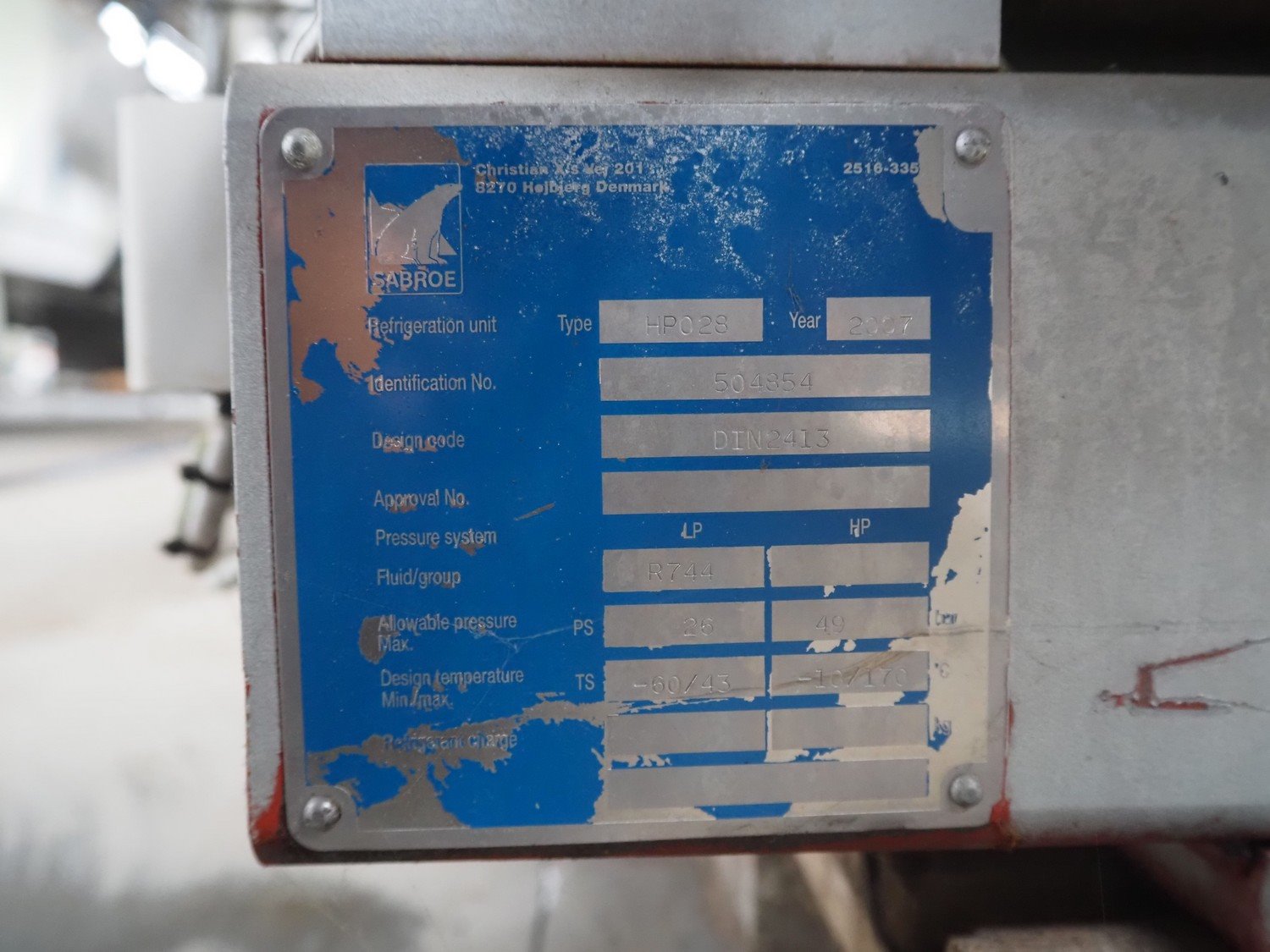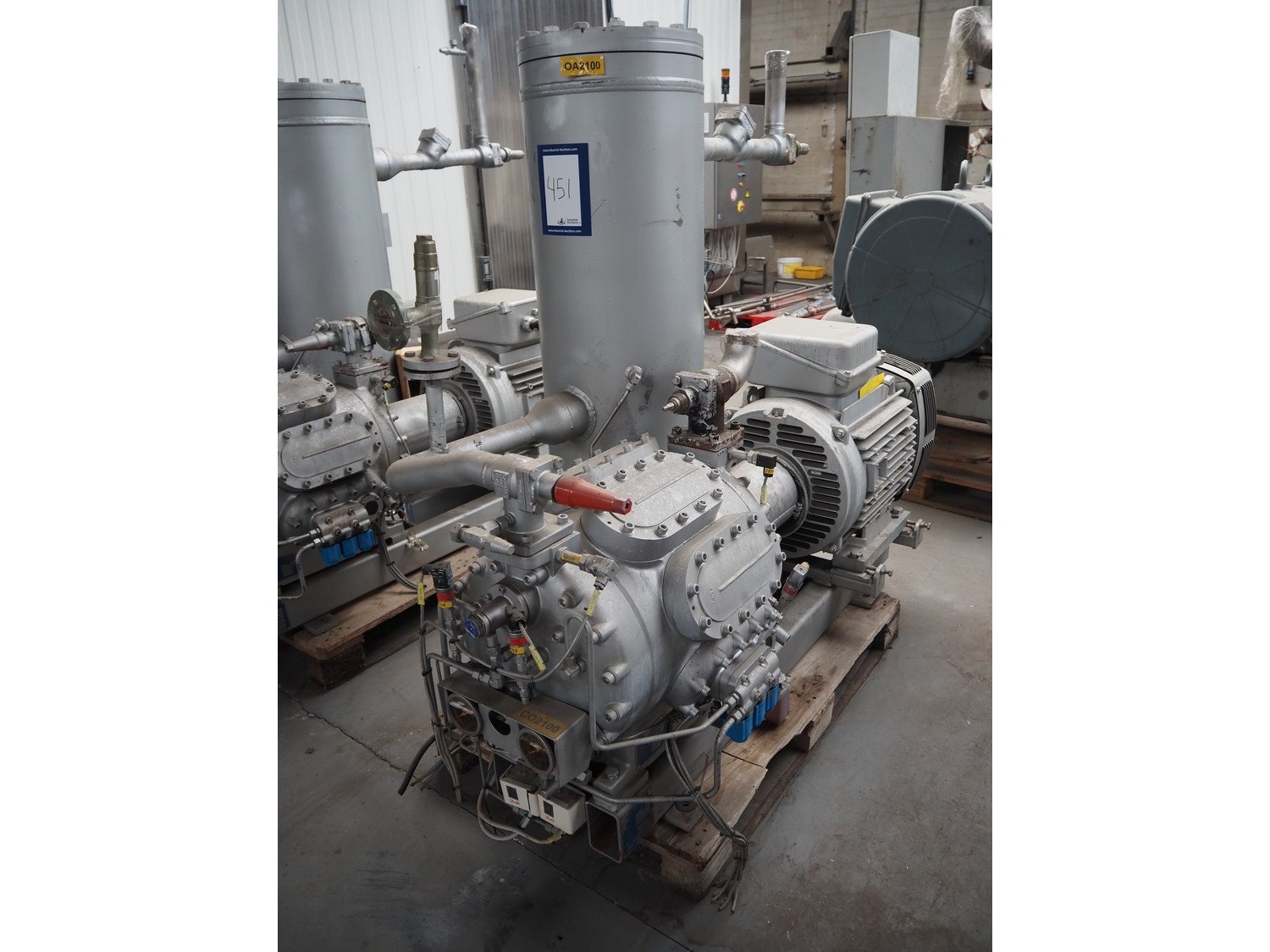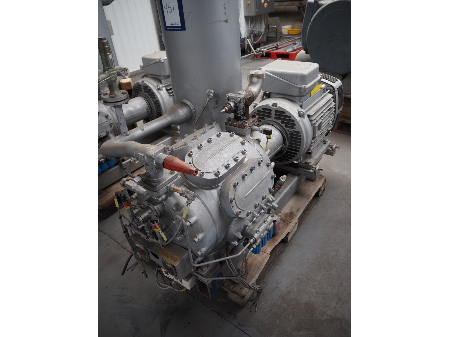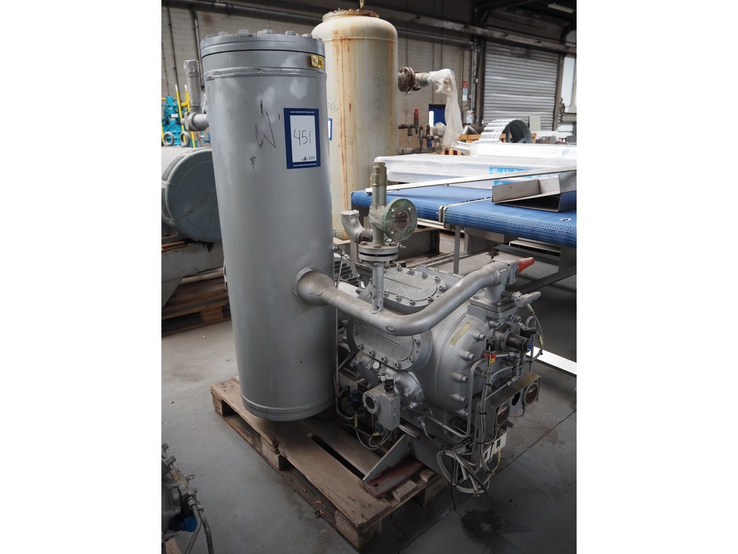 Sabroe high pressure reciprocating compressor, type: HP028, serial number: 138664, year of construction: 2007, volume: 233 m³ per hour, fluid group: R744, maximum pressure: 26/49 bar, maximum temperature: -60/43 and -10/170° Celsius, Leroy Somer motor, type: PLS250MP-T, 90-103 kW, Johnson Controls Systems pressure vessel, type: OVUR 4113 D, year of construction: 2007, dimensions: 2000 mm x 1000 mm x 1600 mm. Kavel locatie: Westelbeersedijk 18, 5091 SM Oost-, West- en Middelbeers, Nederland