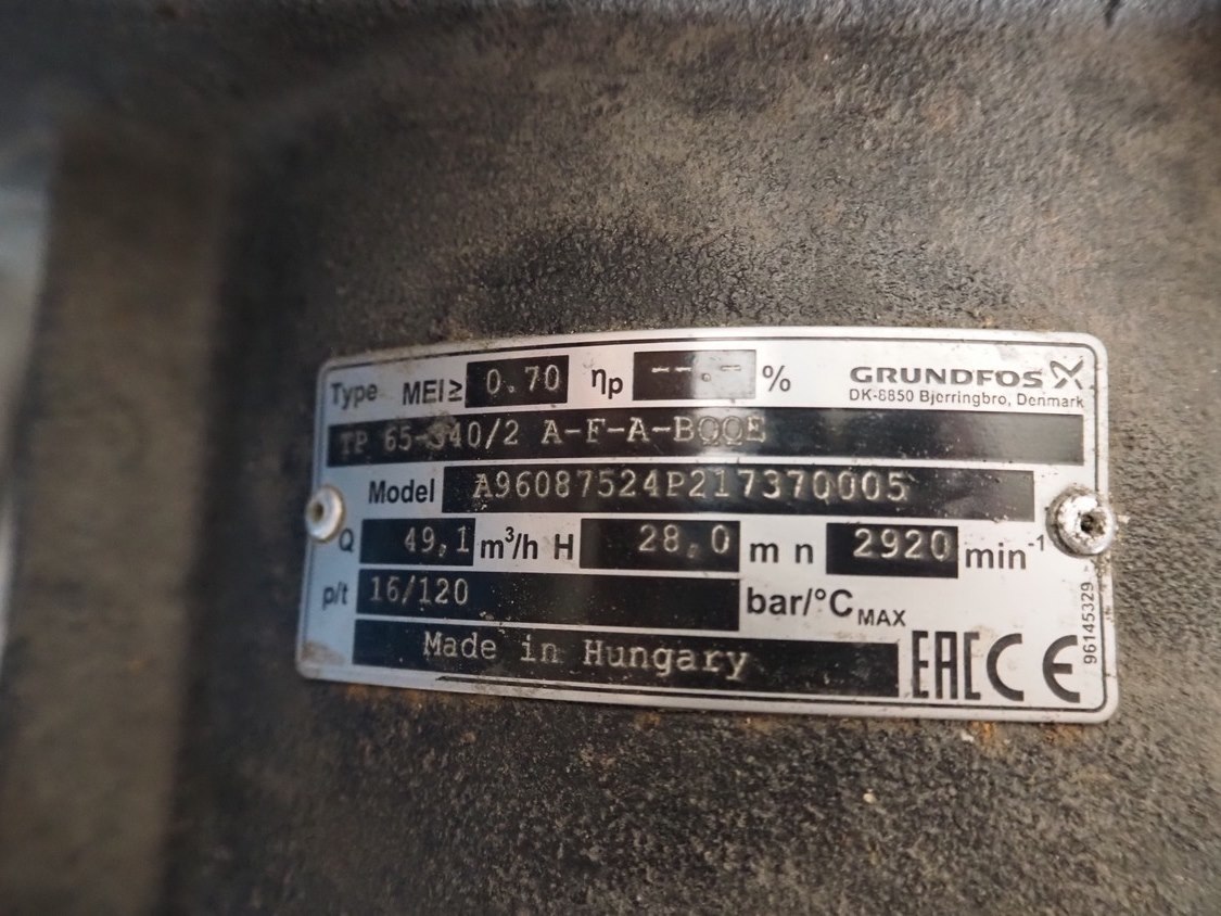 Grundfos centrifugal pump, type: 65-340/2 A-F-A-QQE, model: A96087524P217370005, Q: 49.1 m³/h, dimensions: 750 mm x 250 mm x 950 mm, total dimensions: 1250 mm x 450 mm x 1100 mm. Kavel locatie: Westelbeersedijk 18, 5091 SM Oost-, West- en Middelbeers, Nederland