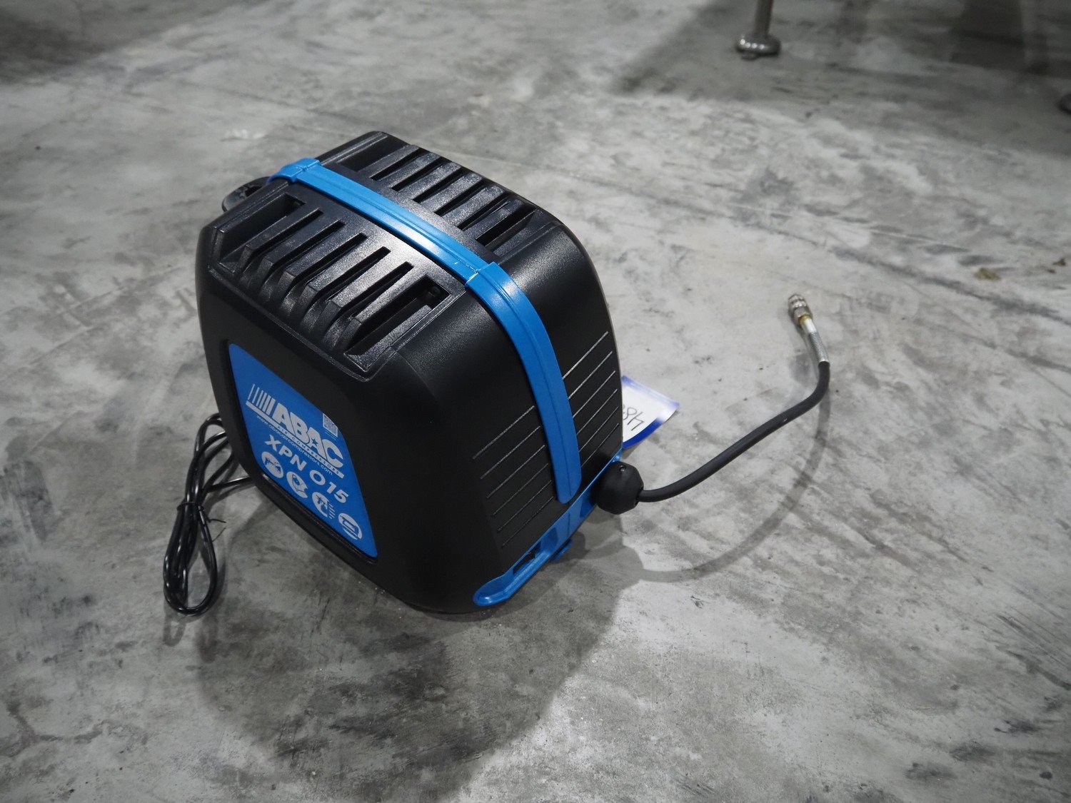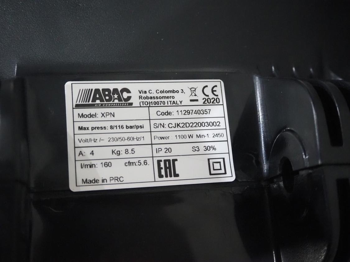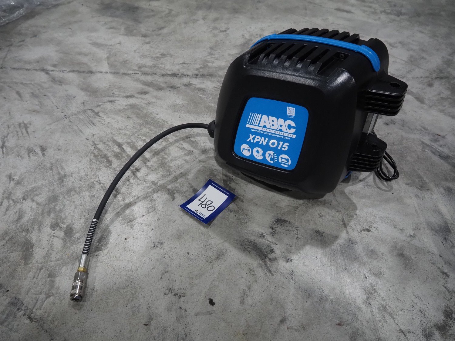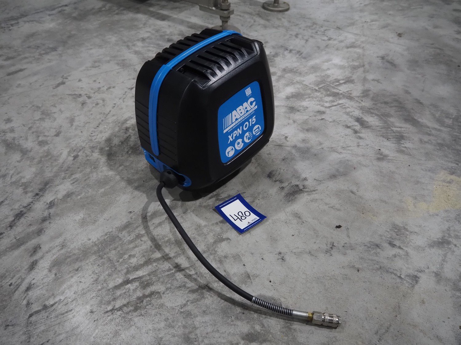ABAC air compressors with hose reel, model: XPN, 230 V, 1 Ph, 50/60 Hz, 1100 W, weight: 8.5 kg, total dimensions: 400 mm x 250 mm x 300 mm. Kavel locatie: Langereijt 29A, 5091 JP Middelbeers, Nederland