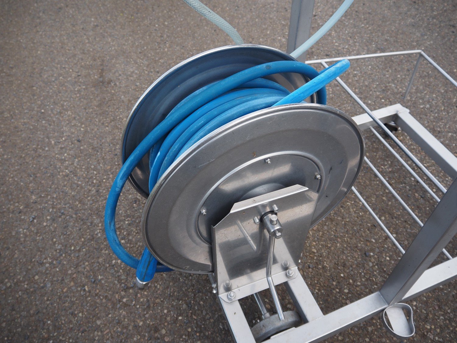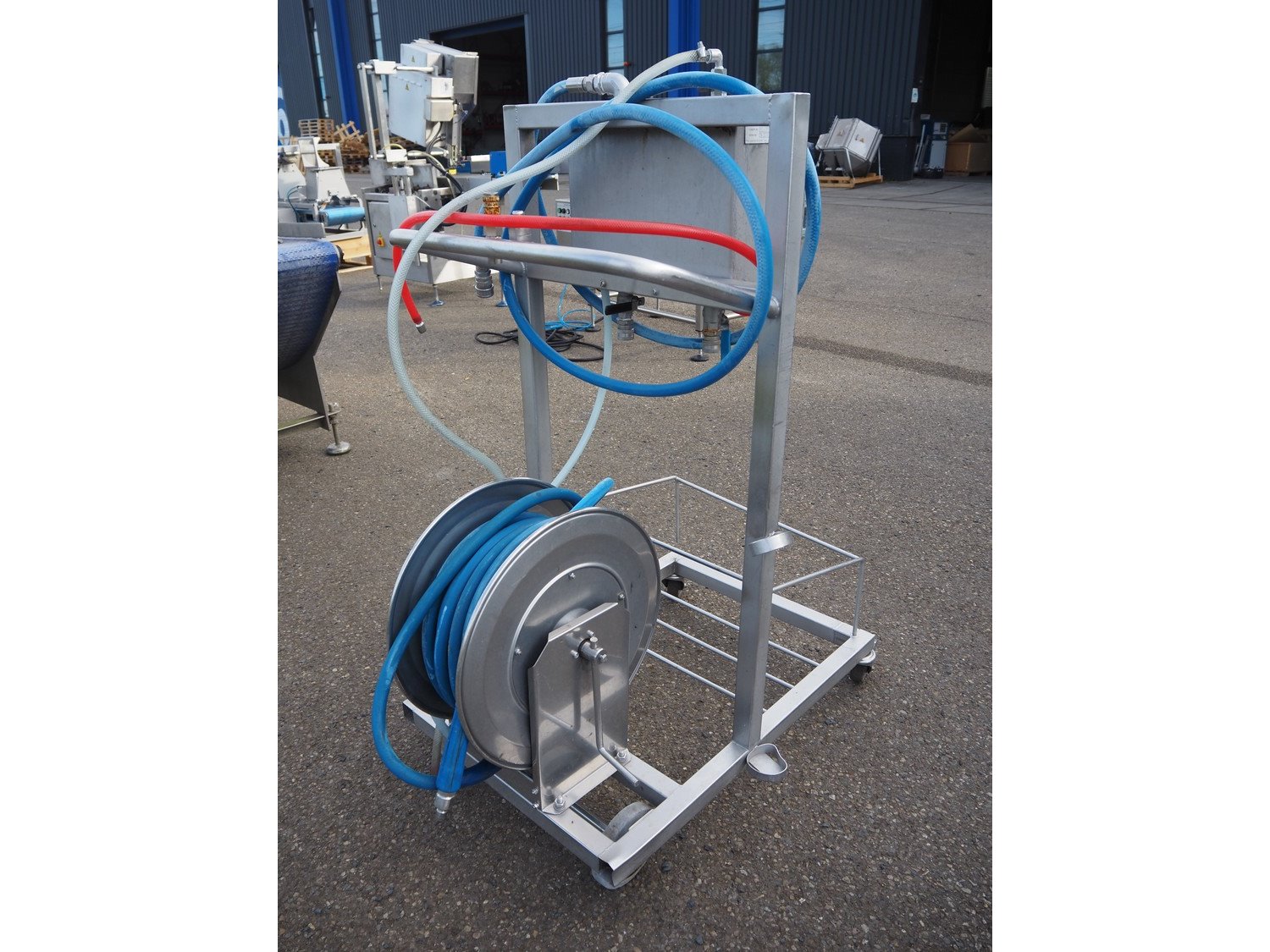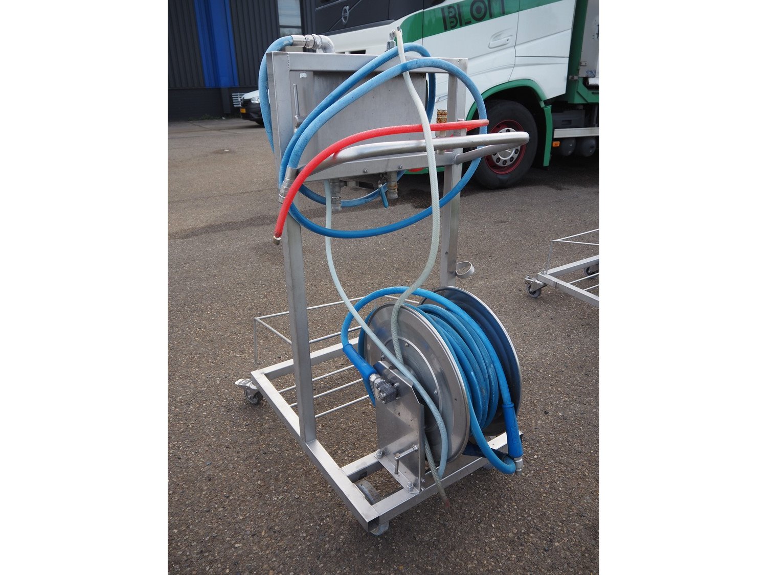AKWA+ s/s hygiene trolley with foam mixing station, s/s hose reel and plastic hose with spray head, serial number: 14 12 07, year of construction: 12-14, dimensions: 1000 mm x 600 mm x 1350 mm. Kavel locatie: Keulschevaart 24 (unit 50-52), 3621 MX Breukelen, Nederland