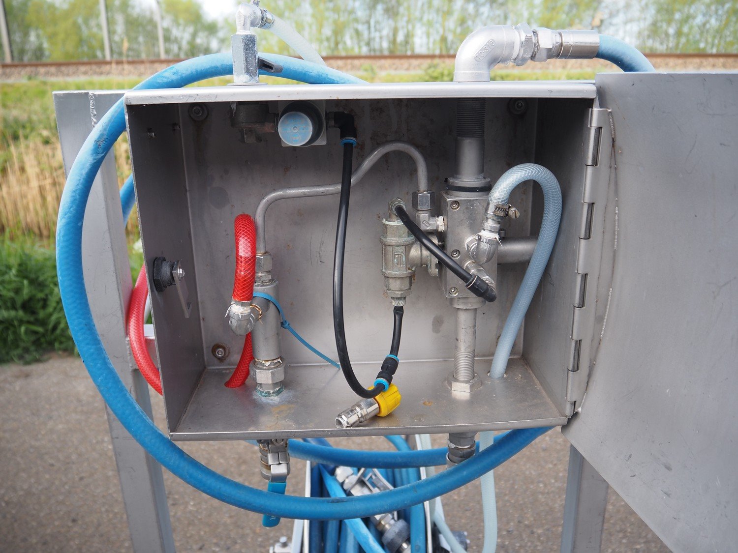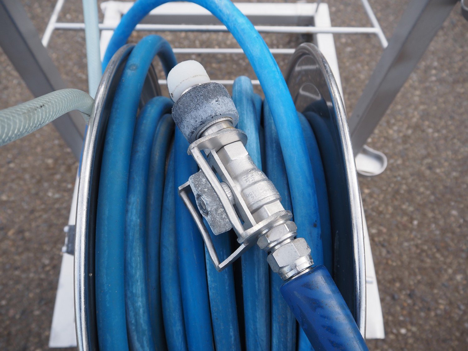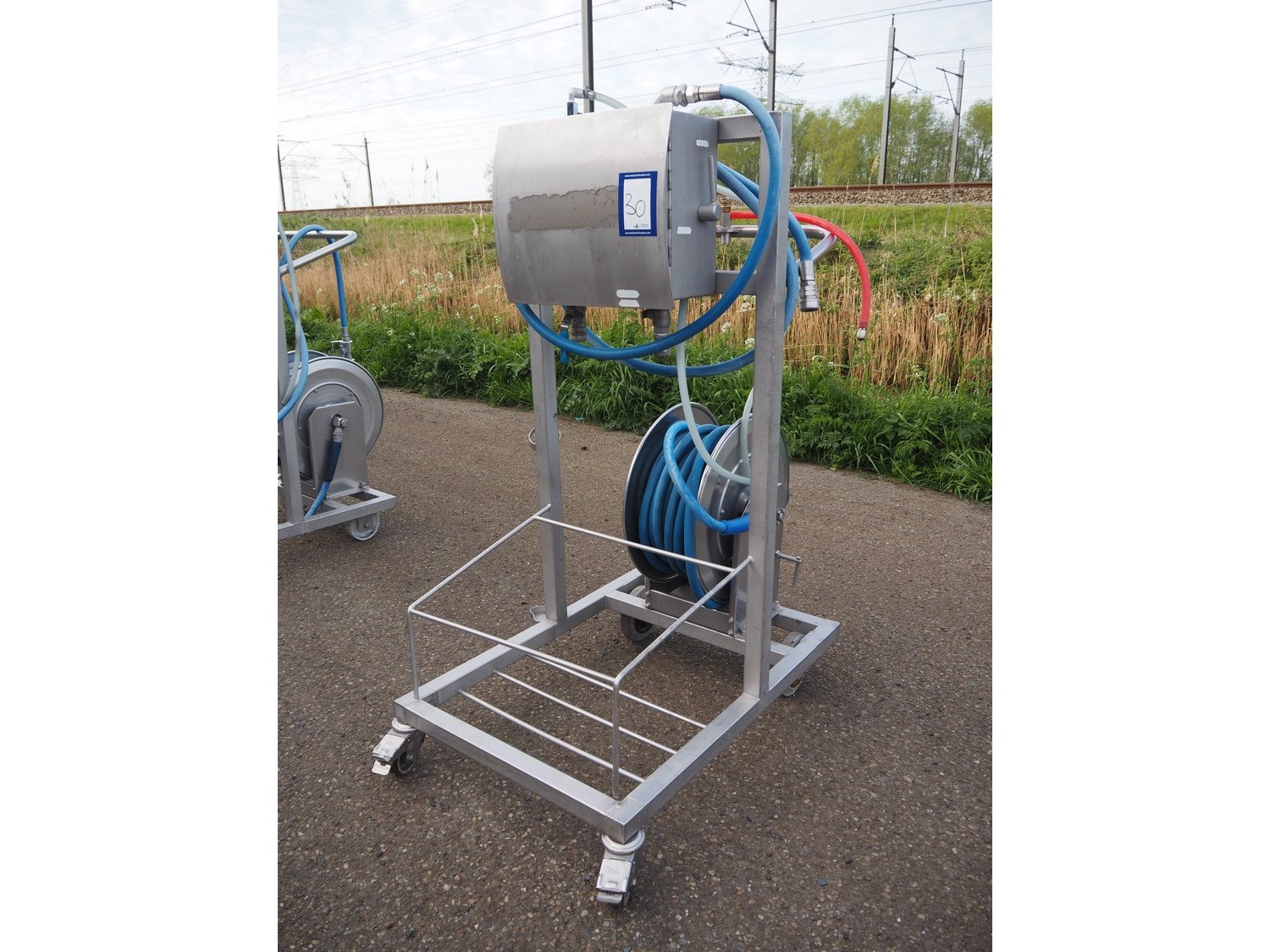 AKWA+ s/s hygiene trolley with foam mixing station, s/s hose reel and plastic hose with spray head, serial number: 14 12 07, year of construction: 12-14, dimensions: 1000 mm x 600 mm x 1350 mm. Kavel locatie: Keulschevaart 24 (unit 50-52), 3621 MX Breukelen, Nederland