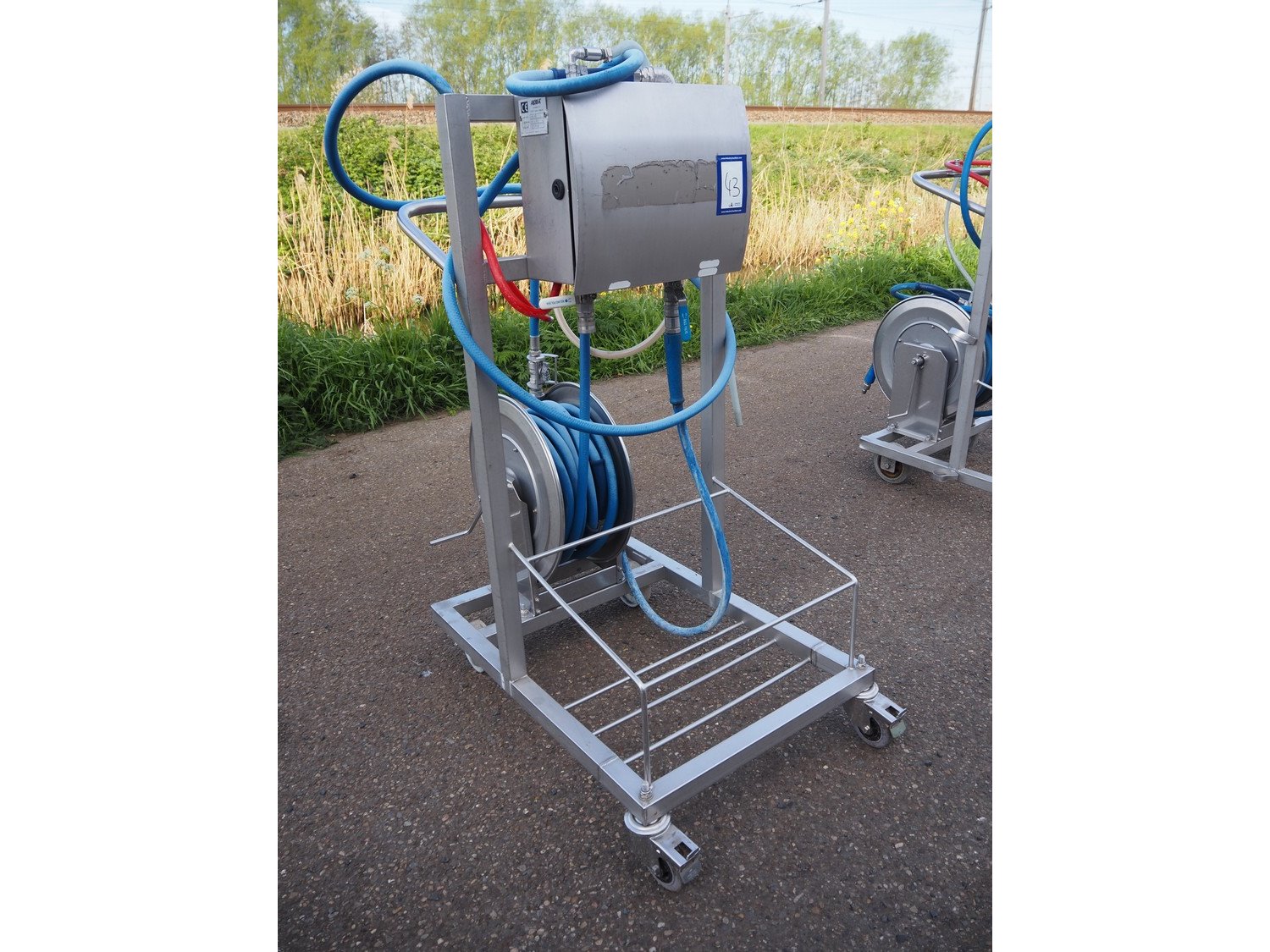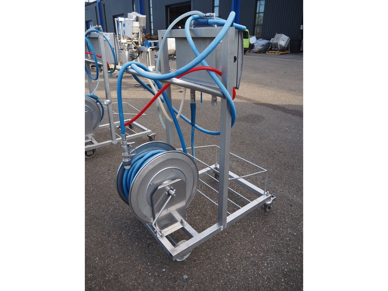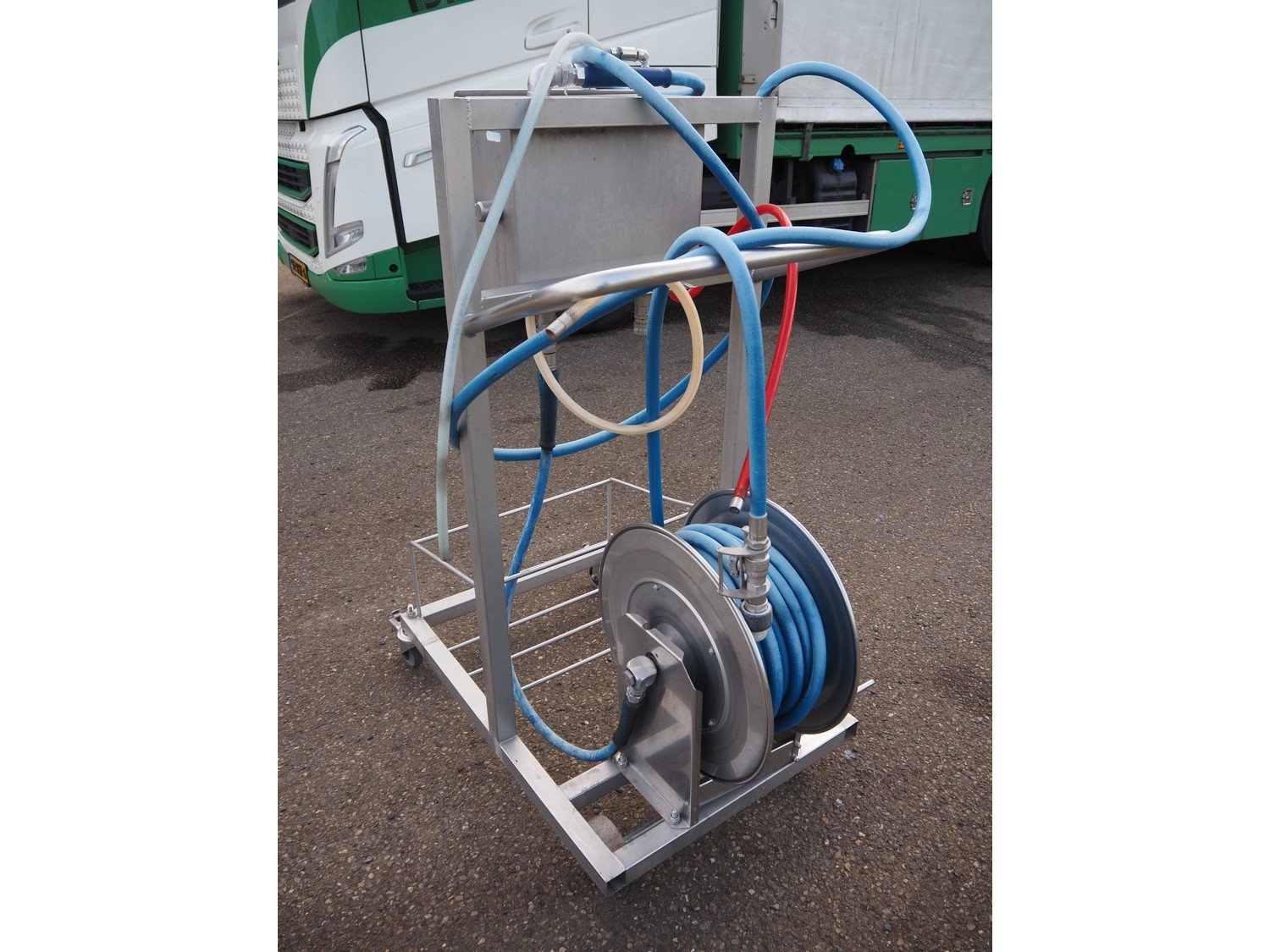 AKWA+ s/s hygiene trolley with foam mixing station, s/s hose reel and plastic hose with spray head, serial number: 12 11 04, year of construction: 11-12, dimensions: 1000 mm x 600 mm x 1350 mm. Kavel locatie: Keulschevaart 24 (unit 50-52), 3621 MX Breukelen, Nederland