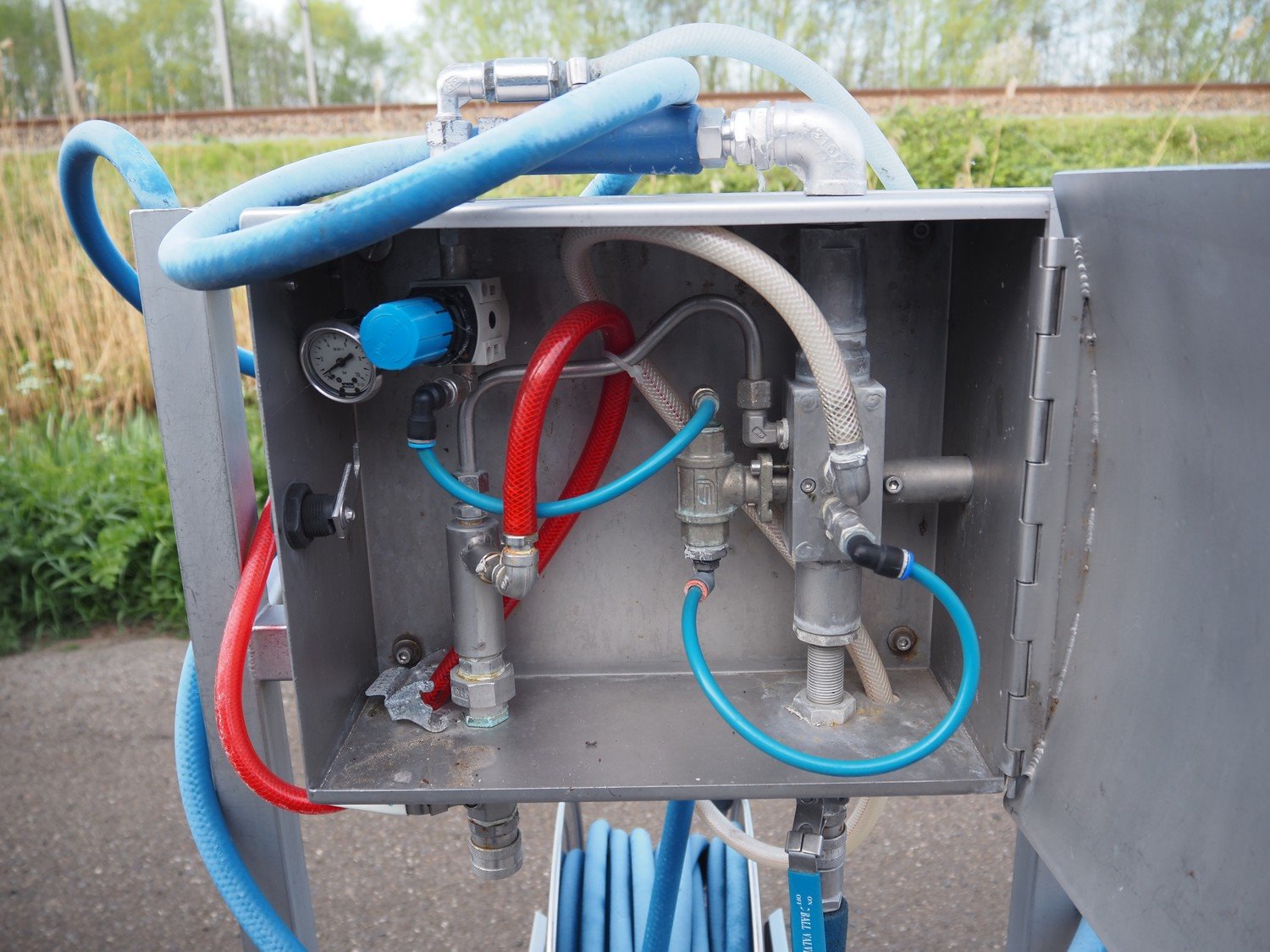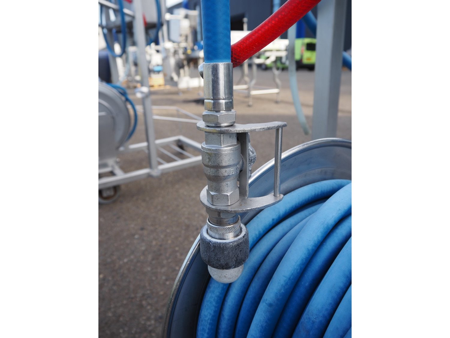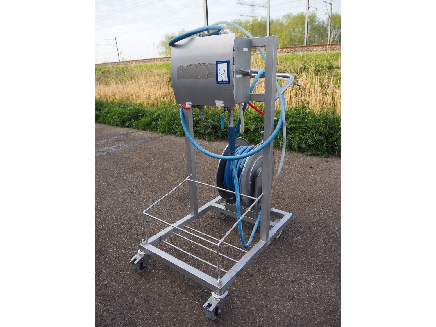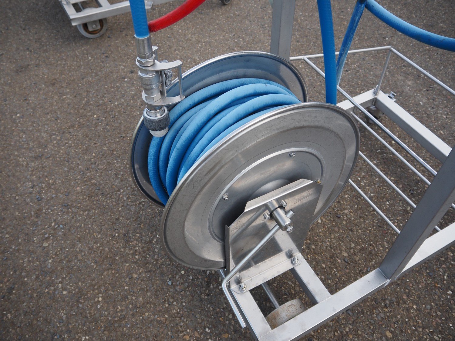 AKWA+ s/s hygiene trolley with foam mixing station, s/s hose reel and plastic hose with spray head, serial number: 12 11 04, year of construction: 11-12, dimensions: 1000 mm x 600 mm x 1350 mm. Kavel locatie: Keulschevaart 24 (unit 50-52), 3621 MX Breukelen, Nederland