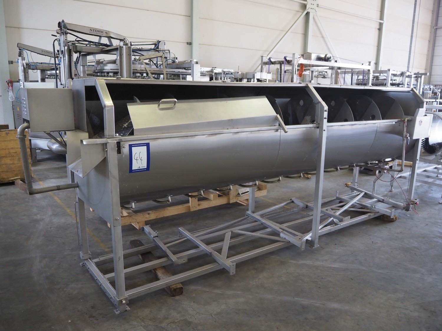 S/s scalding screw, screw width: 780 mm, tier: 500 mm, total dimensions: 4450 mm x 1300 mm x 1650 mm. Kavel locatie: Keulschevaart 24 (unit 50-52), 3621 MX Breukelen, Nederland