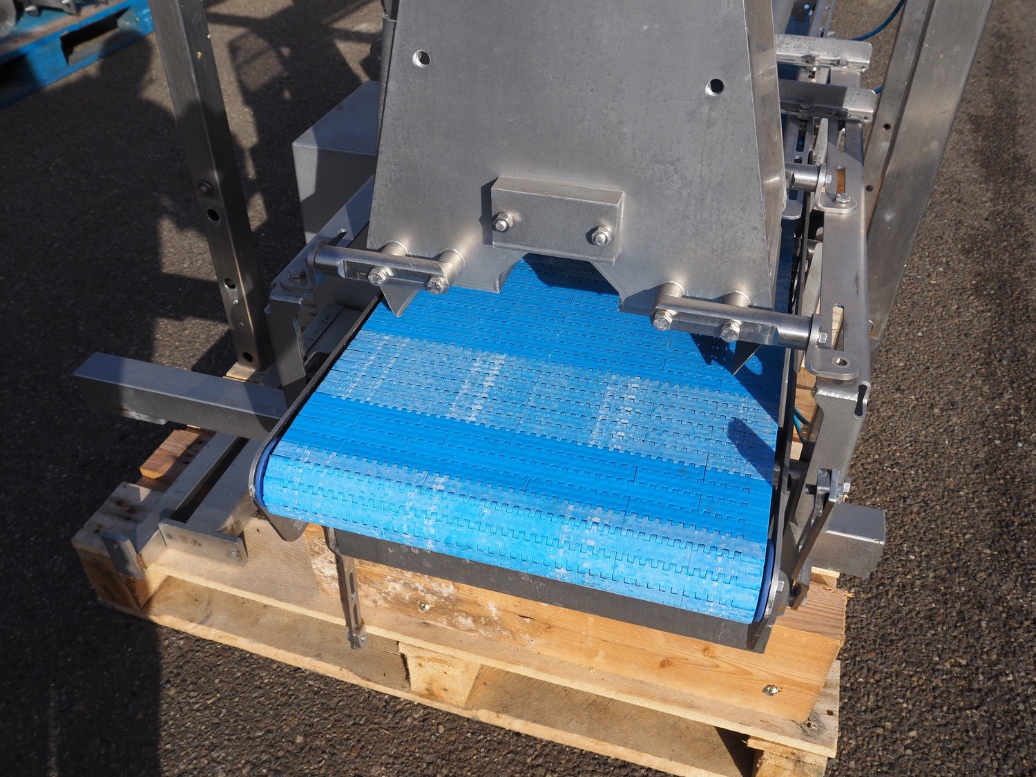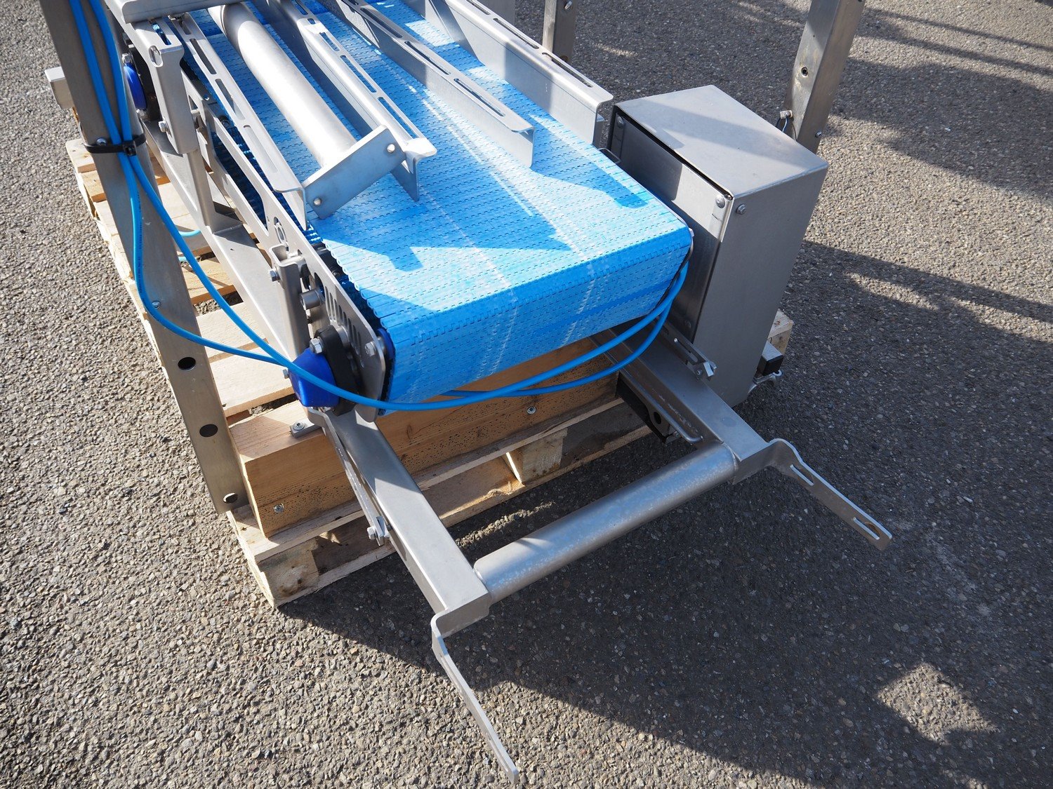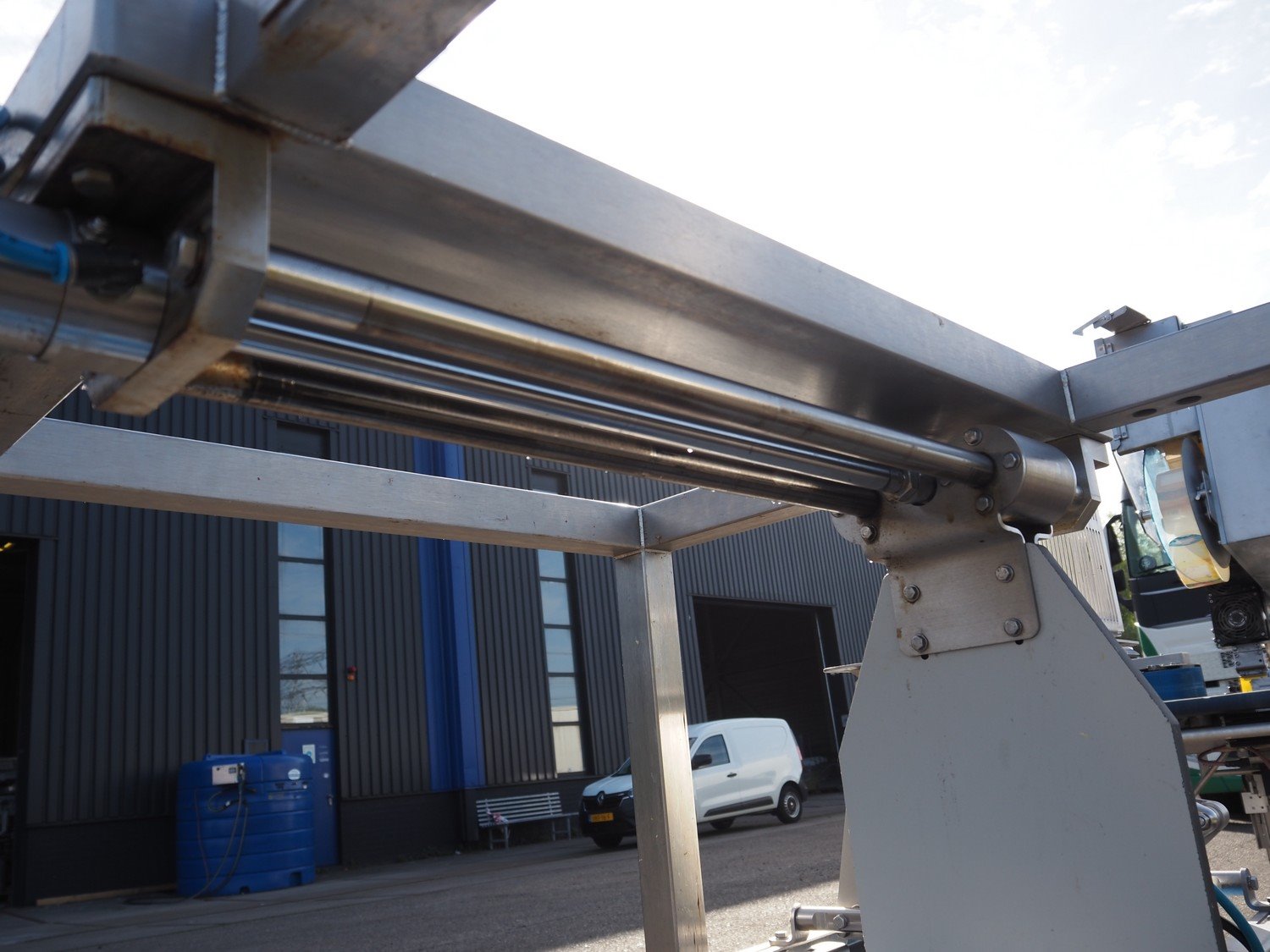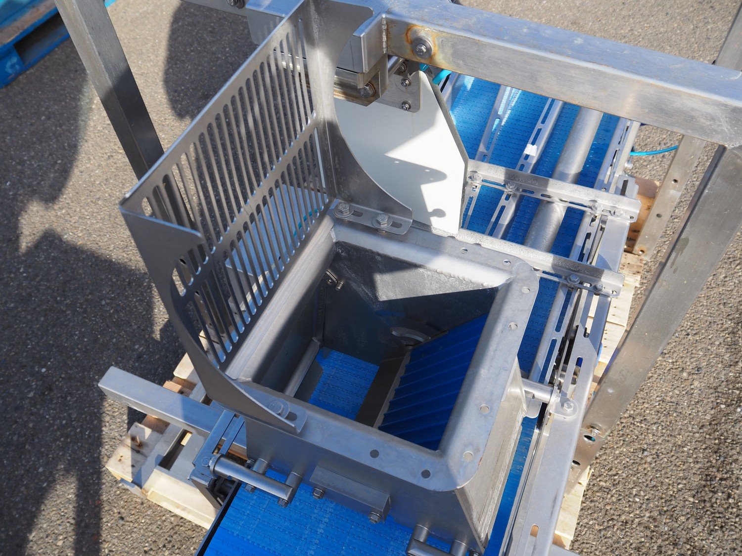Marvu transport belt with 2-way infeed hopper, plastic belt, belt width: 380 mm, total dimensions: 2000 mm x 1000 mm x 1100 mm. Kavel locatie: Keulschevaart 24 (unit 50-52), 3621 MX Breukelen, Nederland