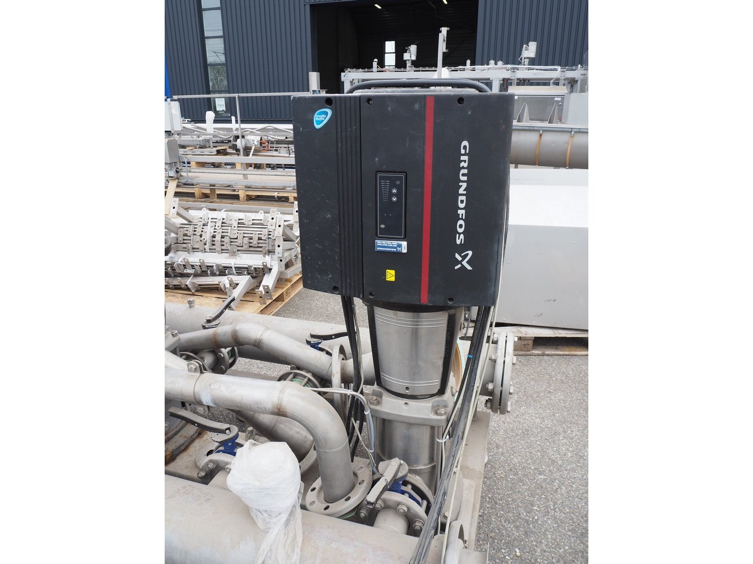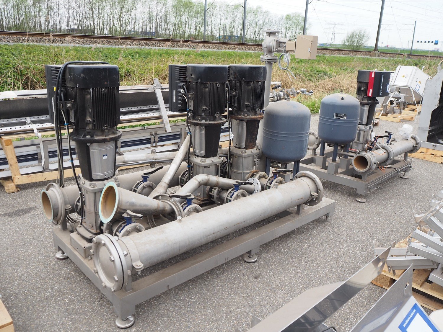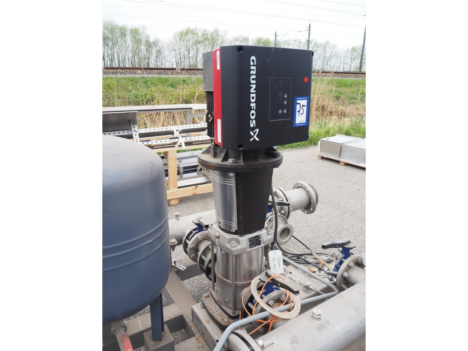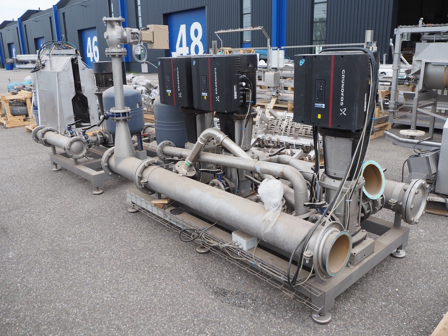 Grundfos high pressure installation consisting of 4 Grundfos circulation pumps, type: (2x) CRNE45-2-1 A-F-A-E-HQQE, (2x) CRE45-2-1 A-F-A-E-HQQE and 2 Grundfos steel pressure vessels, type: GT-U-100 V, dimensions: 2700 mm x 1370 mm x 1950 mm, 1900 mm x 1300 mm x 1520 and 1300 mm x 1350 mm x 1620 mm. Kavel locatie: Keulschevaart 24 (unit 50-52), 3621 MX Breukelen, Nederland