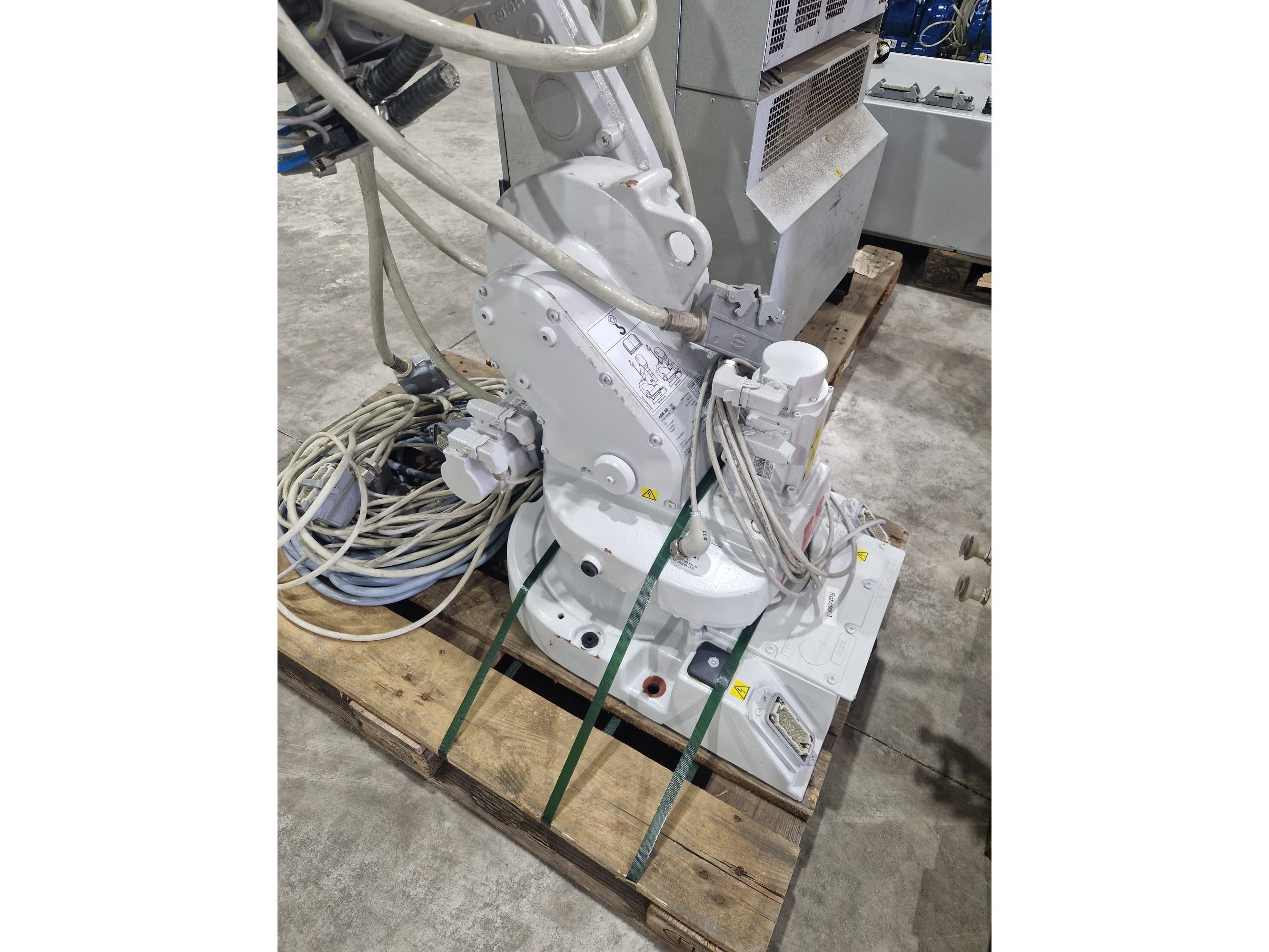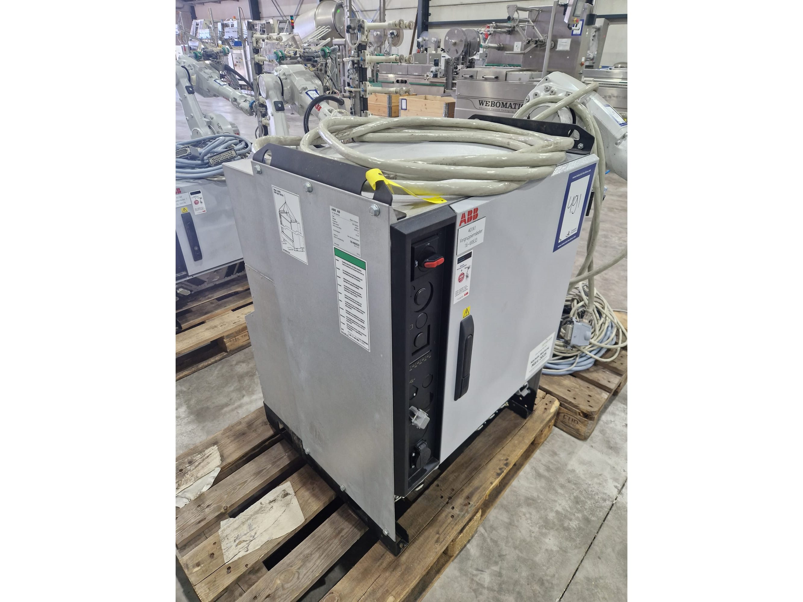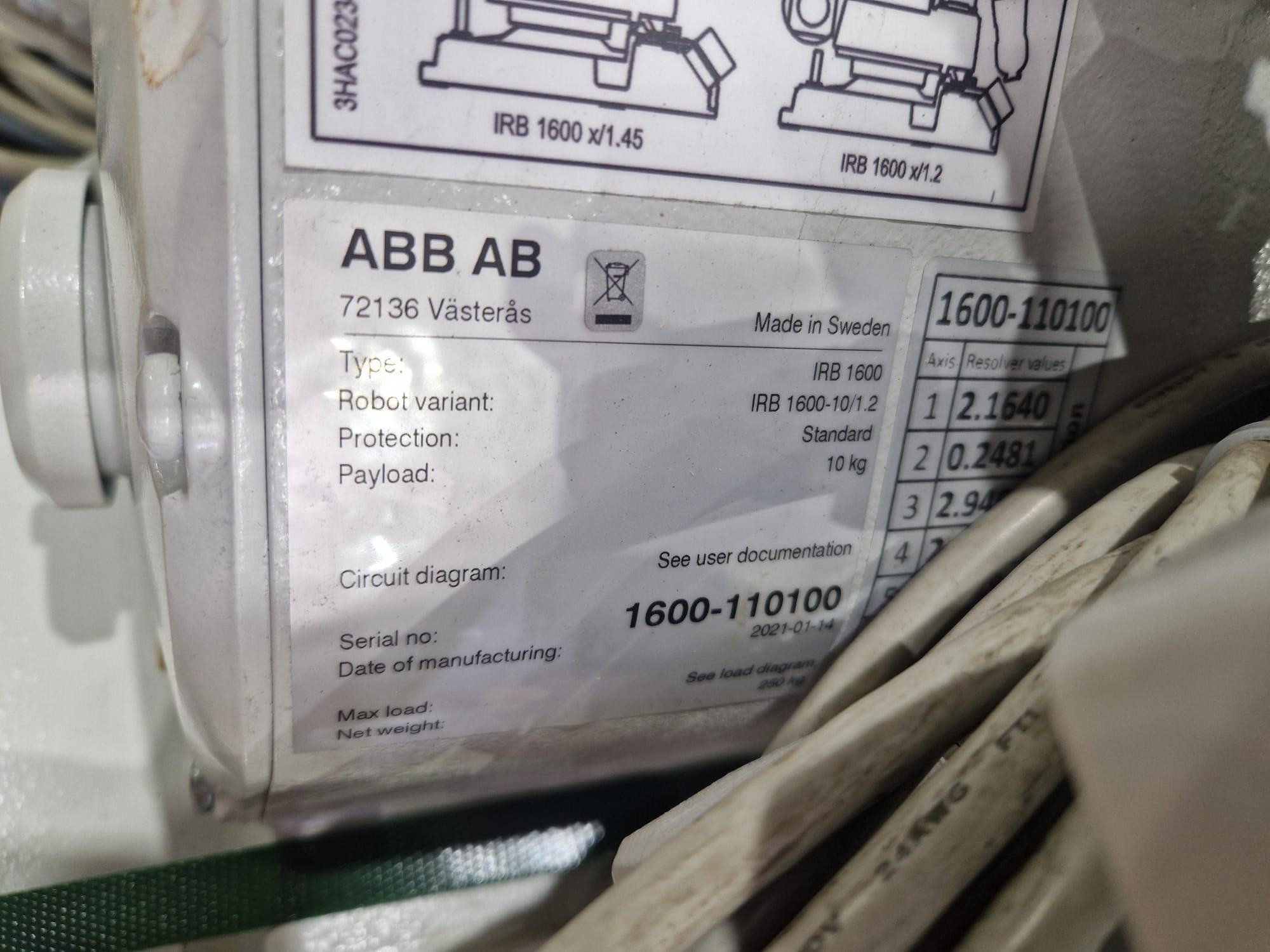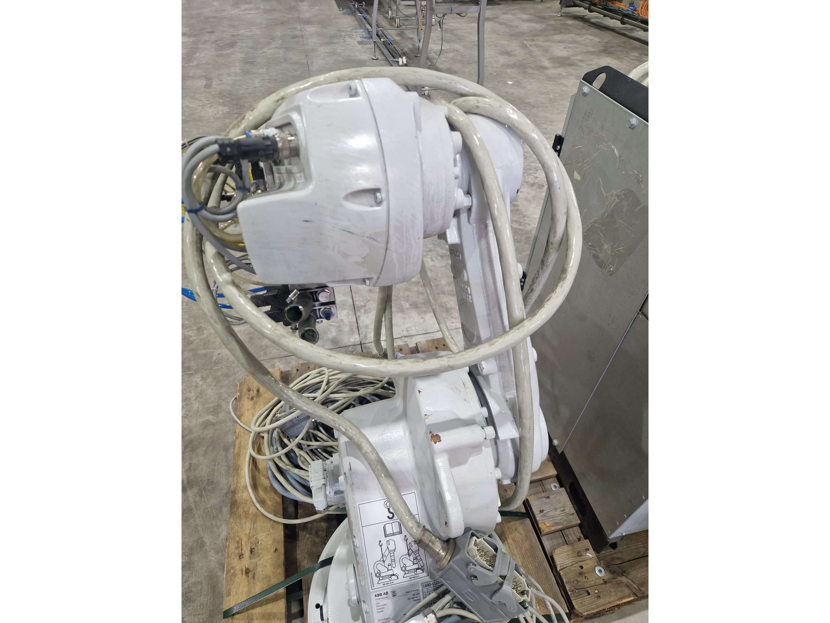 ABB AB robot arm with contol unit, type robot: IRB 1600, serial number: 1600-110100, year of construction: 2021, type control unit: IRC5 M2004, serial number: 16-66933, year of construction: 2012, 400 V, 3 Ph, 50-60 Hz, 7 A, dimensions robot: 1400 mm x 560 mm x 1100 mm. Kavel locatie: Langereijt 29A, 5091 JP Middelbeers, Nederland