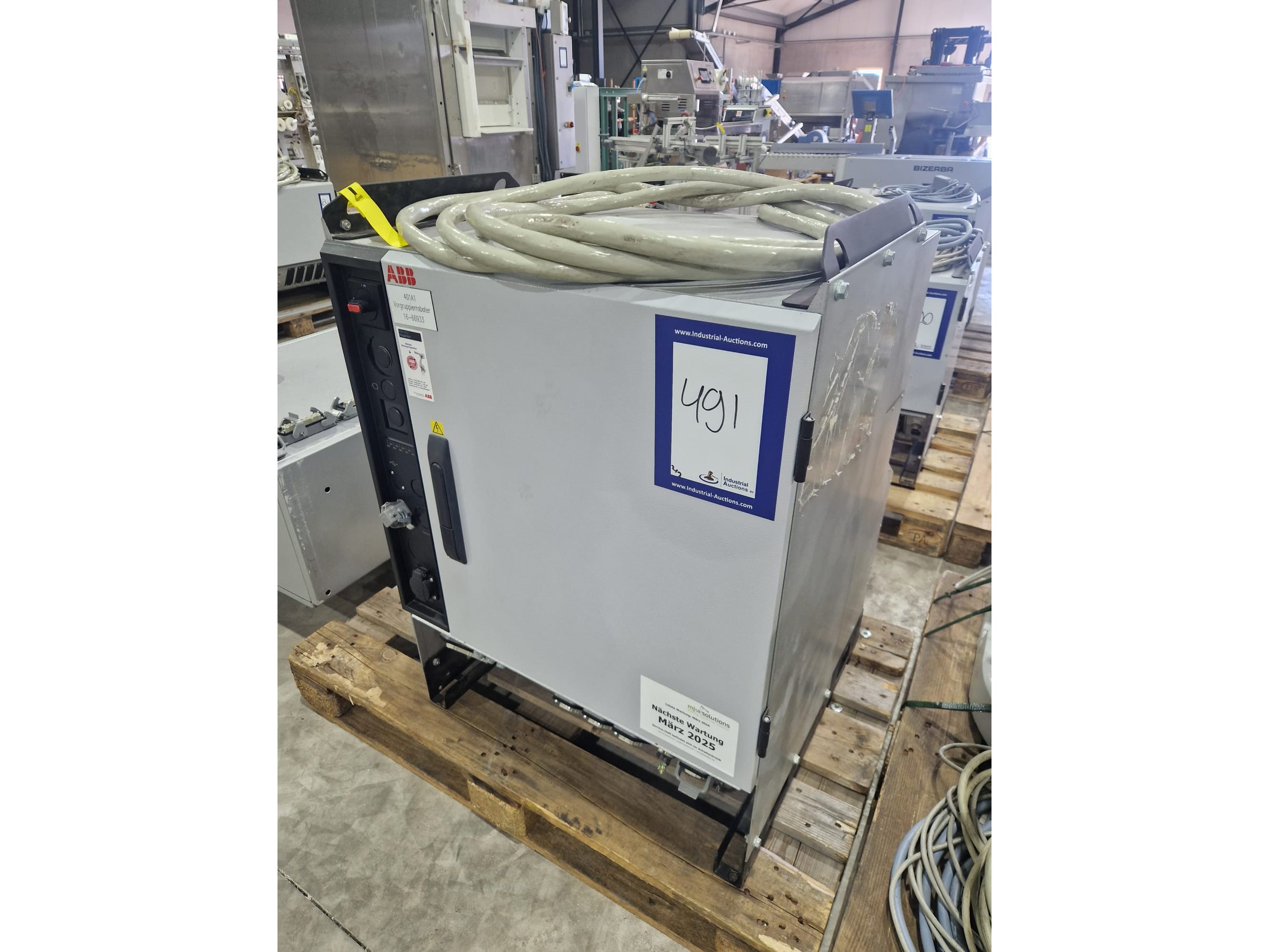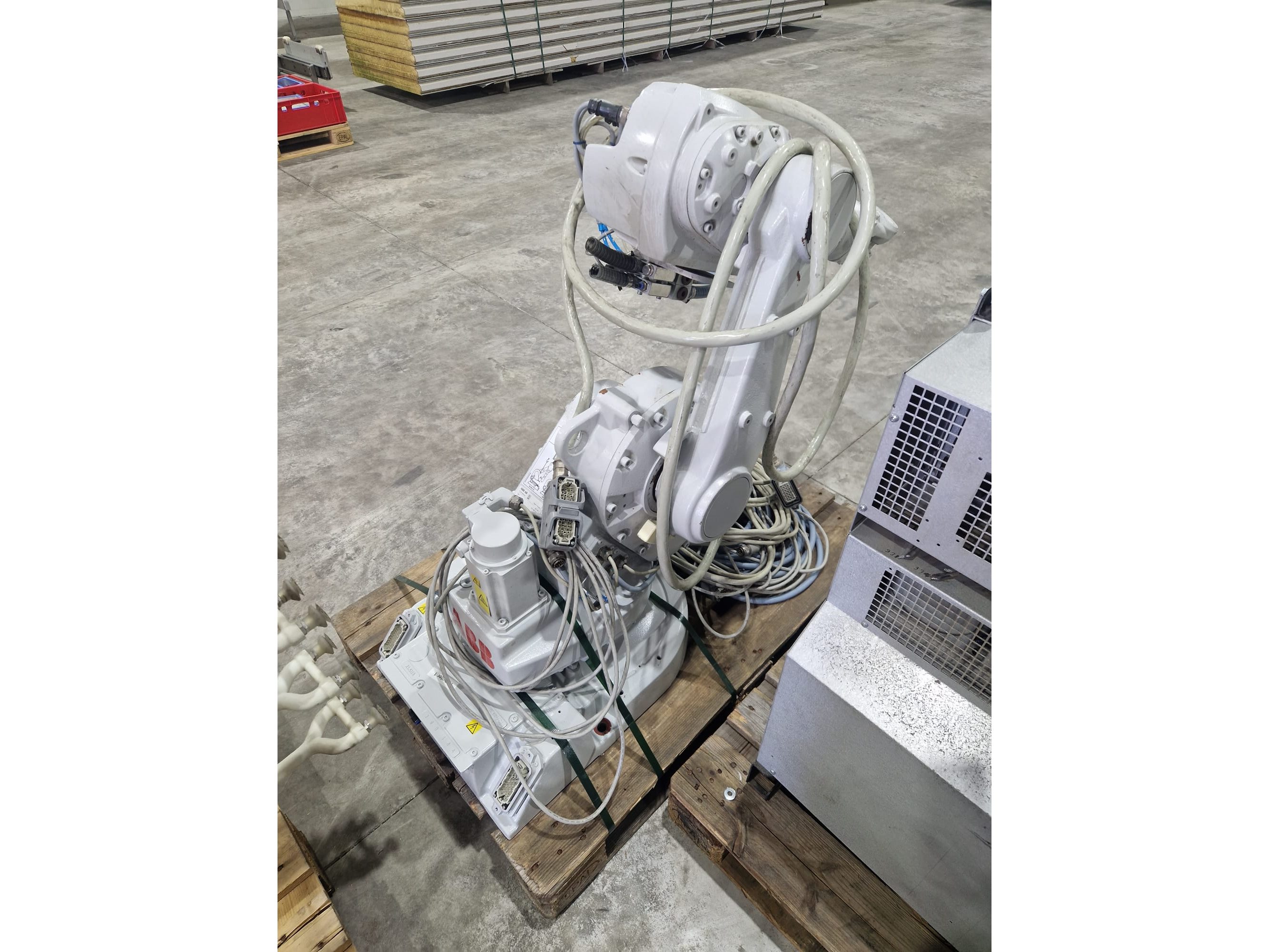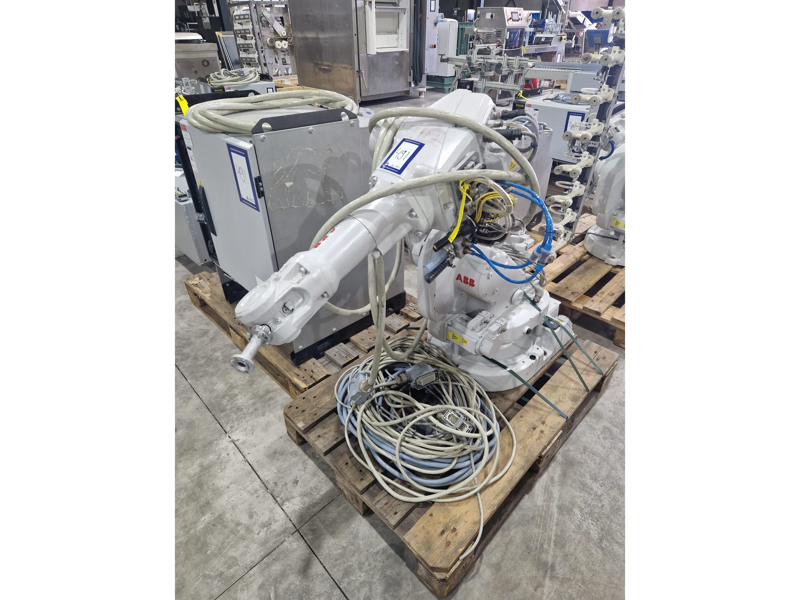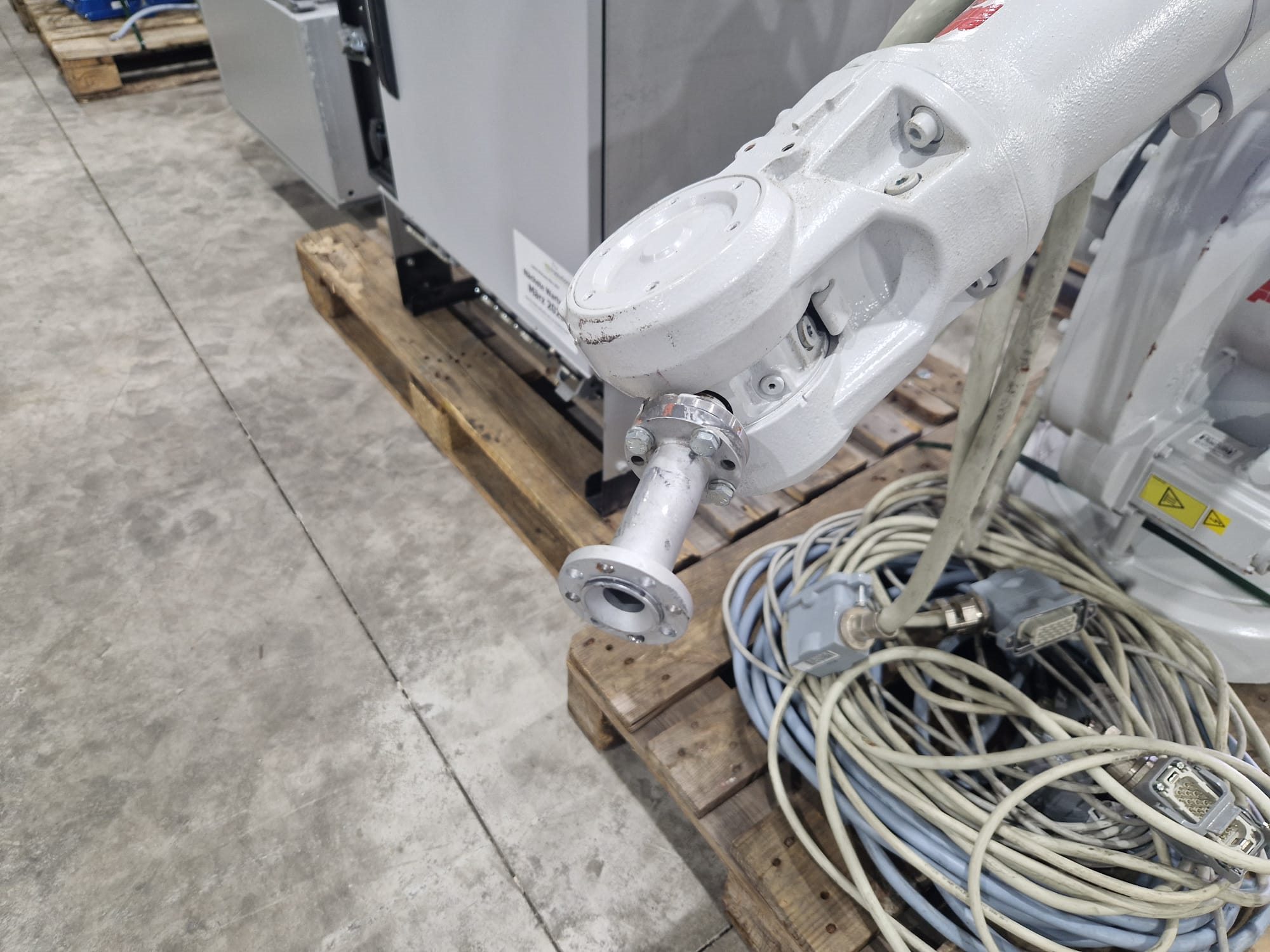 ABB AB robot arm with contol unit, type robot: IRB 1600, serial number: 1600-110100, year of construction: 2021, type control unit: IRC5 M2004, serial number: 16-66933, year of construction: 2012, 400 V, 3 Ph, 50-60 Hz, 7 A, dimensions robot: 1400 mm x 560 mm x 1100 mm. Kavel locatie: Langereijt 29A, 5091 JP Middelbeers, Nederland