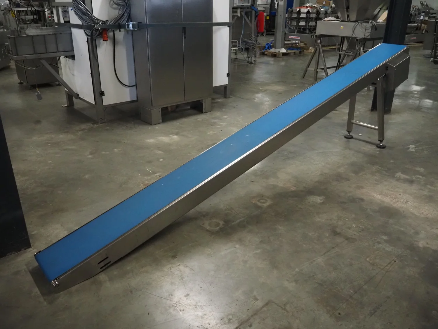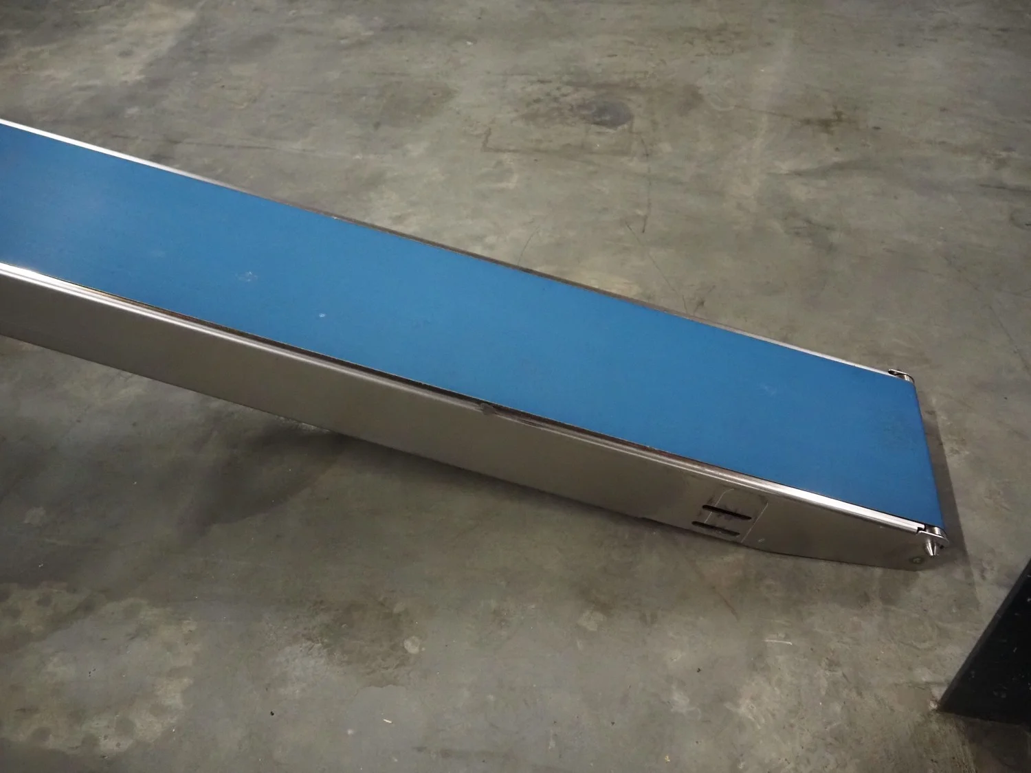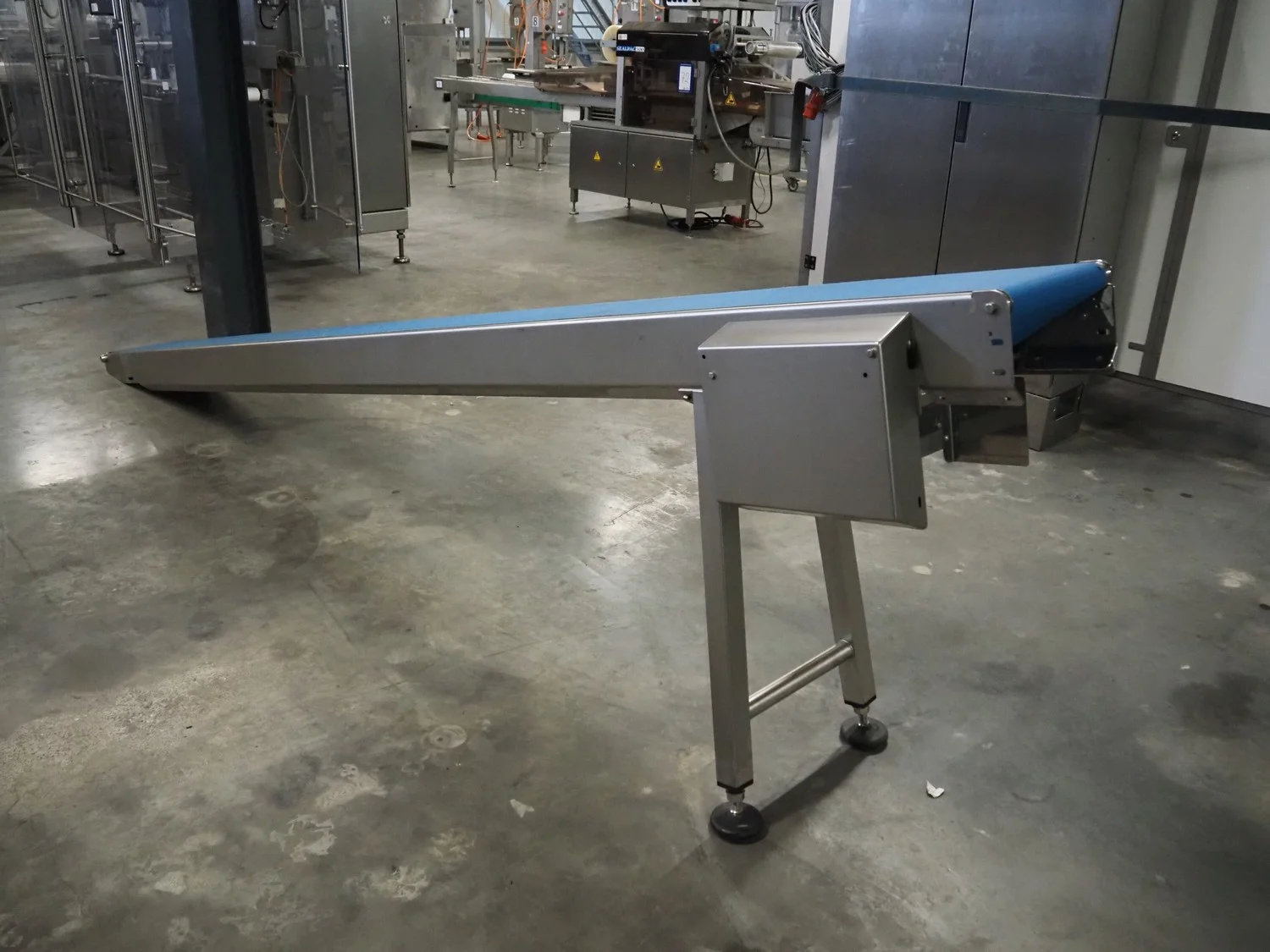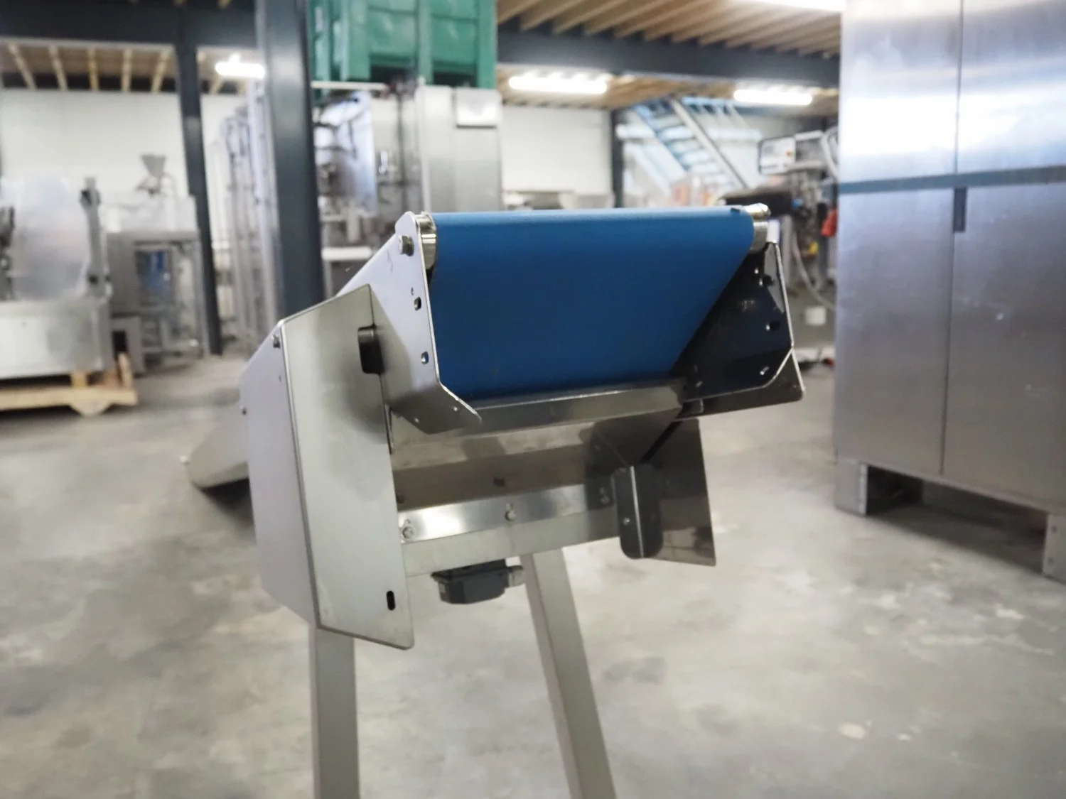 Automotion Systems tray filling machine, type: FST204, year of construction: 2014, 400 V, 3 Ph, 16 A, 4 kW, 2.5 bar, plastic belt with dividers, belt width: 165 mm, distance between dividers: 150 mm, divider height: 150 mm, total dimensions tray filler: 1000 mm x 1400 mm x 2000 mm, including infeed belt, belt width: 265 mm, total dimensions: 1900 mm x 500 mm x 1000 mm. Including t ransport belt, s/s frame, plastic belt, belt width: 285 mm, total dimensions transport belt: 3850 mm x 430 mm x 1060 mm.