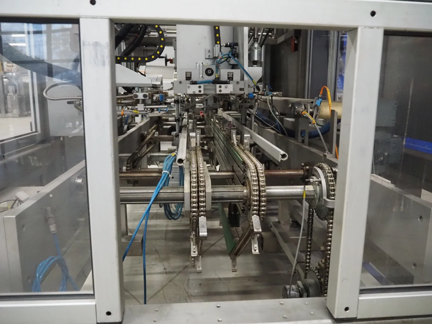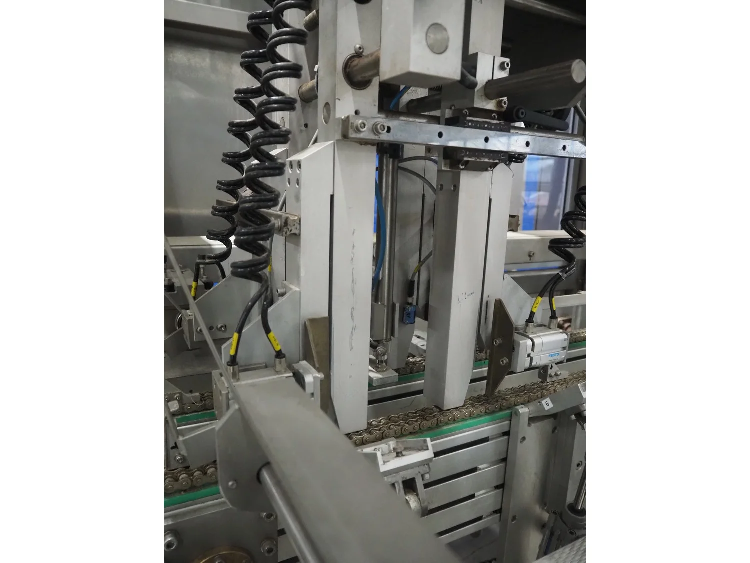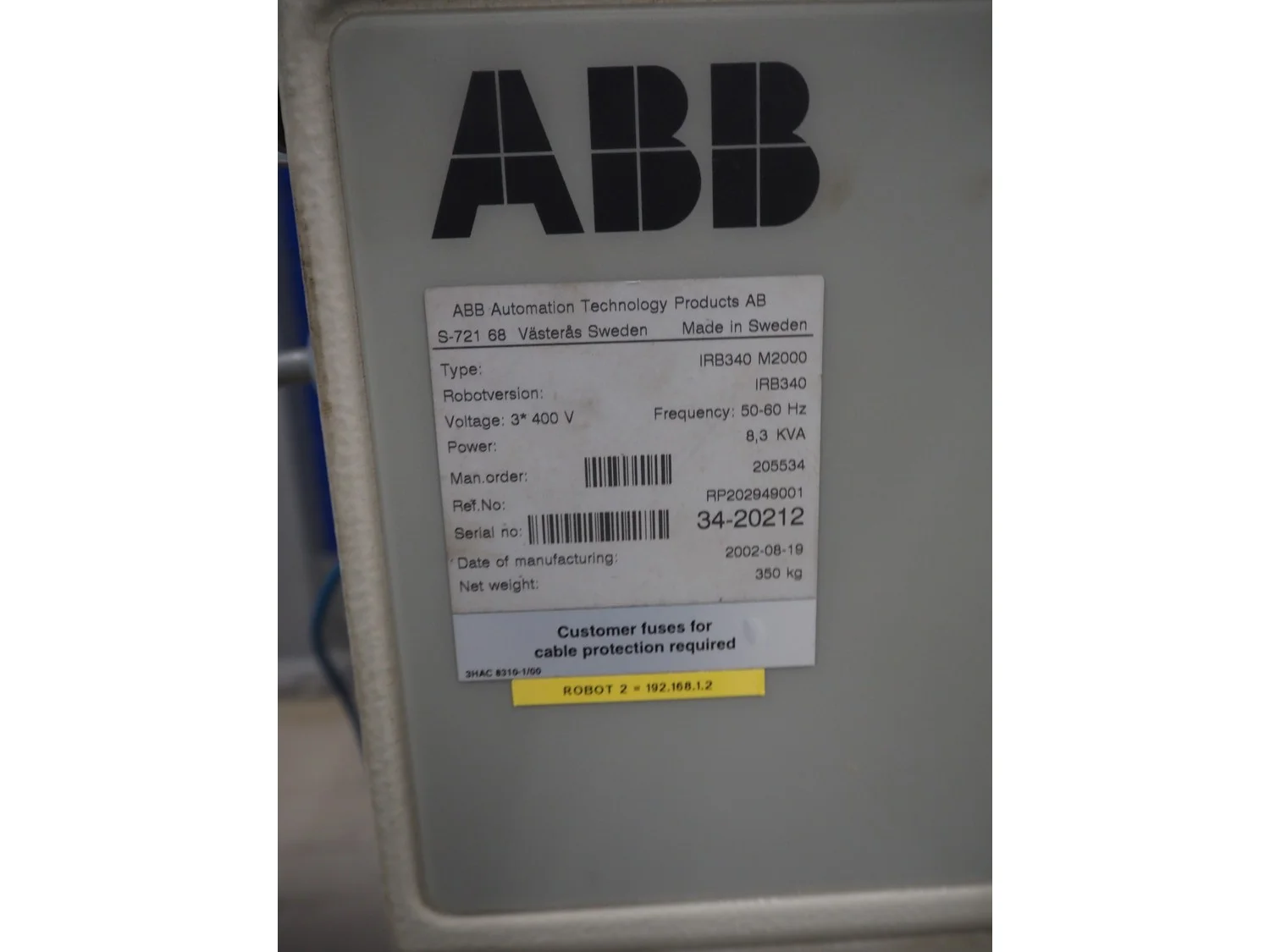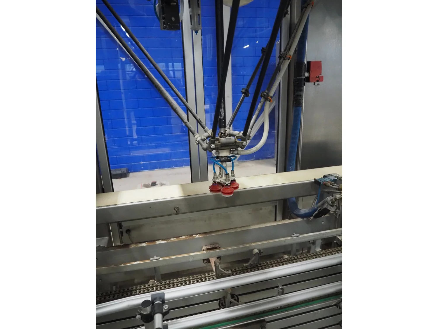 Altotek case erecting and filling machine with FlexPicker, machine number: 754867, year of construction: 31/01-2003, 400 V, 3 Ph, 50 Hz, 35 A, Nordson glue unit, minimum box sizes: 175 mm x 115 mm x 100 mm, maximum box sizes: 350 mm x 250 mm x 250 mm, s/s chain conveyor with dividers, belt width: 200 mm, distance between dividers: 350 mm, divider height: 50 mm, plastic belts, belt width: 130 mm, total dimensions: 4500 mm x 2000 mm x 2600 mm. With ABB control panel and cabinet for robot, type: IRB340 M2000, serial number: 34-20212, year of construction: 19-08-2002, dimensions: 900 mm x 550 mm x 1100 mm.