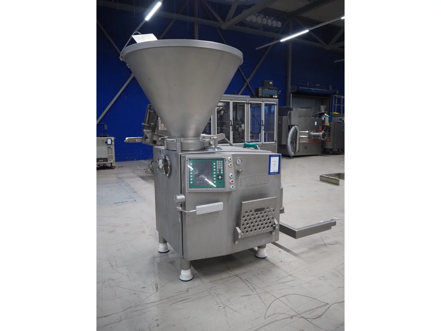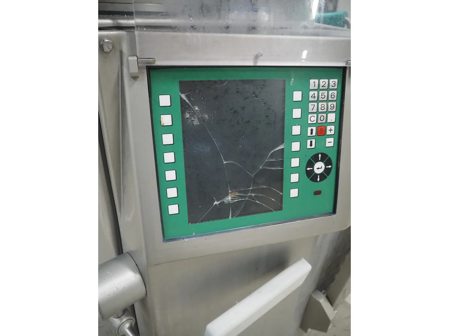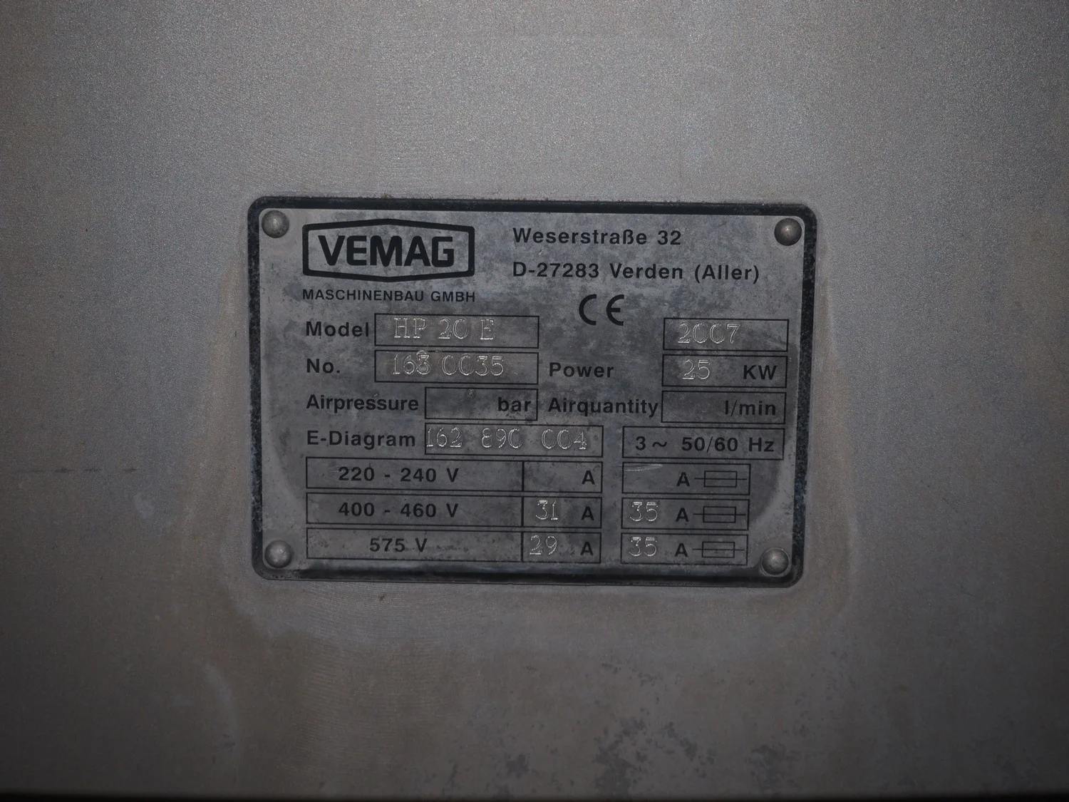 Vemag vacuum filling machine with lifter for meat bins, model: HP20E, number: 1630035, year of construction: 2007, 400-460/575 V, 3 Ph, 50/60 Hz, 31/35/29 A, 25 kW, dimensions: 2200 mm x 1400 mm x 2150 mm. Incomplete, screen broken, technical condition unknown.