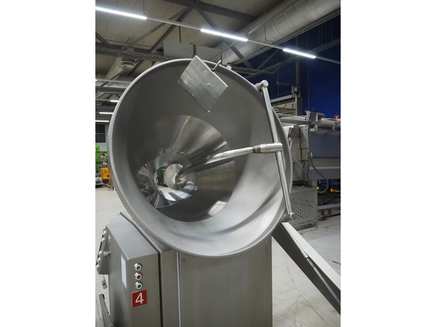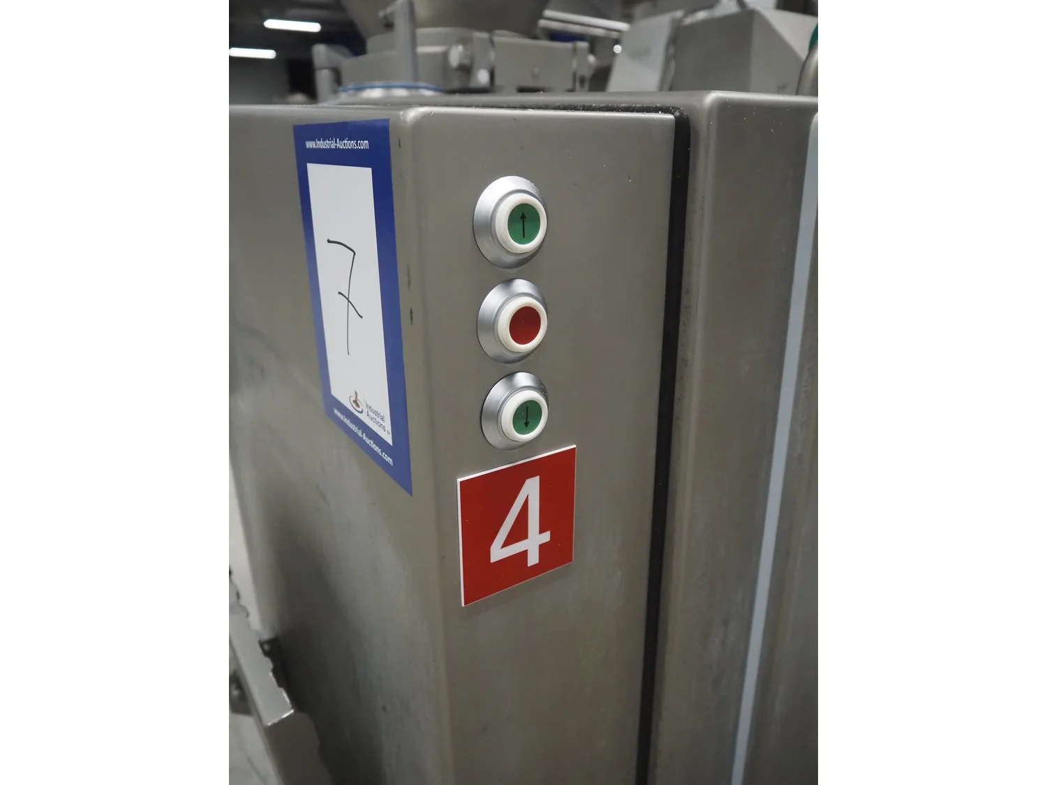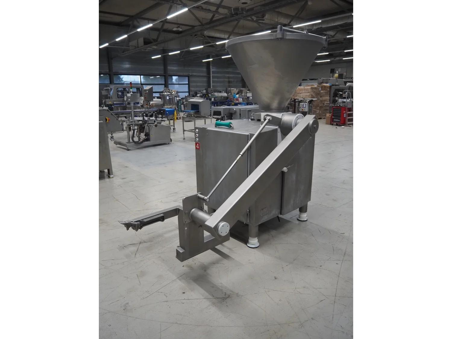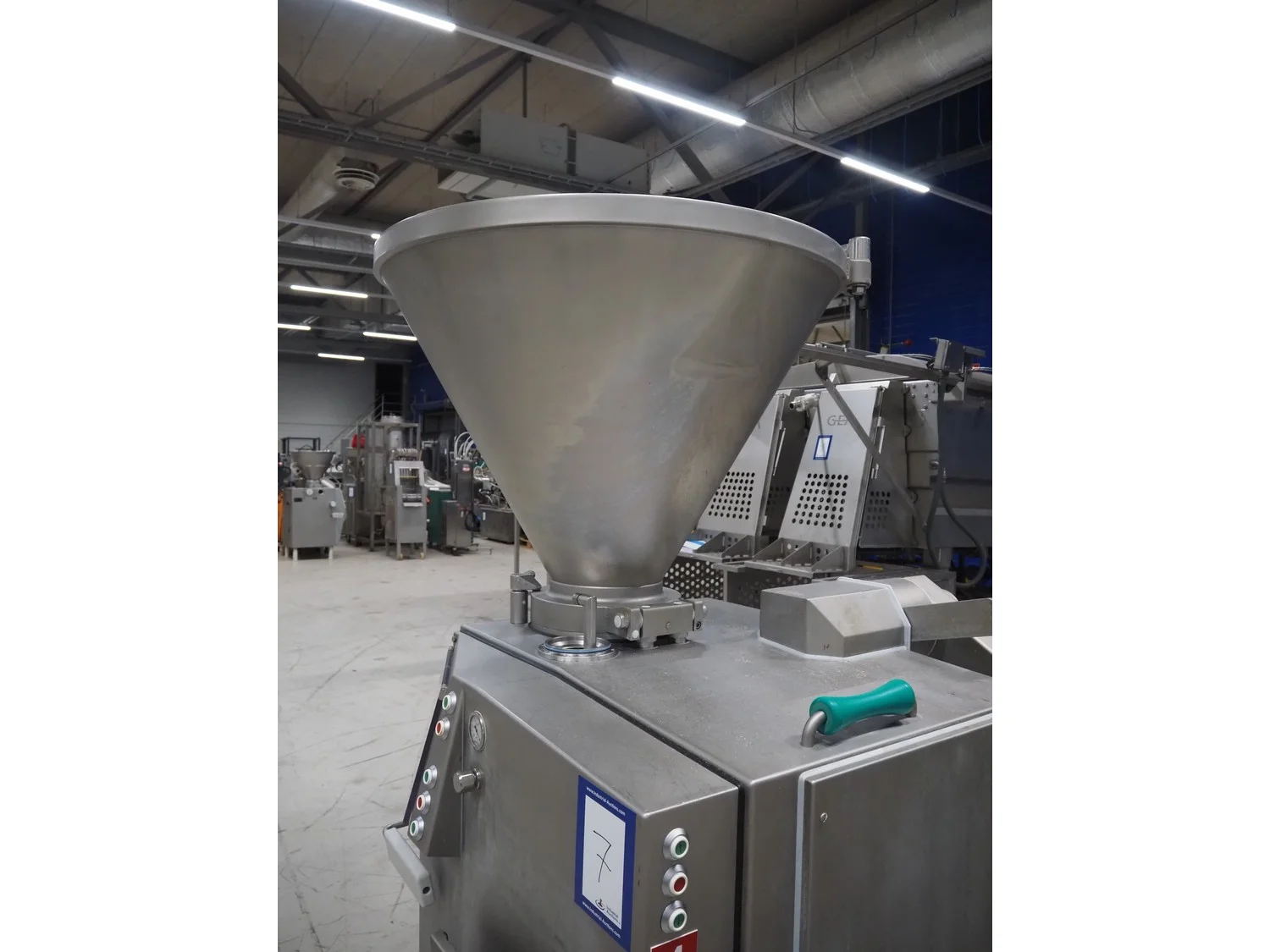 Vemag vacuum filling machine with lifter for meat bins, model: HP20E, number: 1630035, year of construction: 2007, 400-460/575 V, 3 Ph, 50/60 Hz, 31/35/29 A, 25 kW, dimensions: 2200 mm x 1400 mm x 2150 mm. Incomplete, screen broken, technical condition unknown.