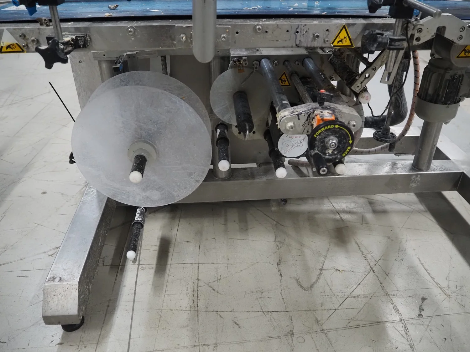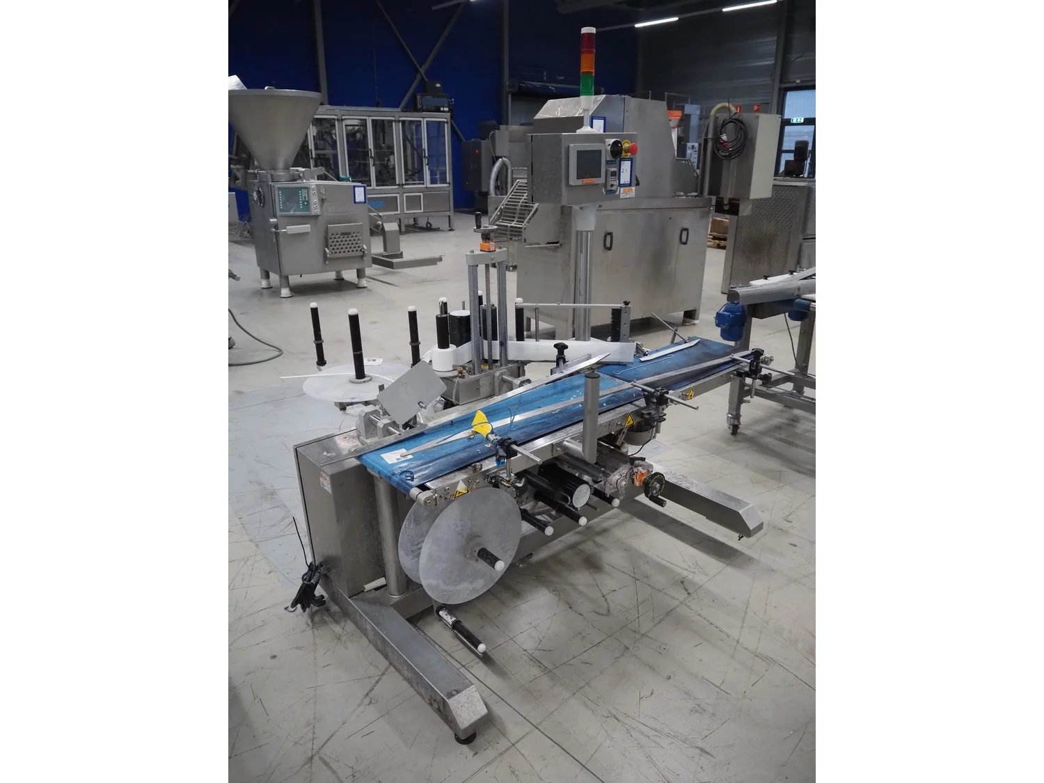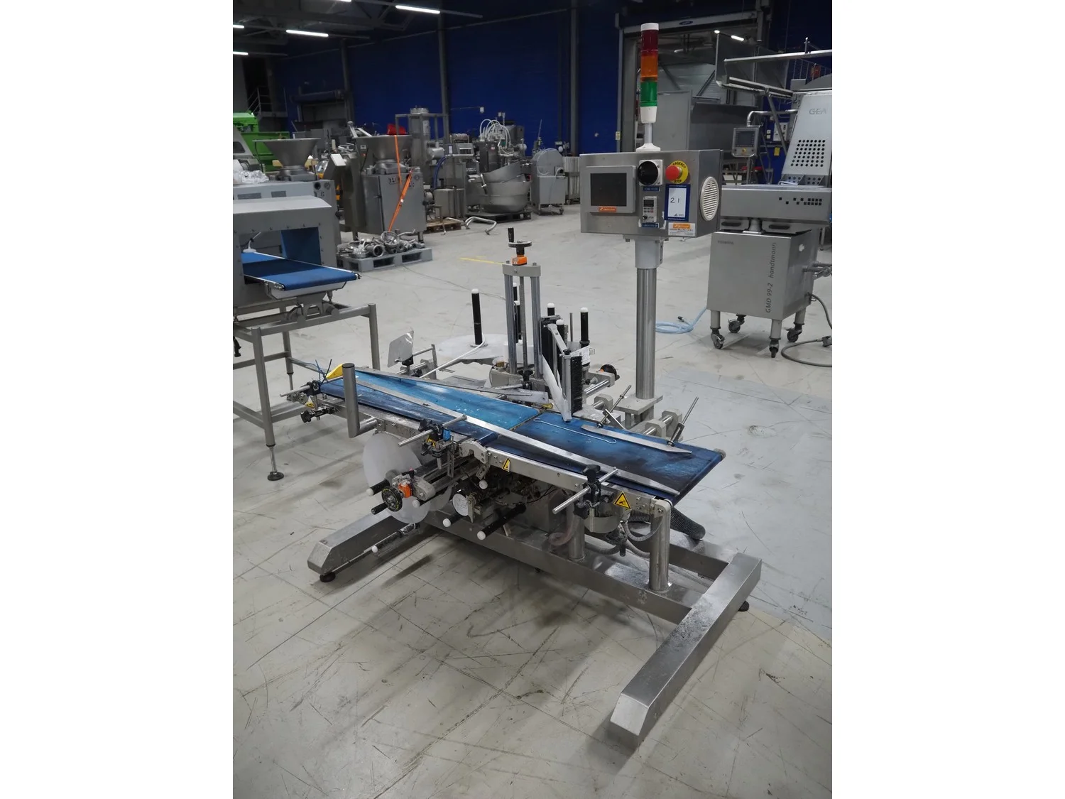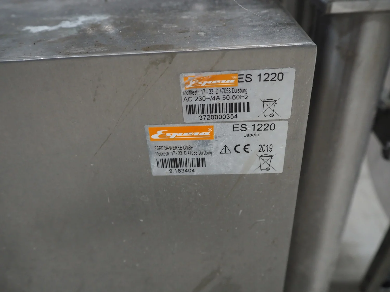 Espera label printer with bottom and side labeller, model: ES 1220, plastic belt, belt width: 300 mm, total dimensions: 1650 mm x 1350 mm x 1900 mm.