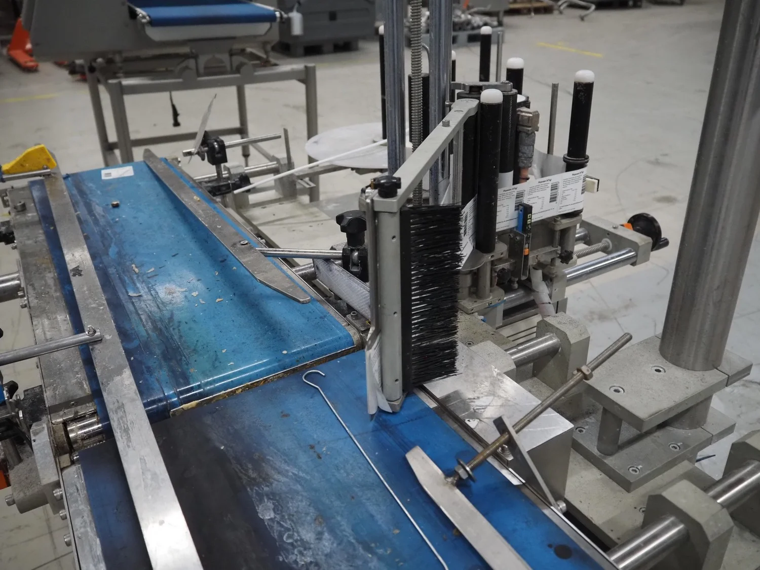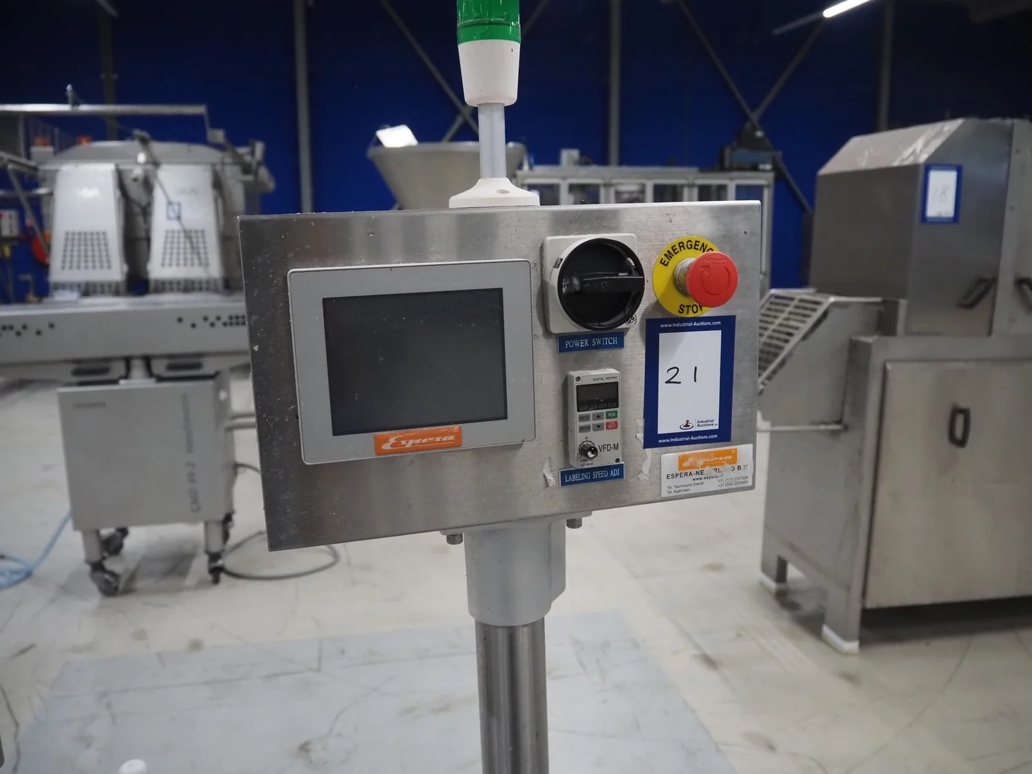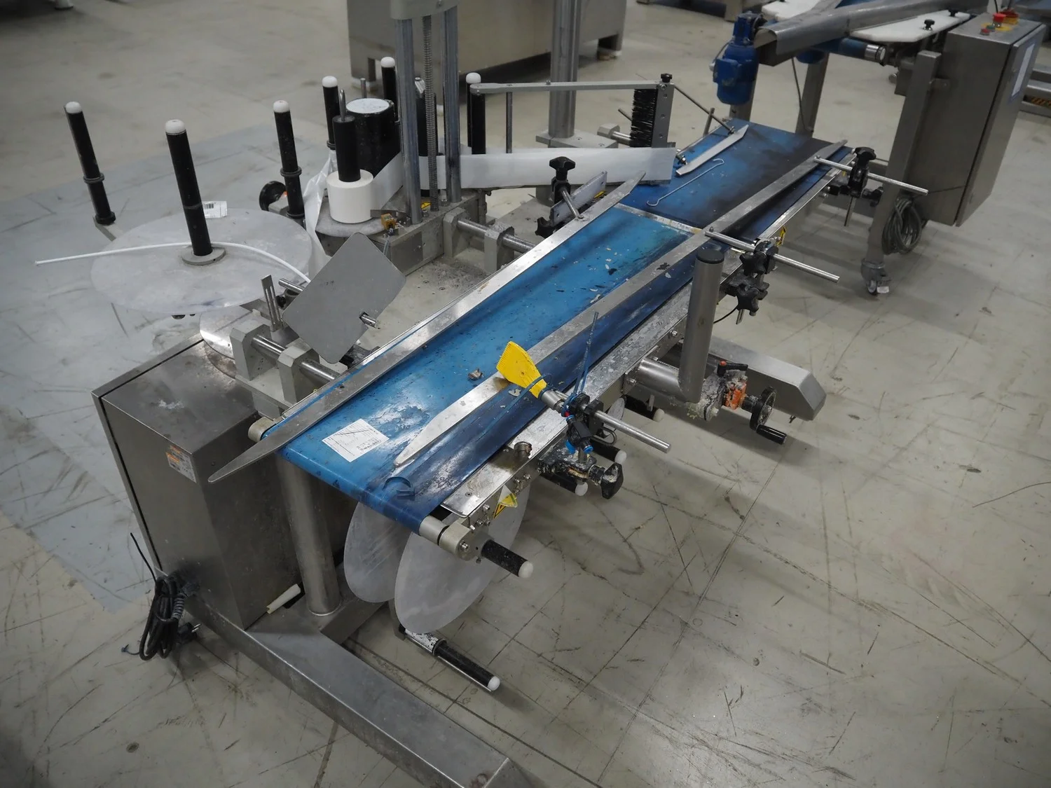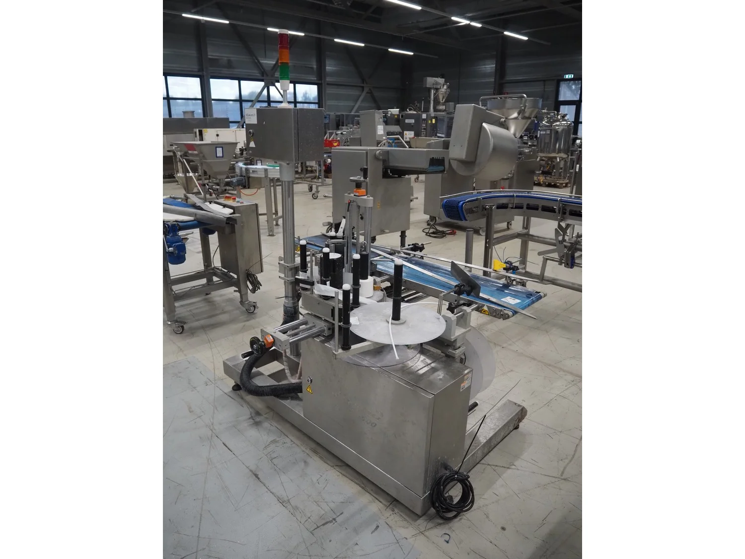 Espera label printer with bottom and side labeller, model: ES 1220, plastic belt, belt width: 300 mm, total dimensions: 1650 mm x 1350 mm x 1900 mm.