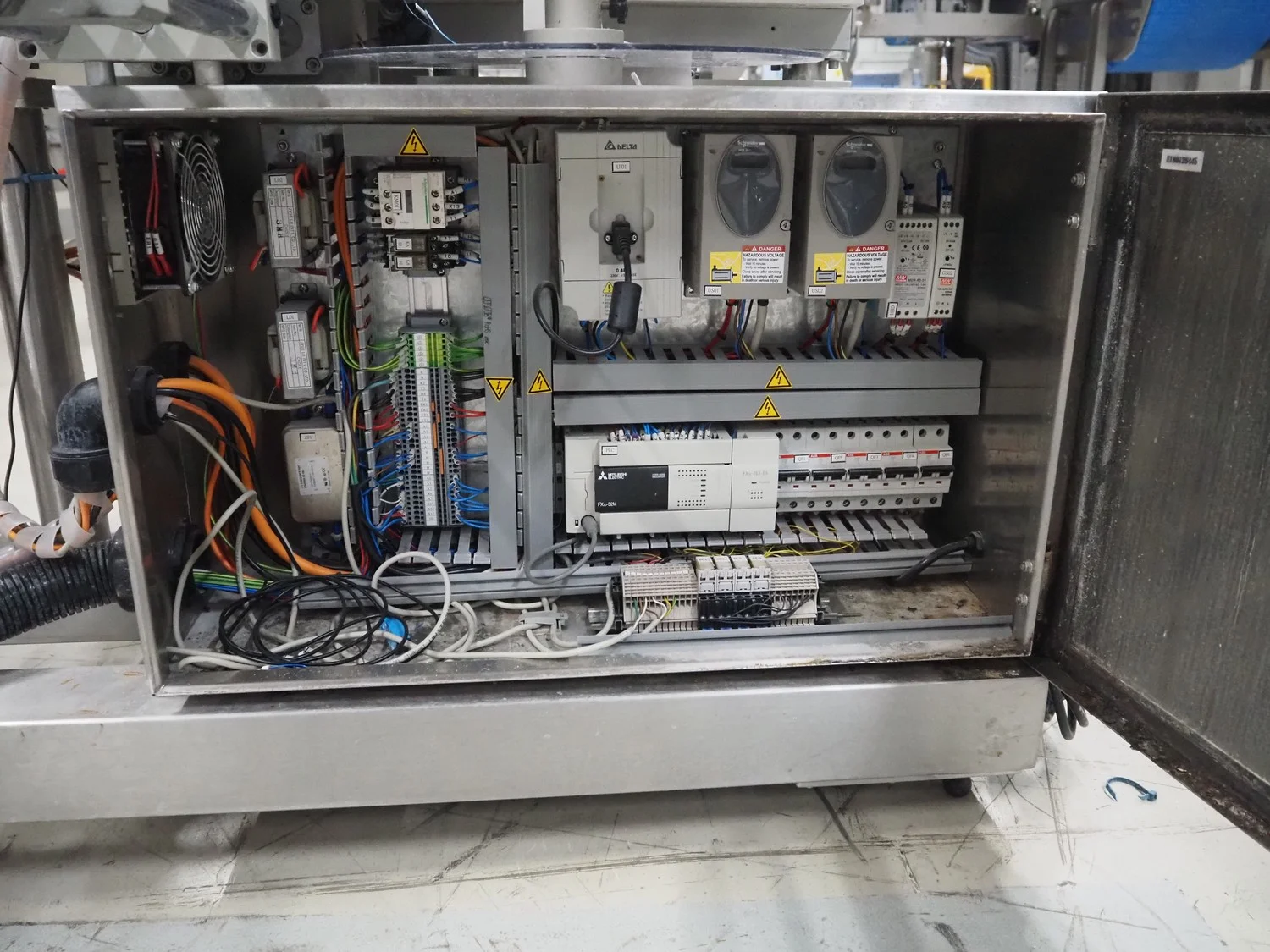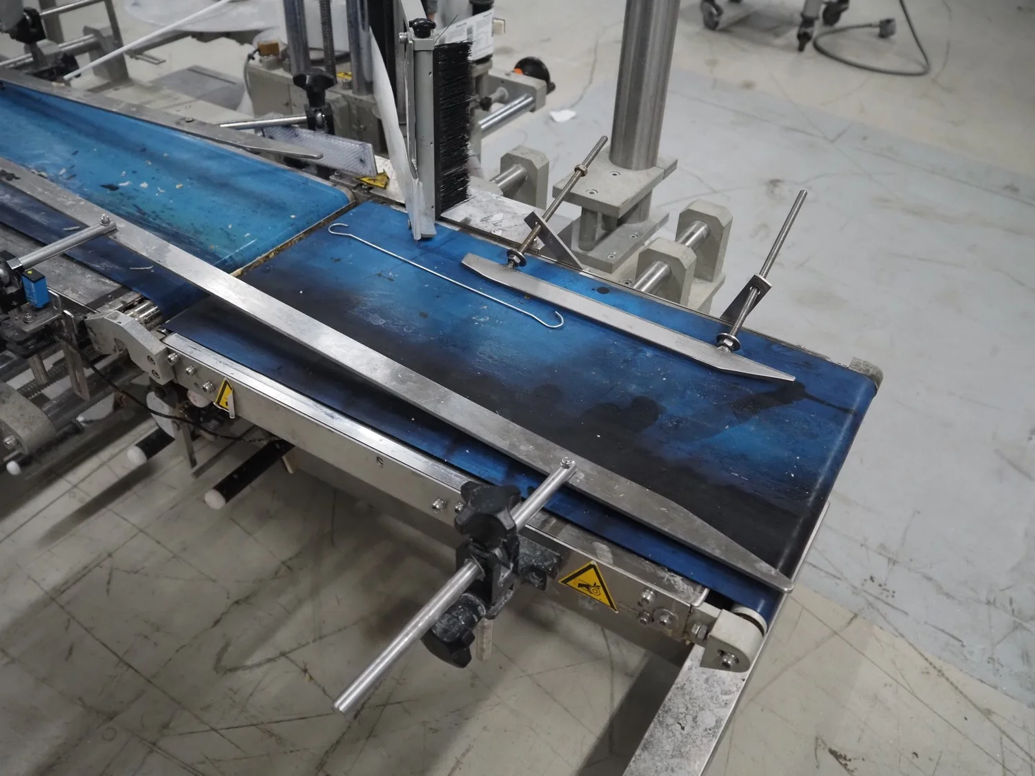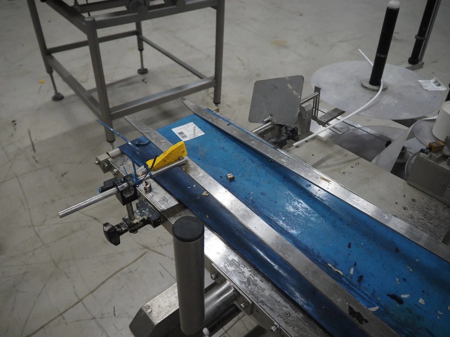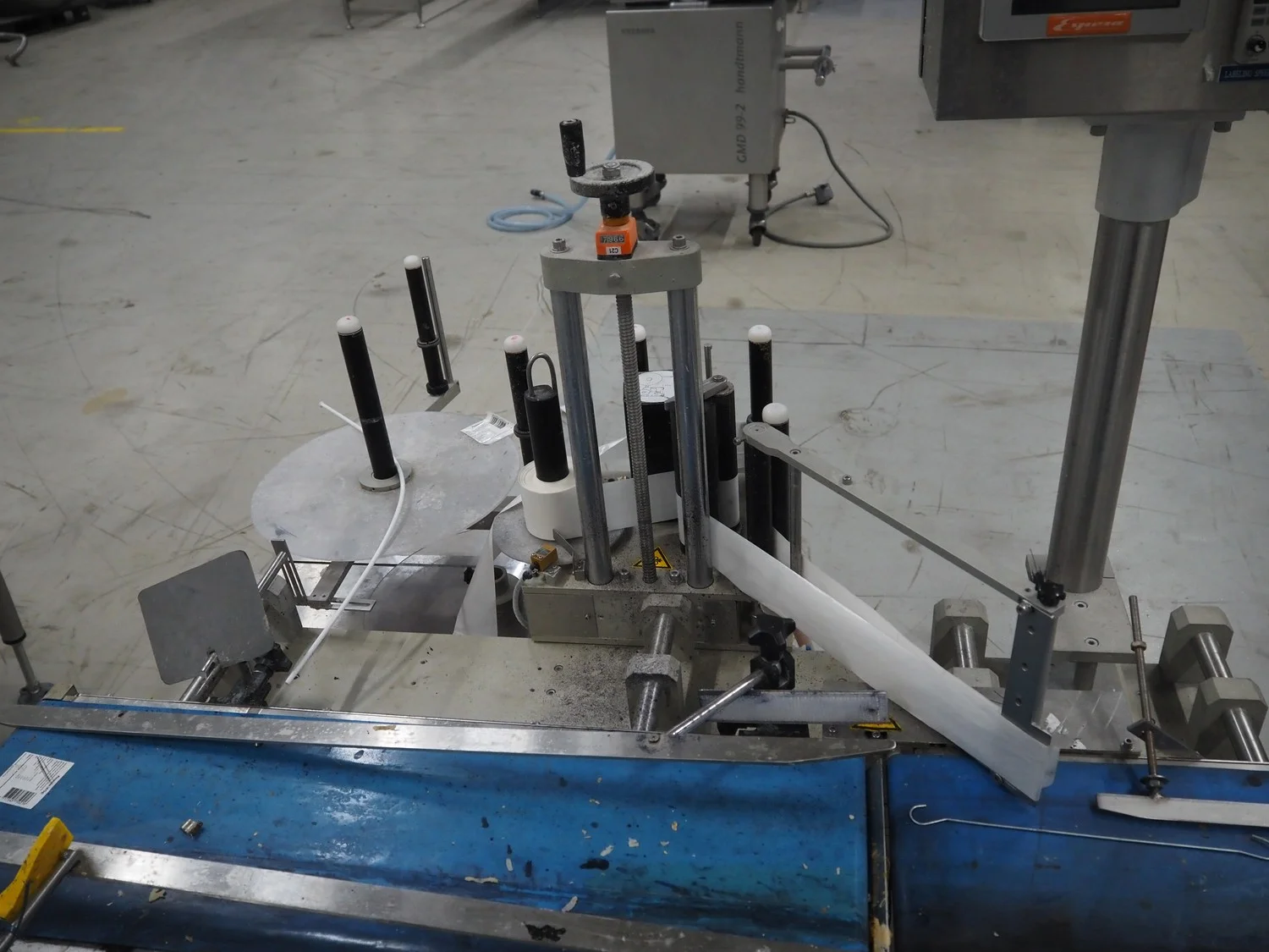 Espera label printer with bottom and side labeller, model: ES 1220, plastic belt, belt width: 300 mm, total dimensions: 1650 mm x 1350 mm x 1900 mm.