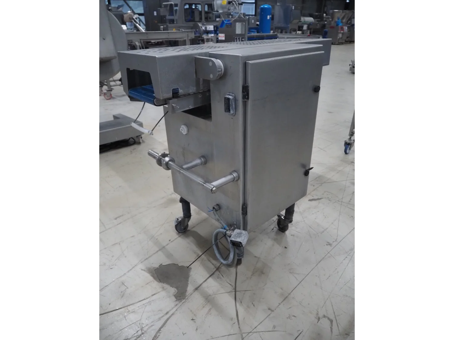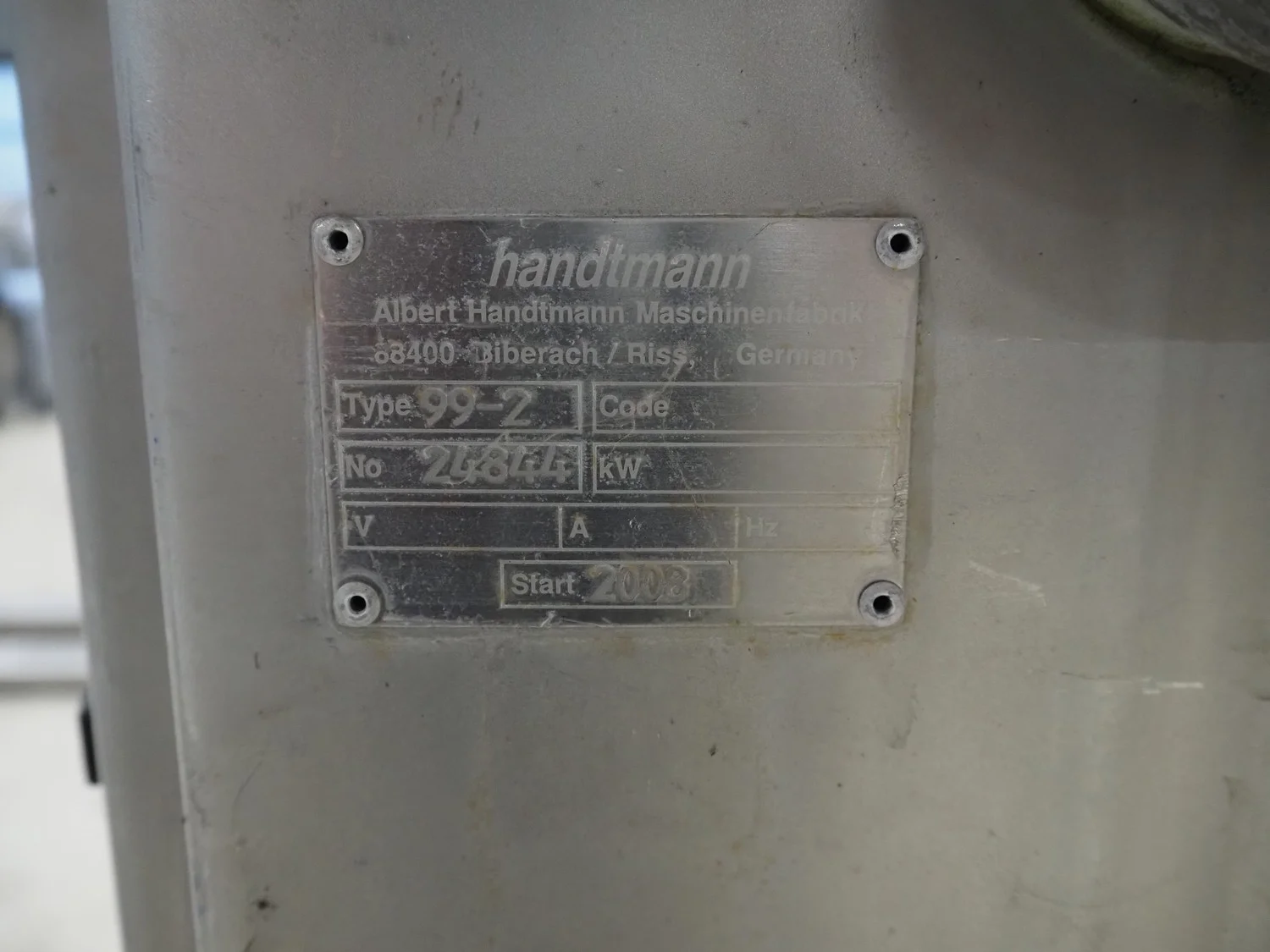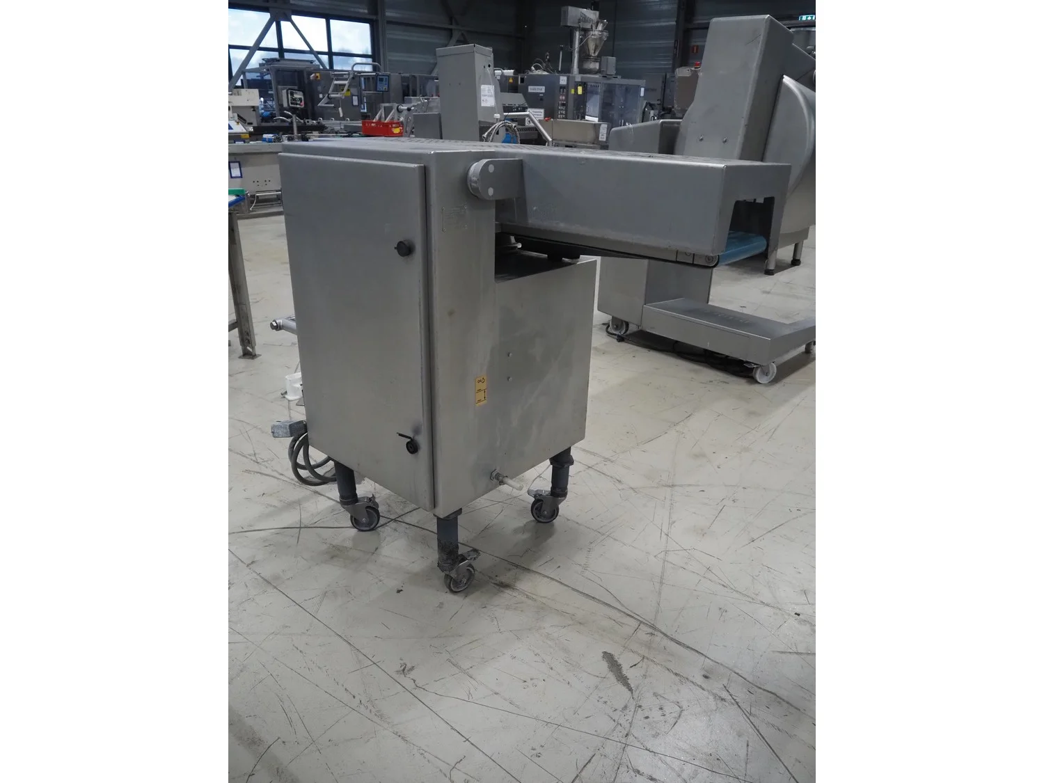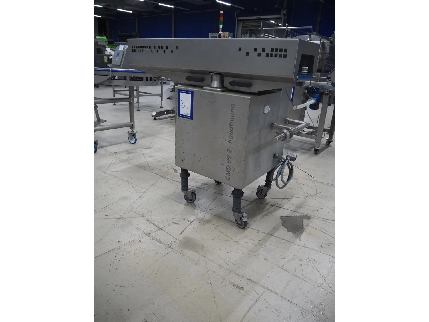 Handtmann mobile portioning machine, type: 99-2, number: 24844, year of construction: 2008, plastic belts, belt width: 250 mm, working width: 280 mm, total dimensions: 1420 mm x 650 mm x 1270 mm.