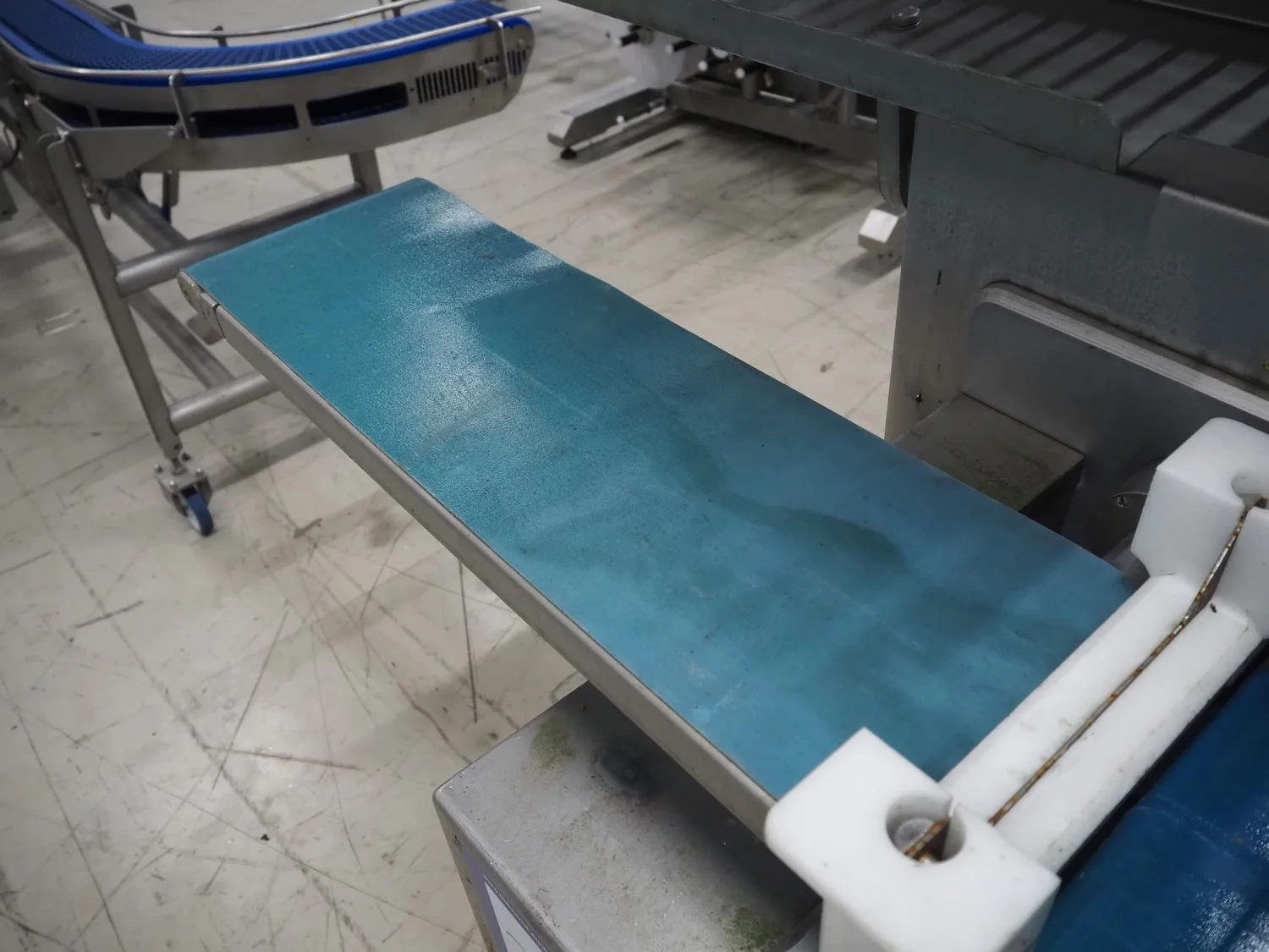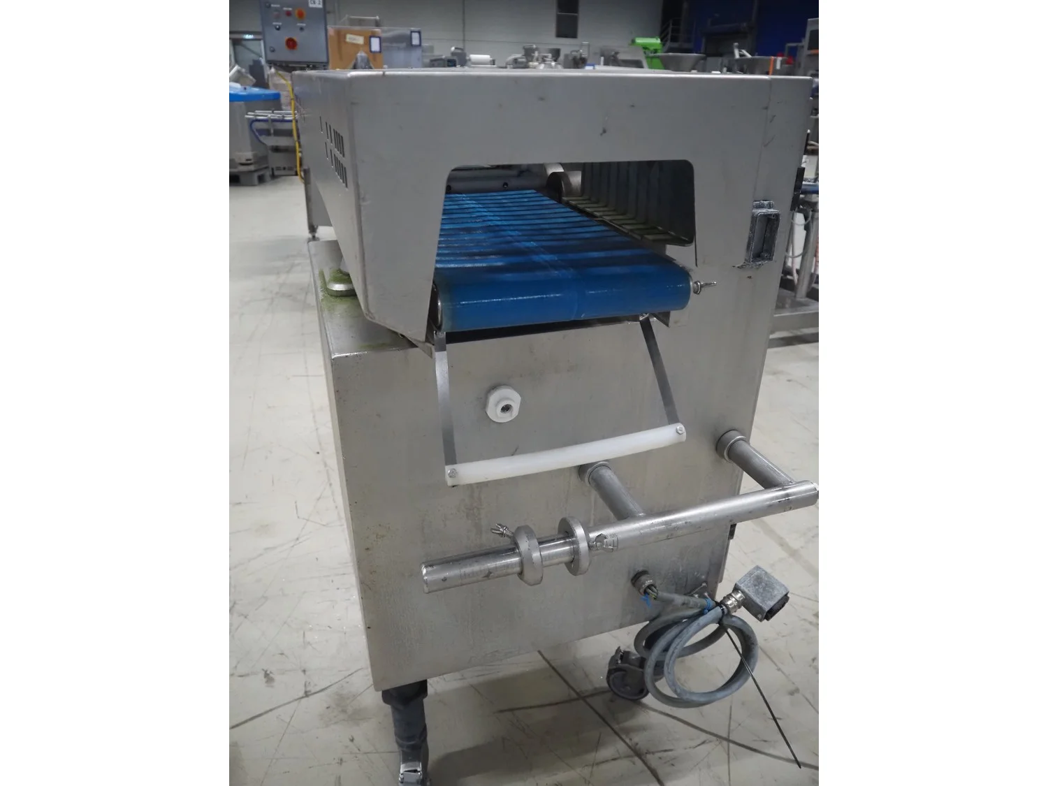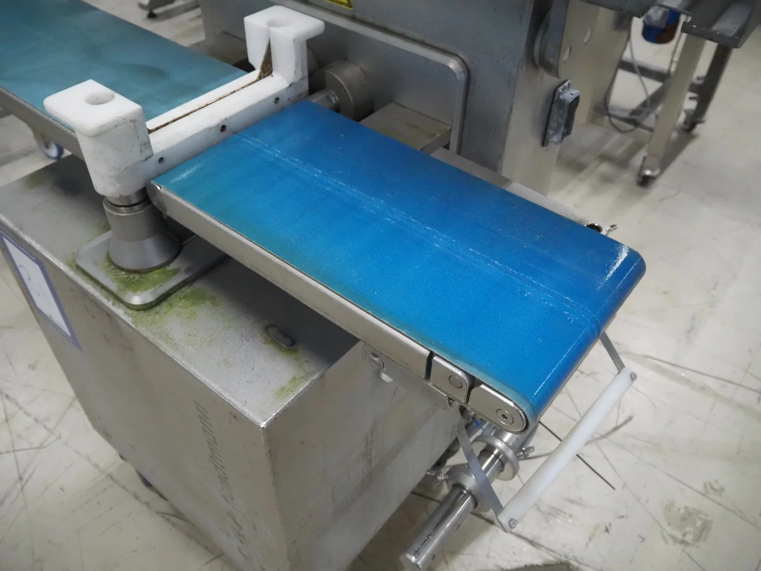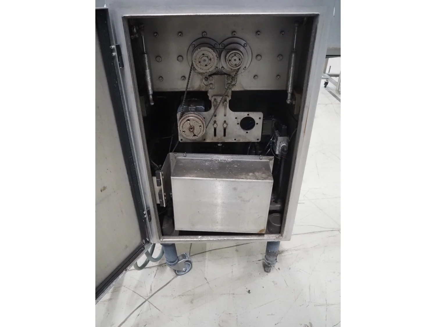 Handtmann mobile portioning machine, type: 99-2, number: 24844, year of construction: 2008, plastic belts, belt width: 250 mm, working width: 280 mm, total dimensions: 1420 mm x 650 mm x 1270 mm.
