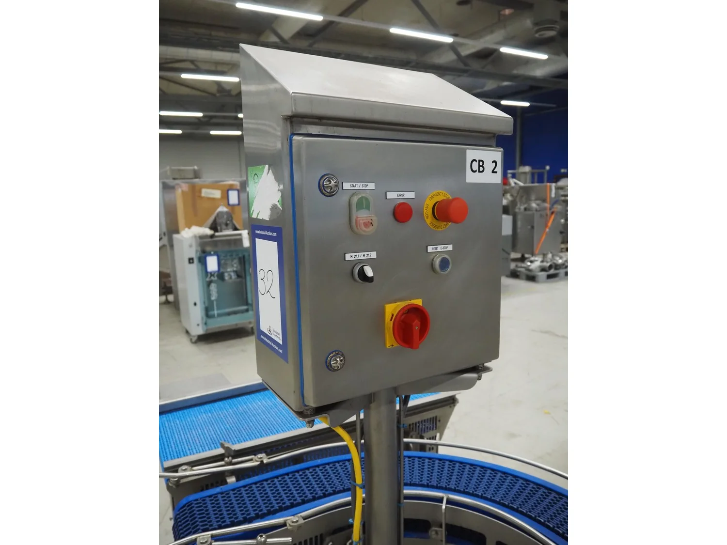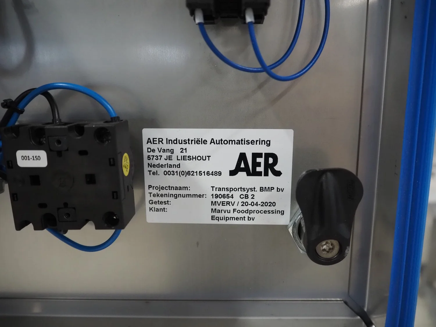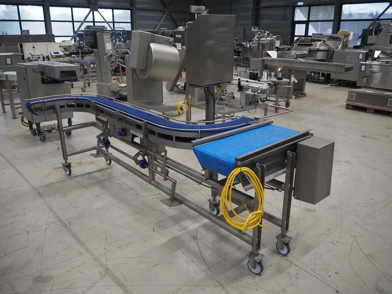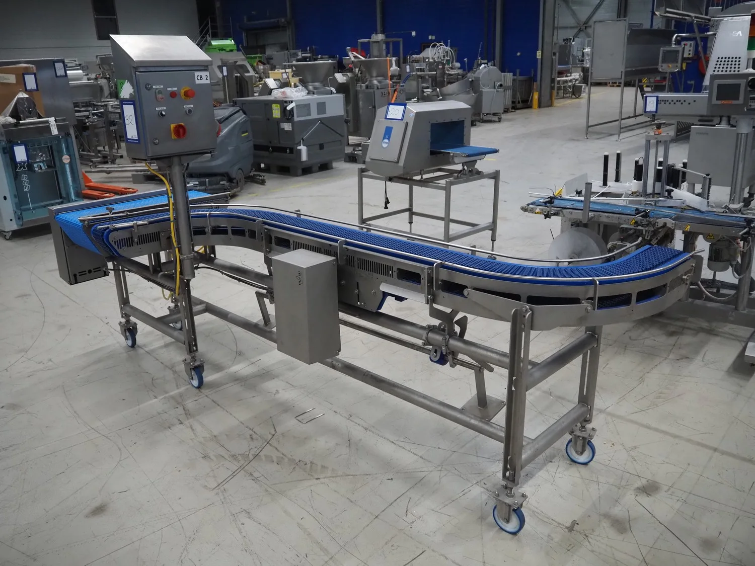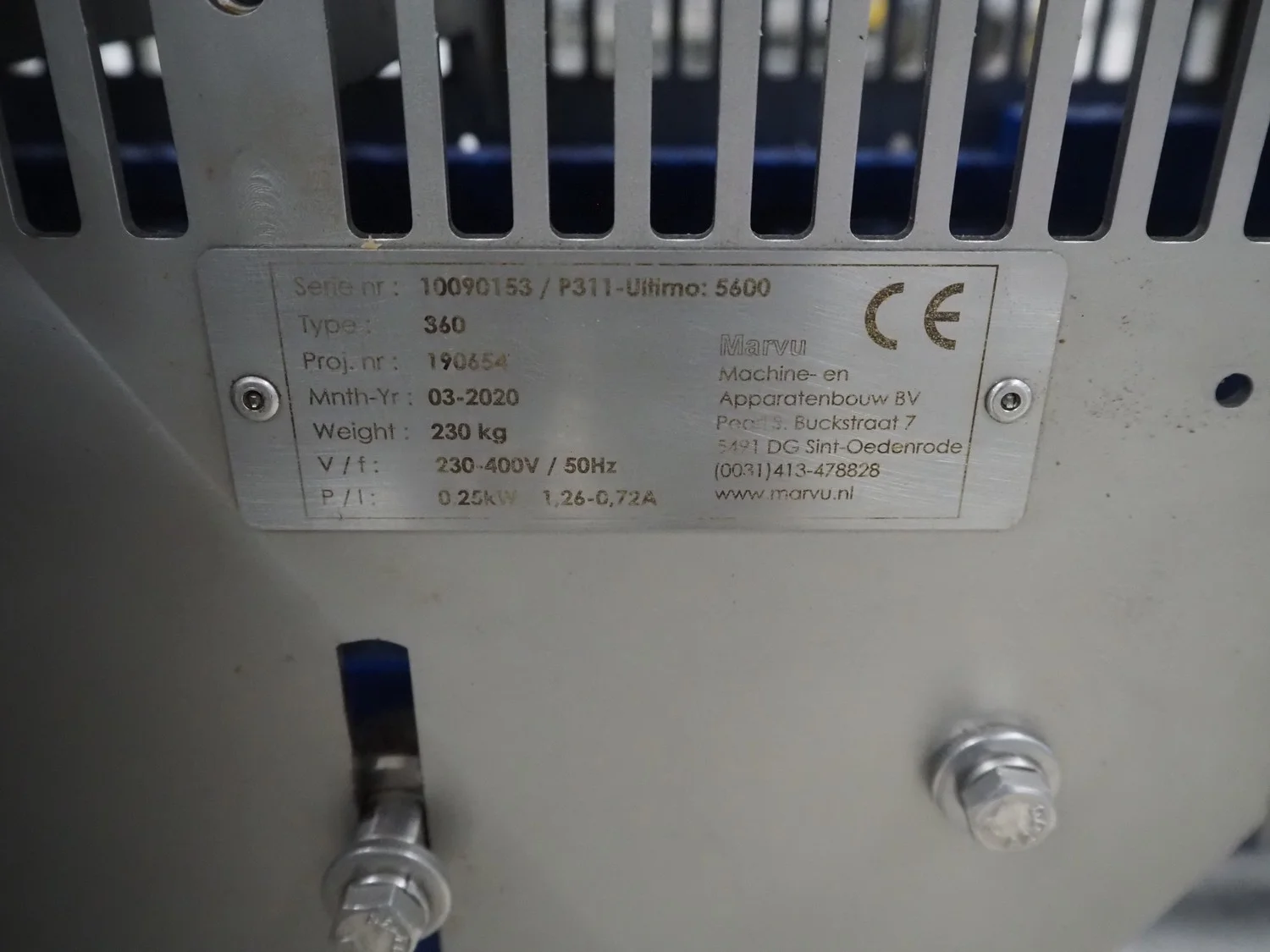 Marvu mobile S-shaped conveyor, type: 360, serial number: 10090153, year of construction: 03/2020, 230-400 V, 50 Hz, 1.26-0.72 A, 0.25 kW, s/s frame, plastic mesh belts, belt width: 150 mm and 380 mm, total dimensions: 3000 mm x 1500 mm x 1850 mm.