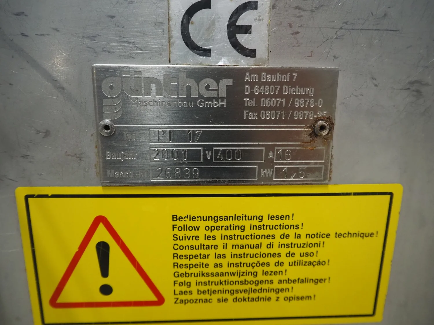 Günther mobile injector, type: PI 17, machine number: 26839, year of construction: 2001, 400 V, 16 A, 1.5 kW, plastic mesh belt, belt width: 250 mm, 17 needles, total dimensions: 1400 mm x 600 mm x 1800 mm.
