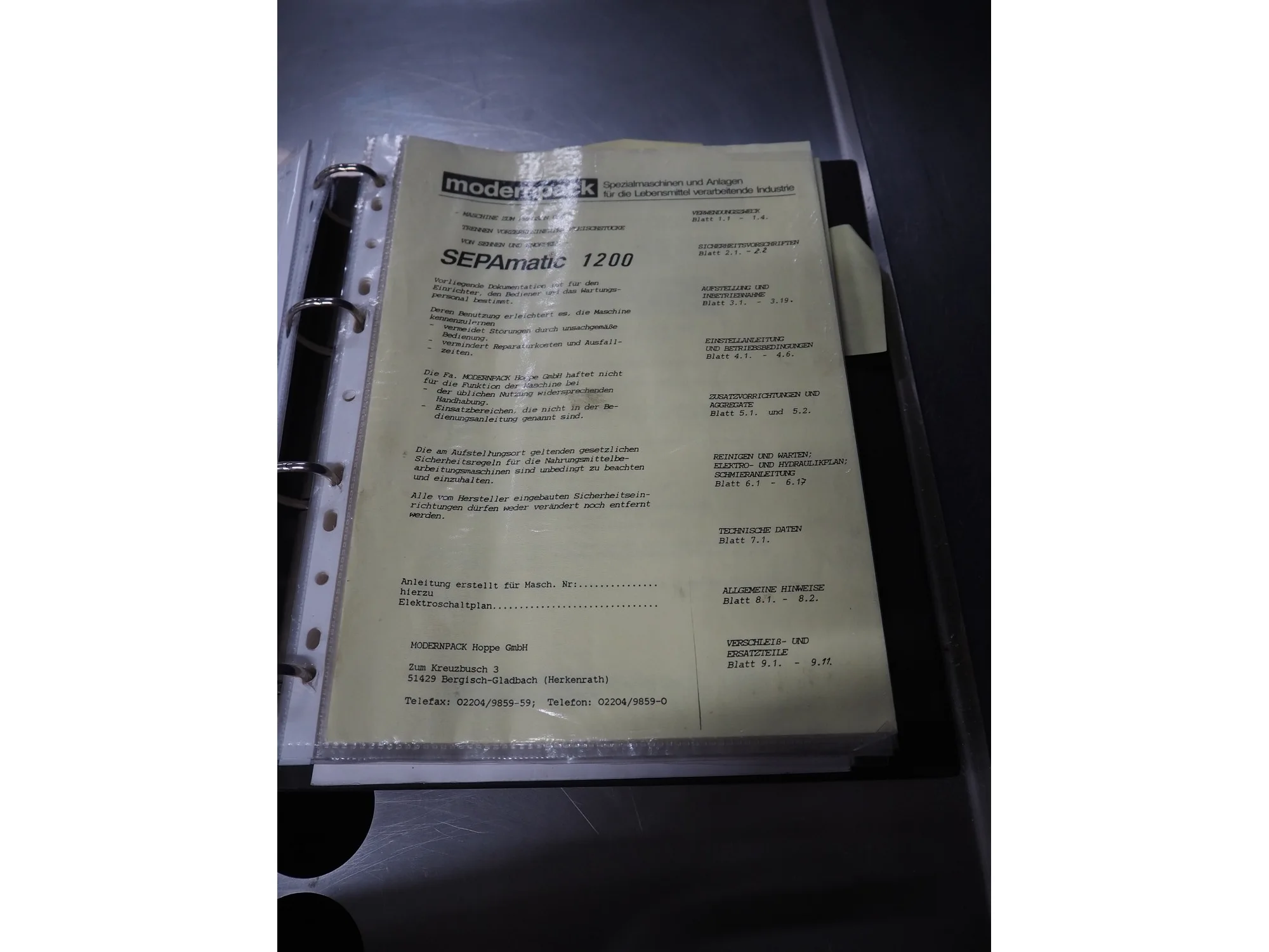 Sepamatic separator, type: SEPA 1200, machine number: 195559, 400 V, 50 Hz, 6 kW, diameter drum: 300 mm, diameter perforations: 2 mm, total dimensions: 1300 mm x 1170 mm x 1800 mm.