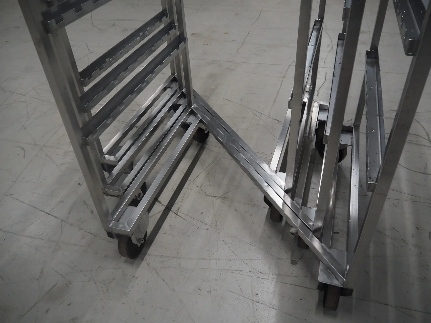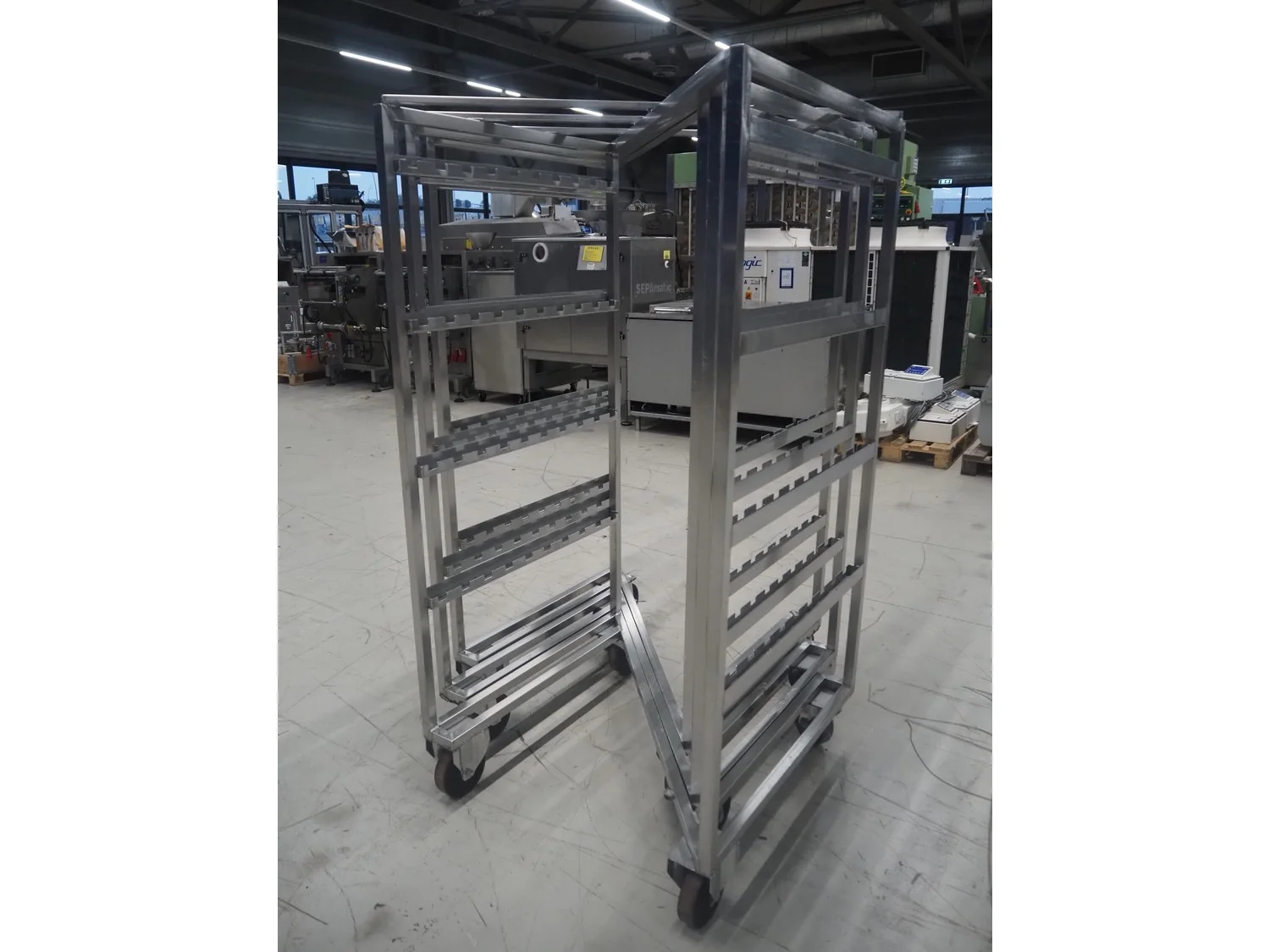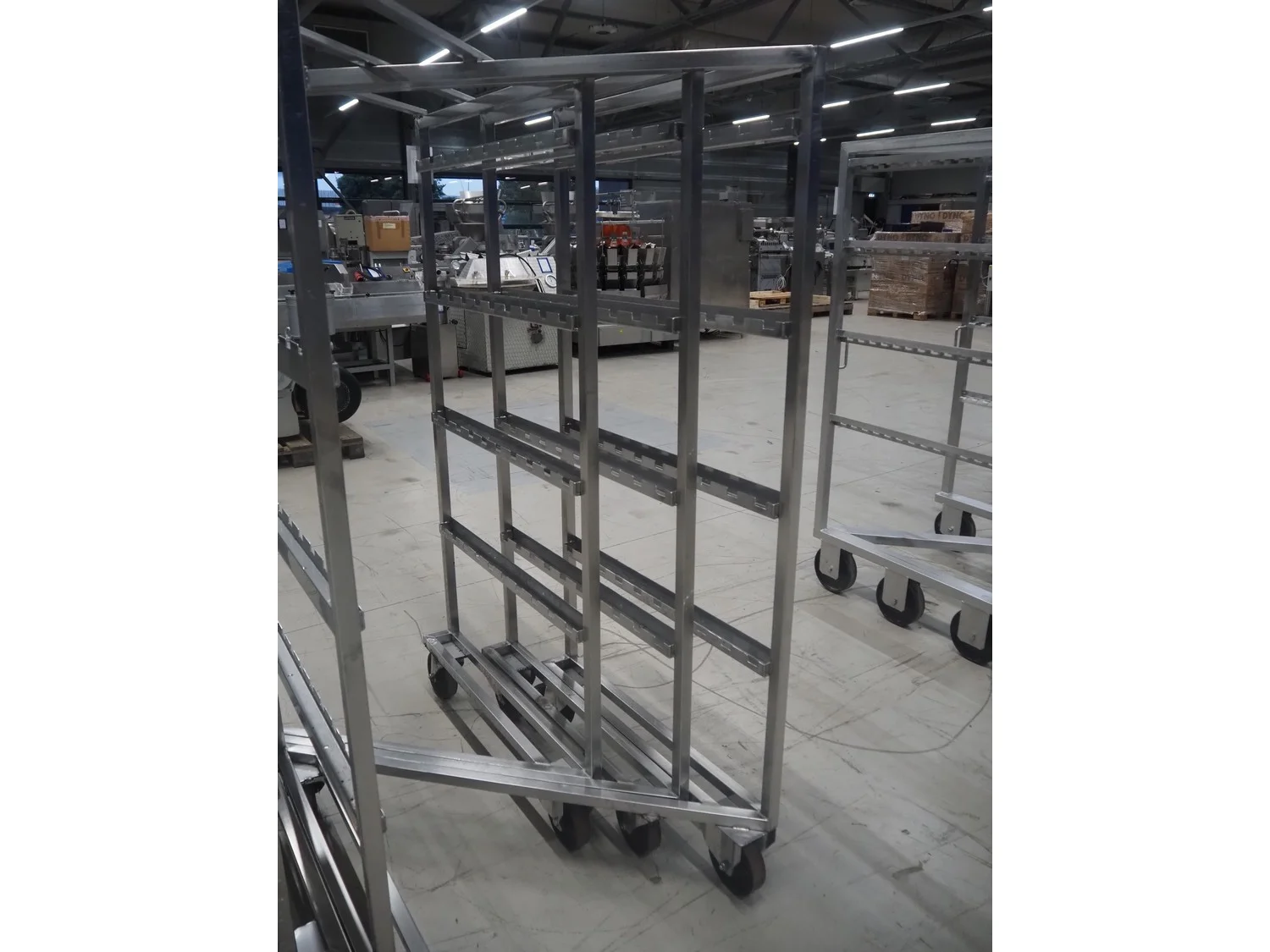3 s/s smoke trolleys, Z-profile, 4 floors, dimensions each floor: 900 mm x 900 mm, total dimensions: (3x) 900 mm x 900 mm x 1800 mm.