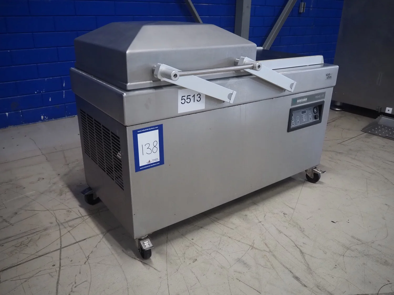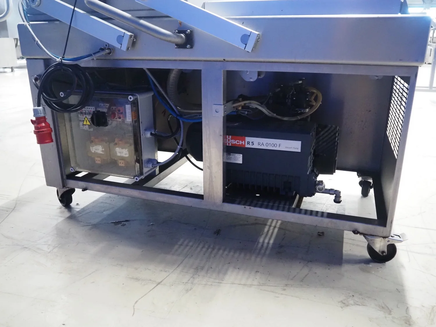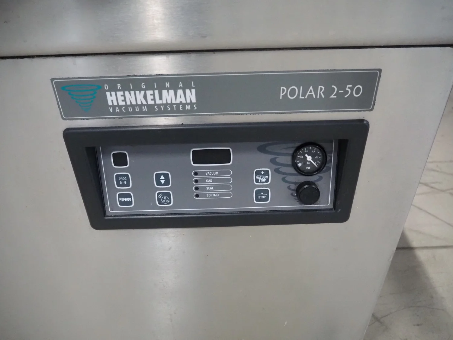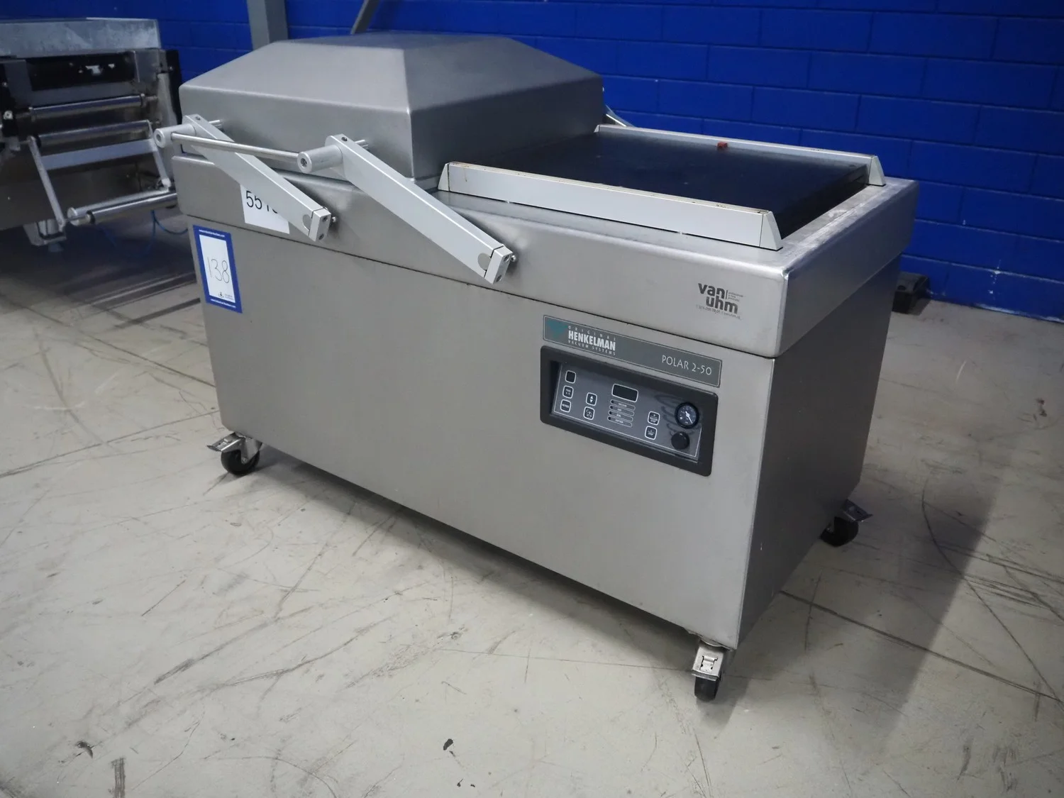 Henkelman mobile double chamber vacuum machine, type: Polar 2-50, machine number: H0P30190107, year of construction: 2019, 400 V, 3 Ph, 50 Hz, 11 A, 2.6 kW, Busch vacuum pump, type: RA 0100 F 5R3, serial number: DEM119290234, year of construction: 2019, capacity: 100 m³ per hour, seal width: (2x) 620 mm, dimensions chamber: 680 mm x 650 mm, total dimensions: 1500 mm x 1000 mm x 1050 mm.