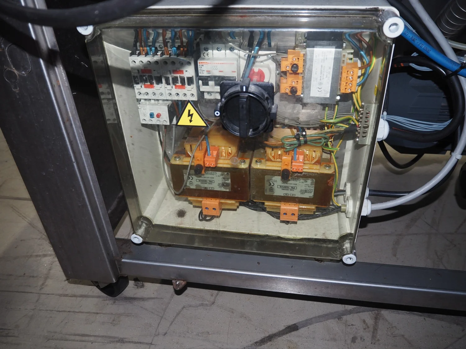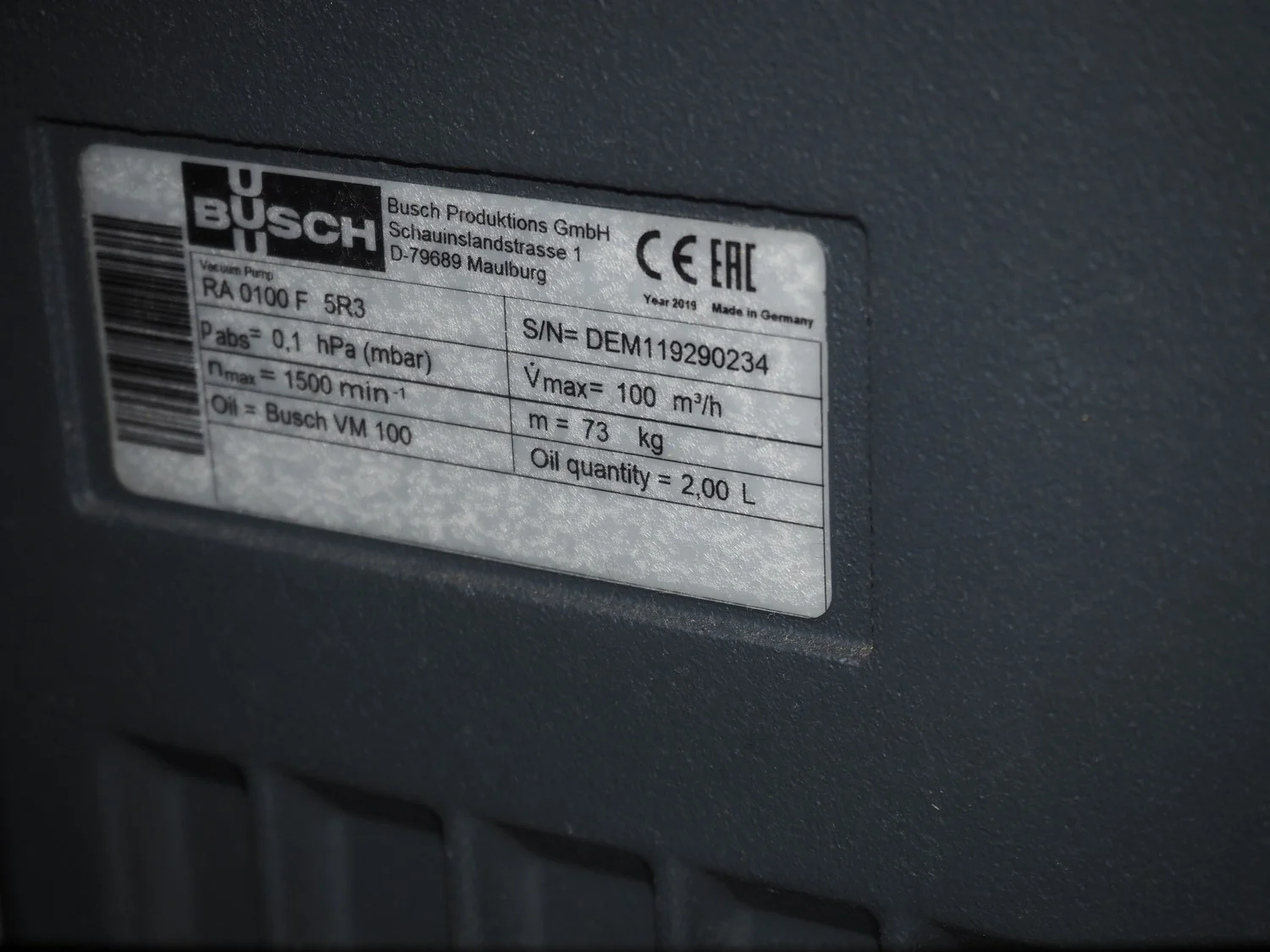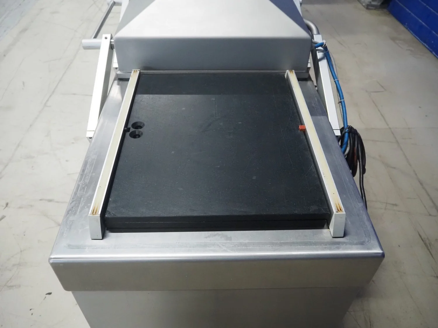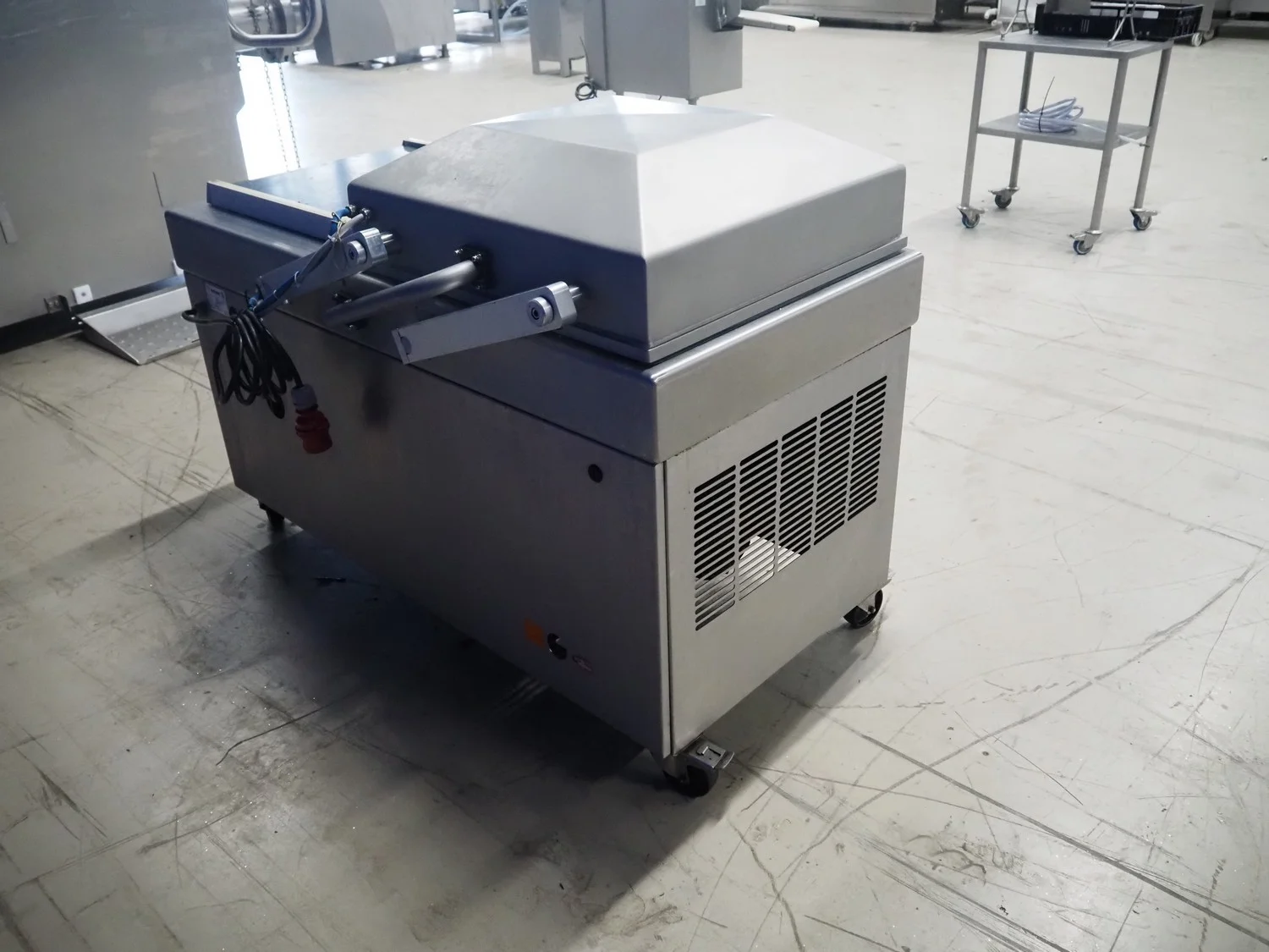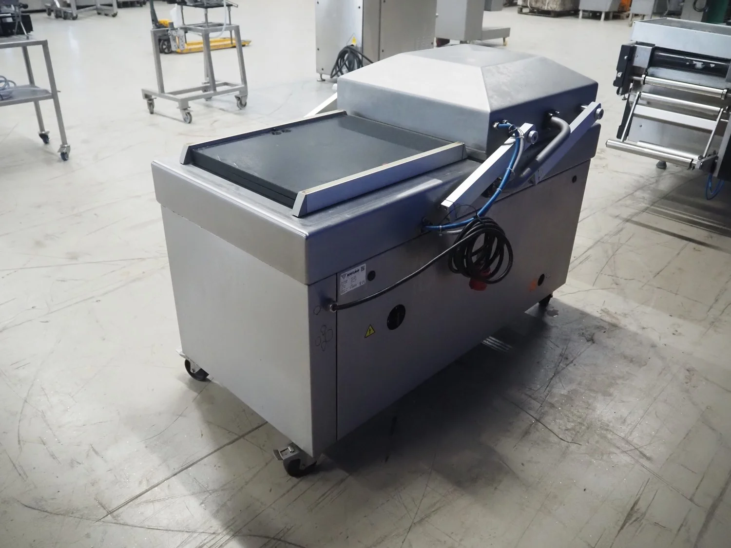 Henkelman mobile double chamber vacuum machine, type: Polar 2-50, machine number: H0P30190107, year of construction: 2019, 400 V, 3 Ph, 50 Hz, 11 A, 2.6 kW, Busch vacuum pump, type: RA 0100 F 5R3, serial number: DEM119290234, year of construction: 2019, capacity: 100 m³ per hour, seal width: (2x) 620 mm, dimensions chamber: 680 mm x 650 mm, total dimensions: 1500 mm x 1000 mm x 1050 mm.