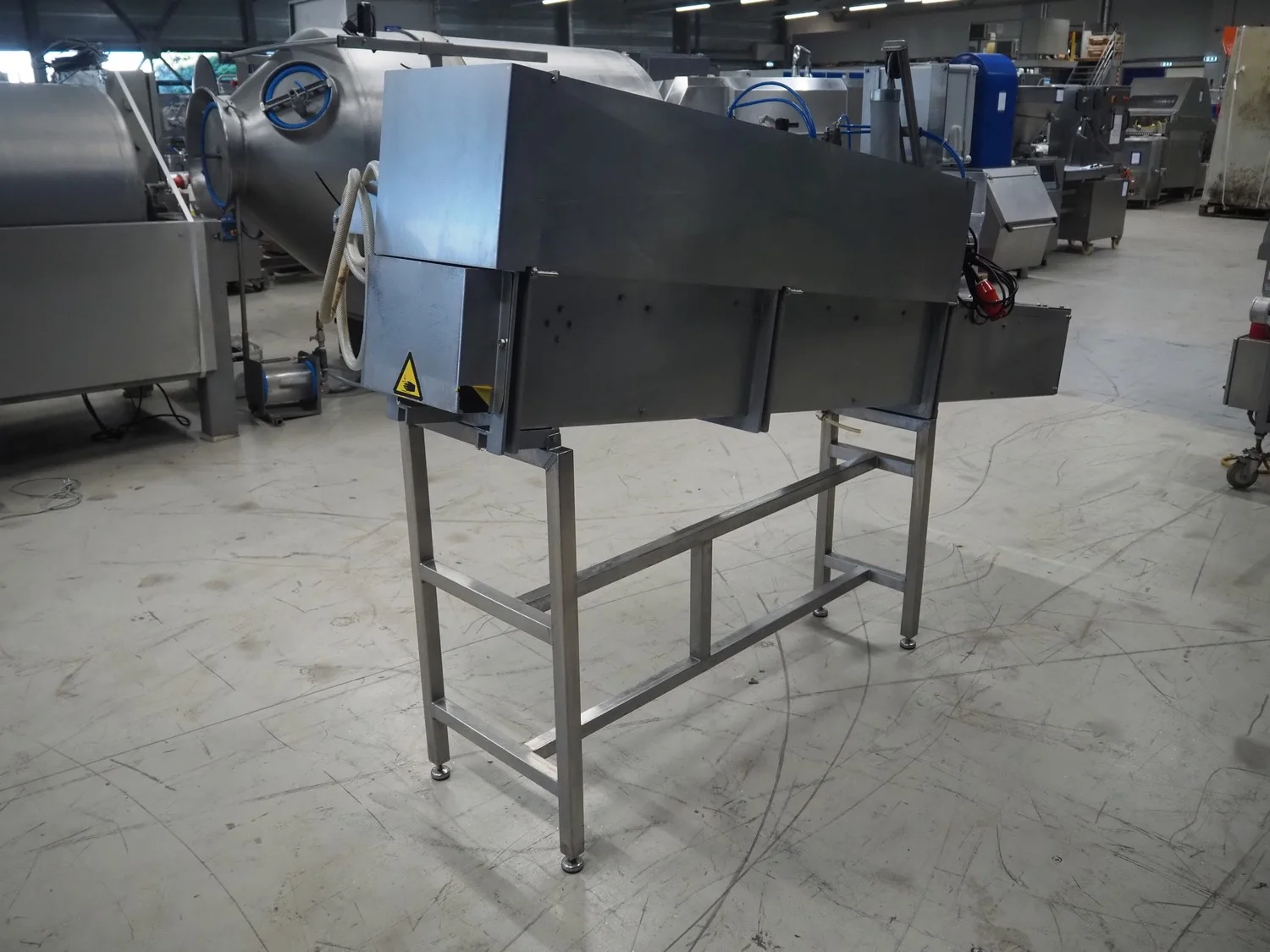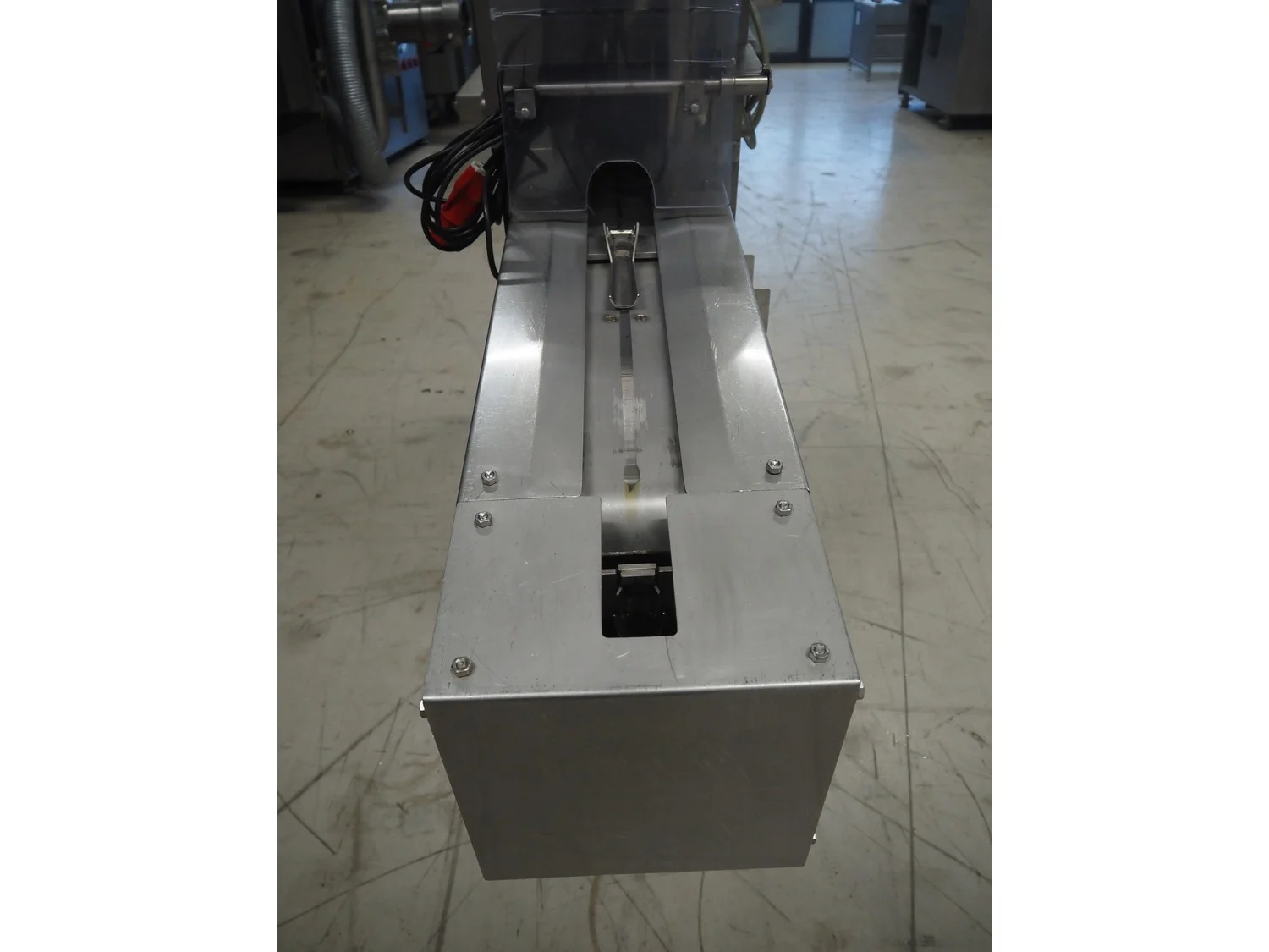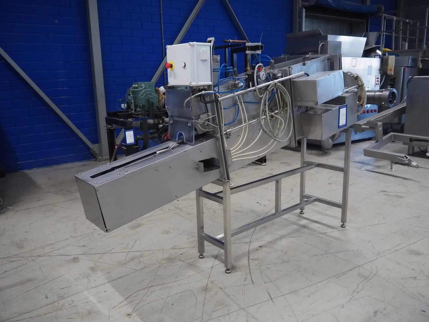 Boleto trout gutting machine, type: SM44, serial number: 44, year of construction: 2008, s/s conveyor with holders for fish, belt width: 90 mm, total dimensions: 2600 mm x 700 mm x 1770 mm.
