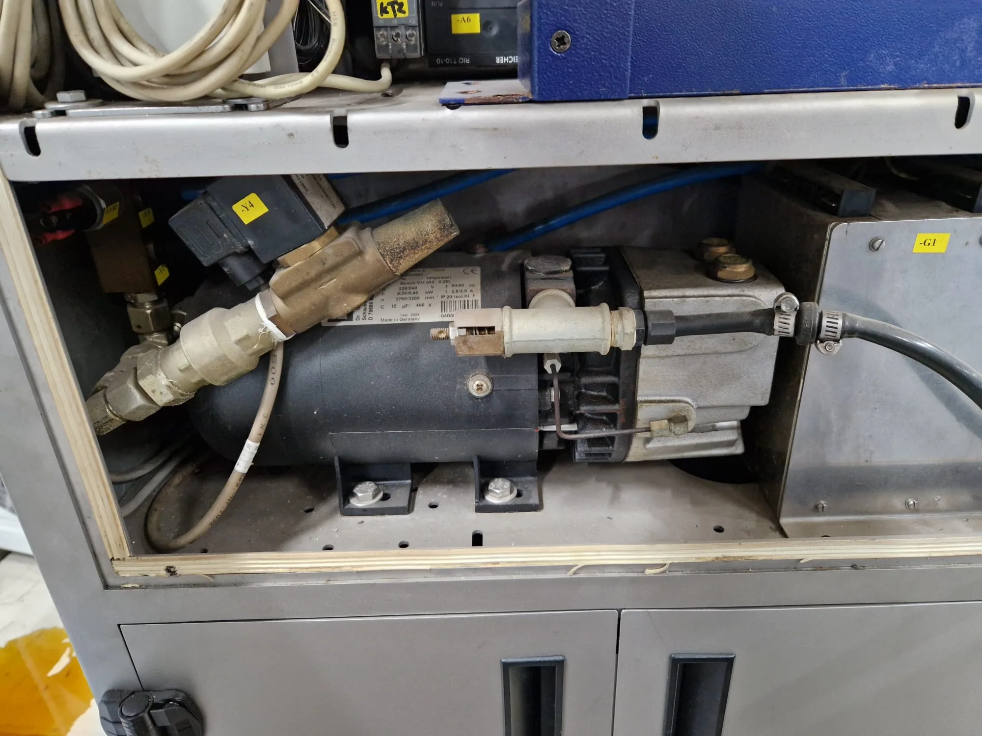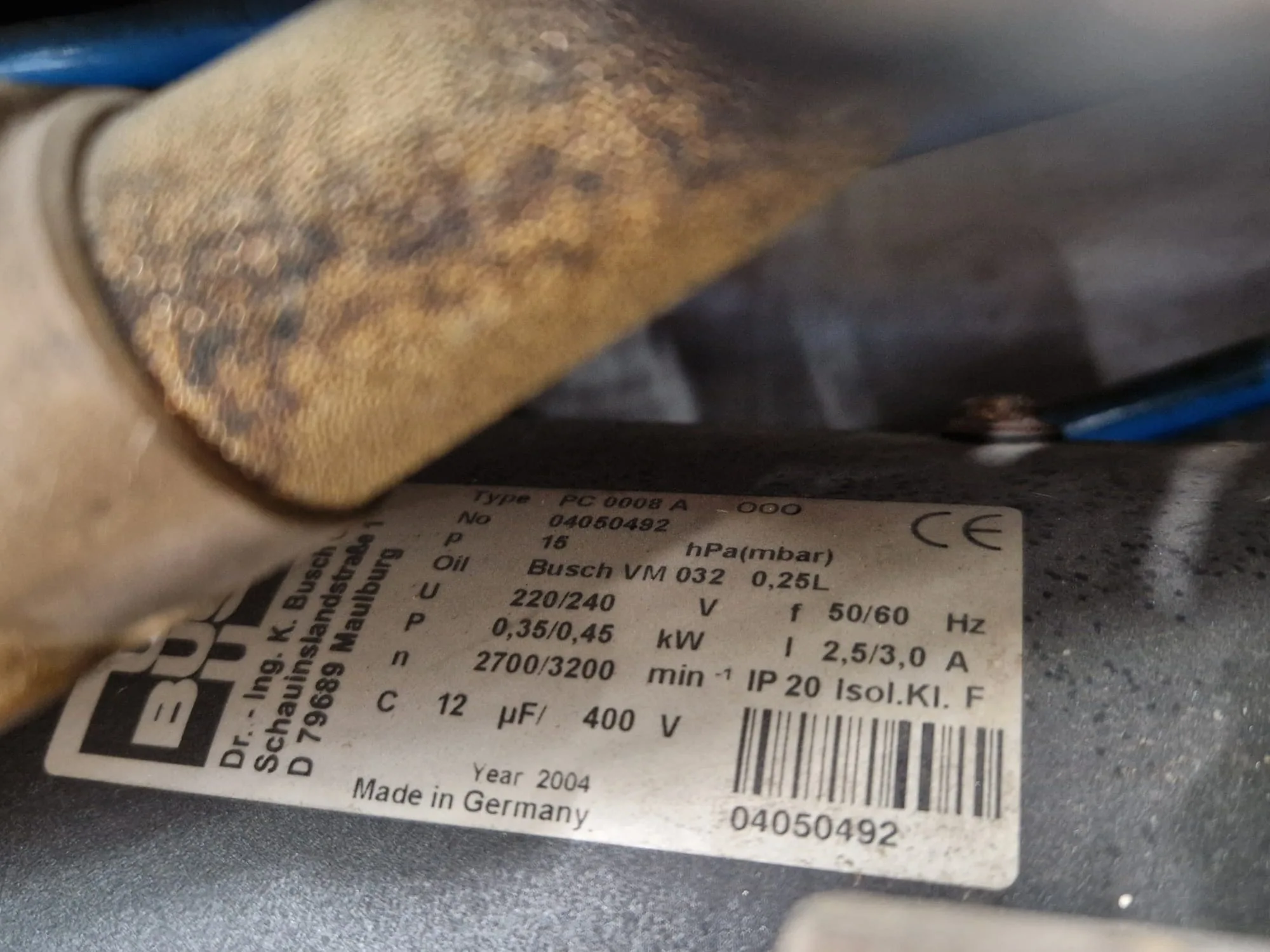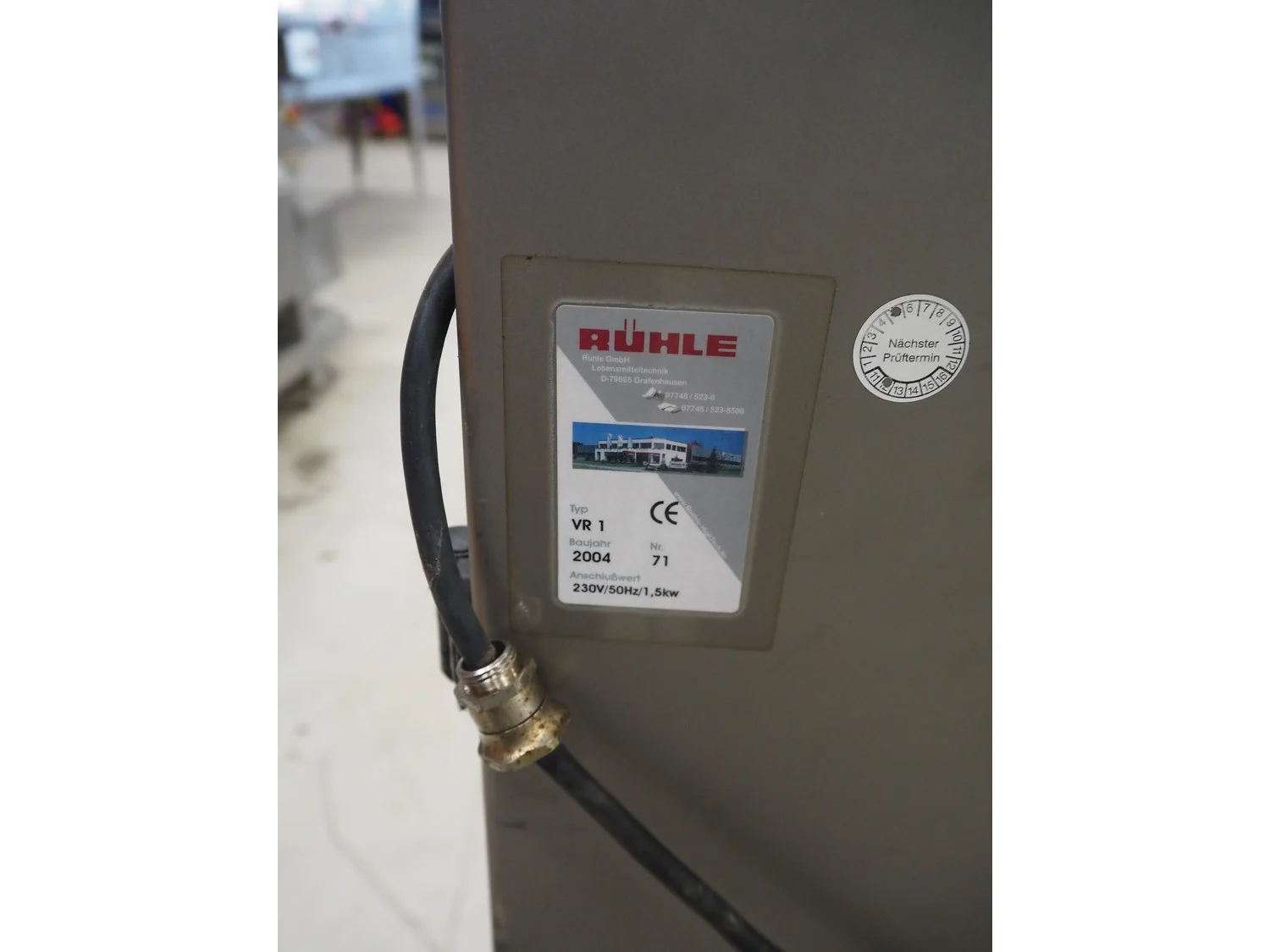 Rühle mobile traysealer with label printer, type: VR 1, number: 71, year of construction: 2004, 230 V, 50 Hz, 1.5 kW, dimensions dye: 300 mm x 240 mm, film width: 335 mm, with Busch vacuum pump, type: PC 0008 A, total dimensions: 650 mm x 700 mm x 1700 mm. Including 1 extra dye. Screen broken.