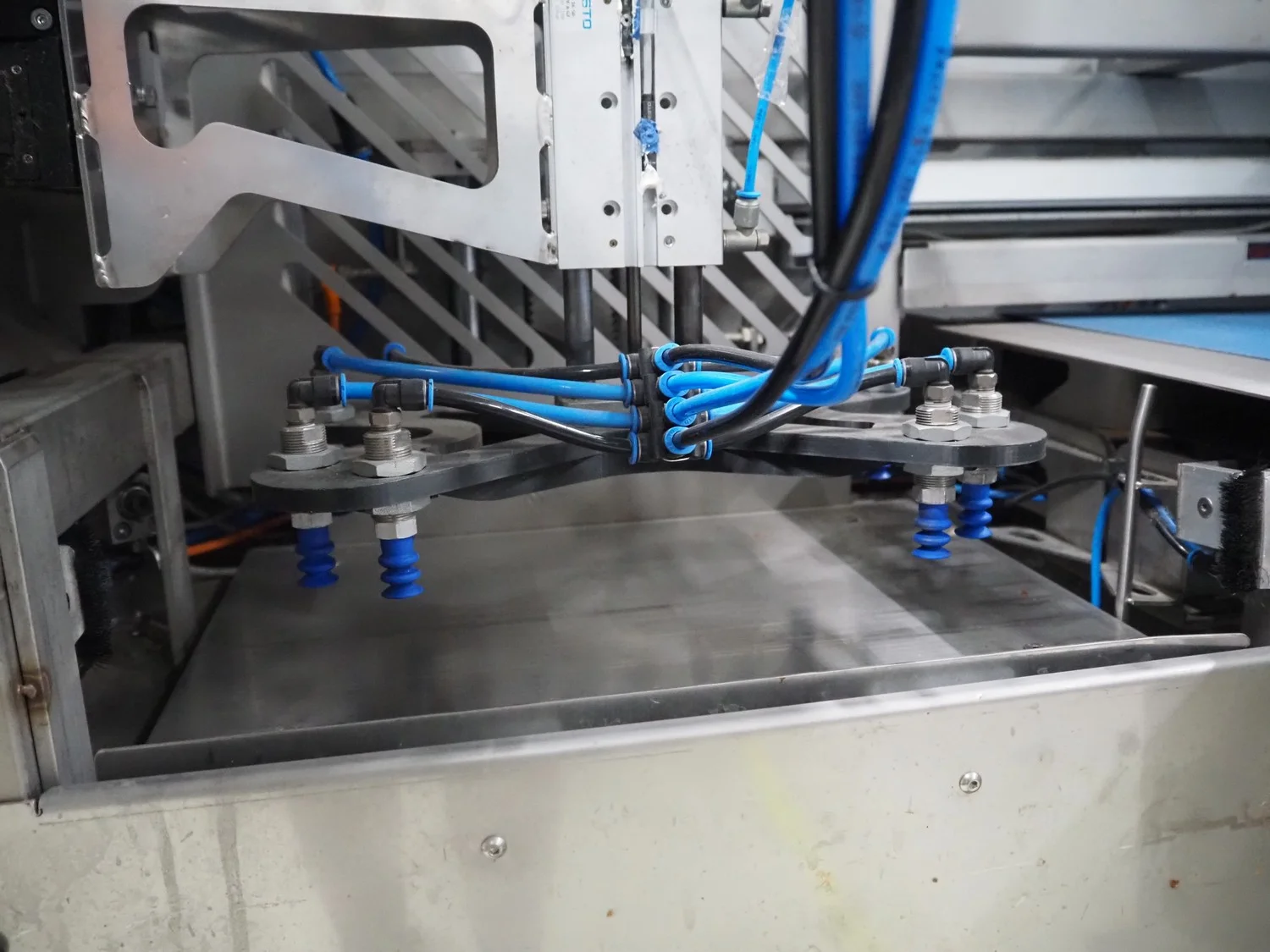 Freshtech Solutions tray denester, clearance: 400 mm x 300 mm, plastic belt, belt width: 380 mm, total dimensions: 1600 mm x 1030 mm x 1560 mm.