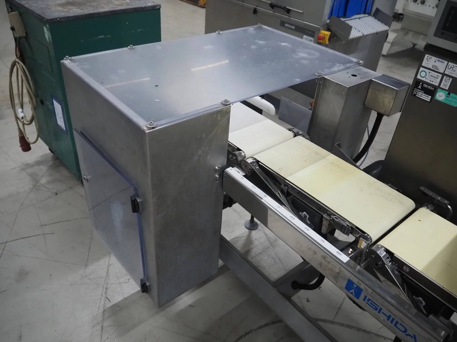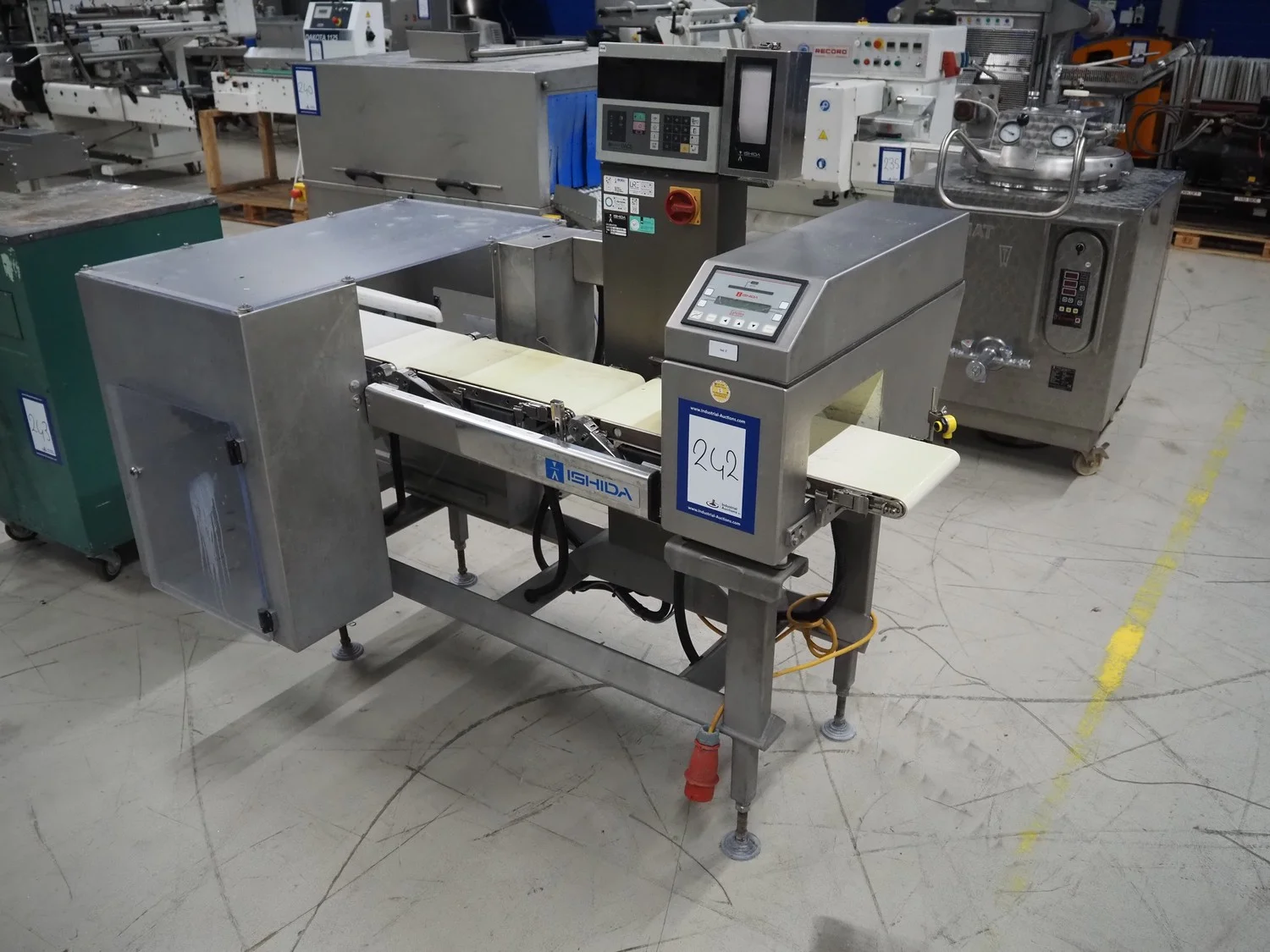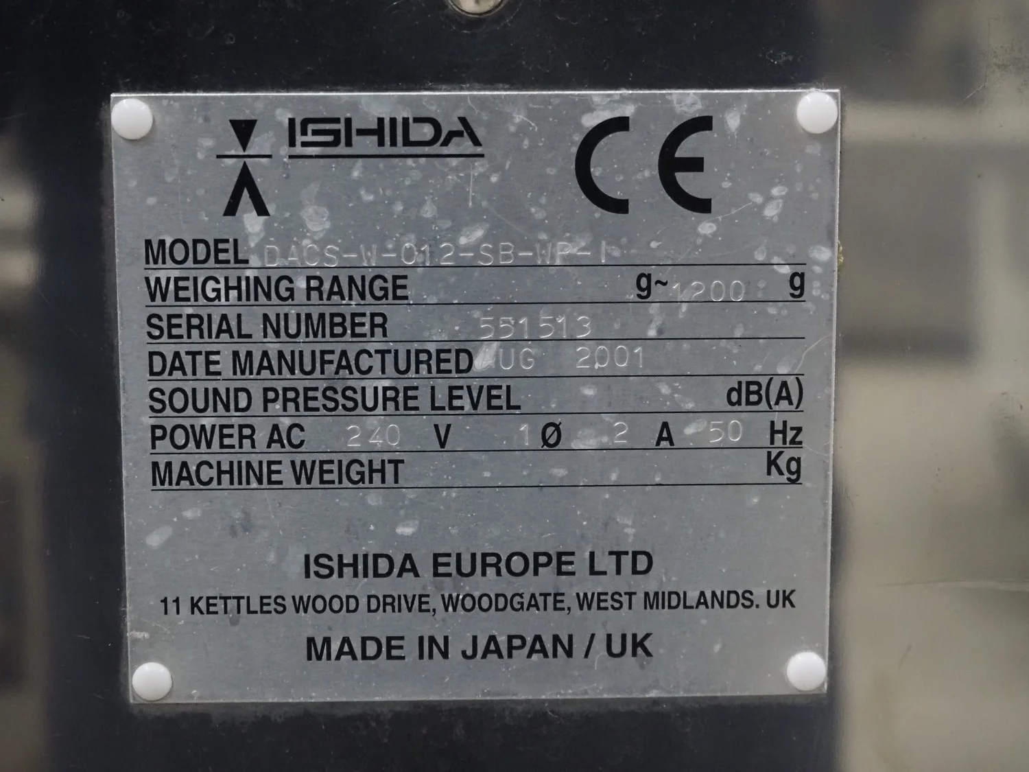 Ishida metal detector and checkweigher with rejecters, model: DACS-W-012-SB-WP-I, serial number: 551513, year of construction: 2001, 240 V, 1 Ph, 50 Hz, 2 A, clearance: 270 mm x 100 mm, plastic belt, belt width: (3x) 220 mm, total dimensions: 1670 mm x 1000 mm x 1470 mm.