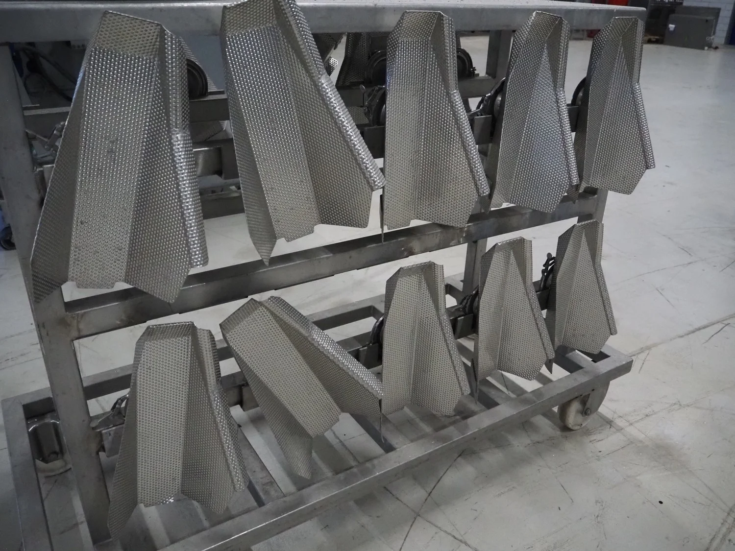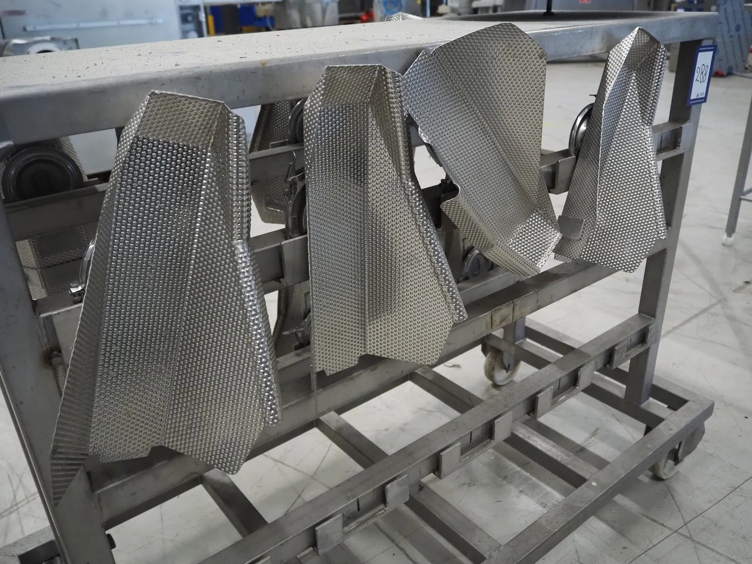 S/s trolley with parts for multihead weigher, dimensions: 1350 mm x 600 mm x 1100 mm.