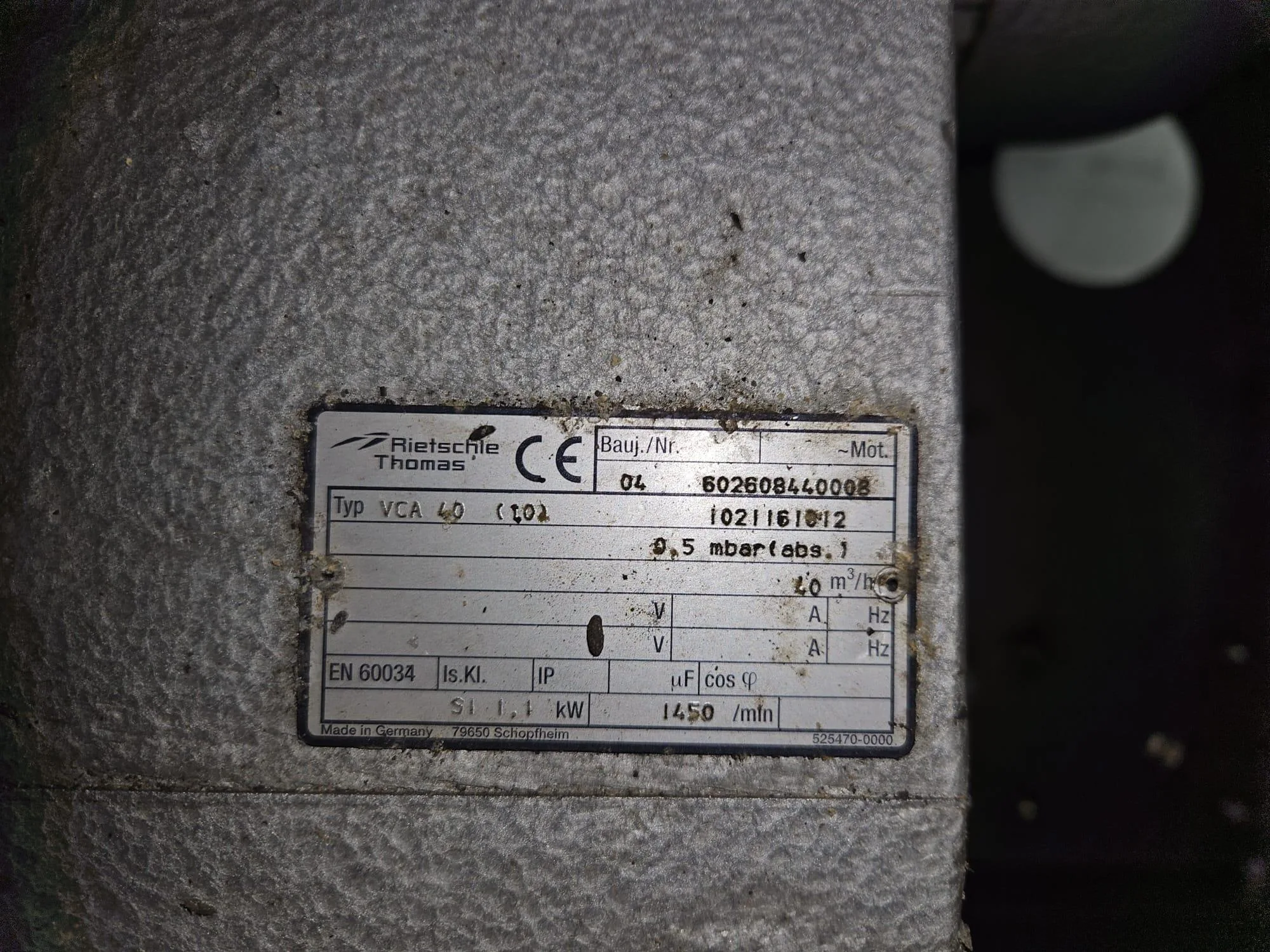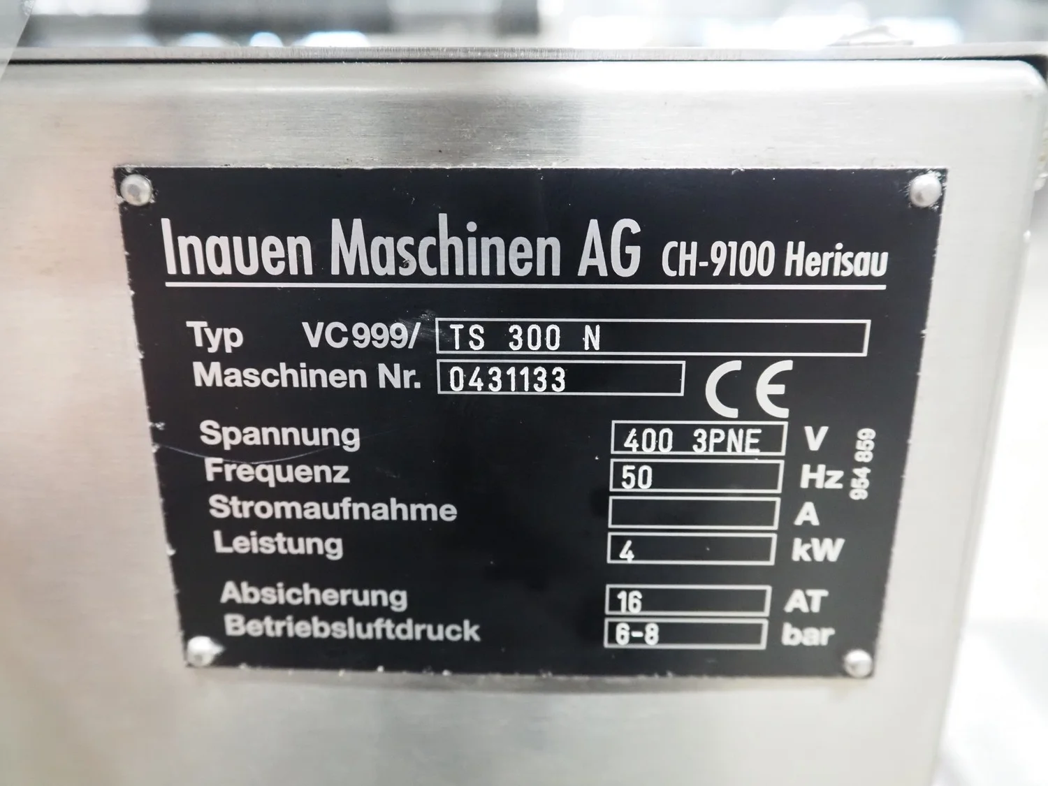 Inauen Maschinen AG mobile traysealer, model: VC999/TS 300 N, serial number: 0431133, 400 V, 3 Ph, 50 Hz, 16 A, dye: (2x) 185 mm x 135 mm, operating air pressure: 6–8 bar, Rietschle vacuum pump, type: VCA 40 (00), number: 602608440003, year of construction: 2004, capacity: 10 m³ per hour, total dimensions: 1120 mm x 600 mm x 1610 mm.