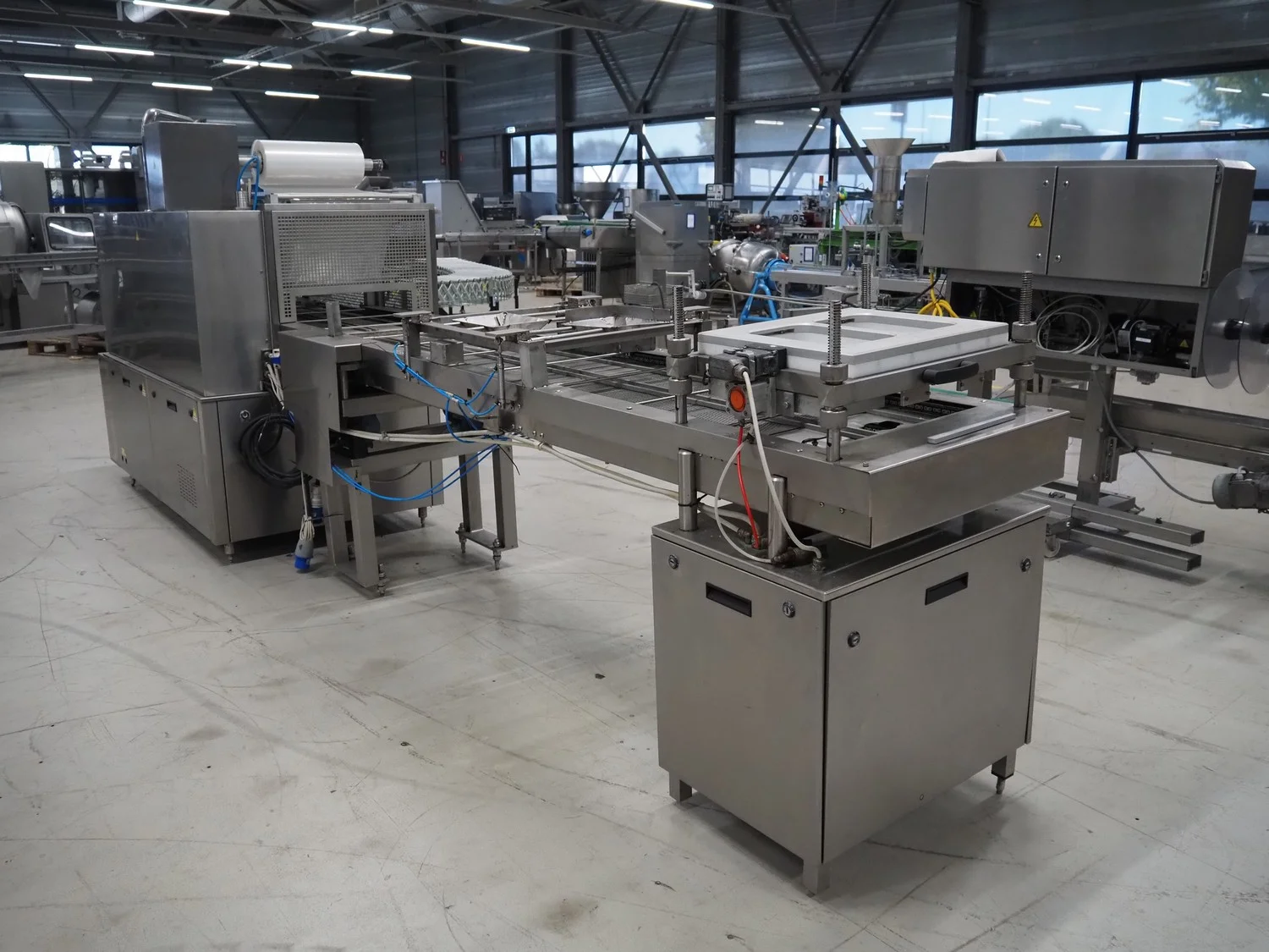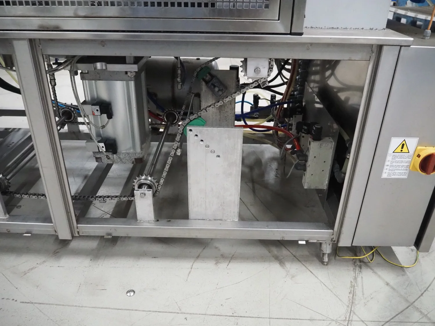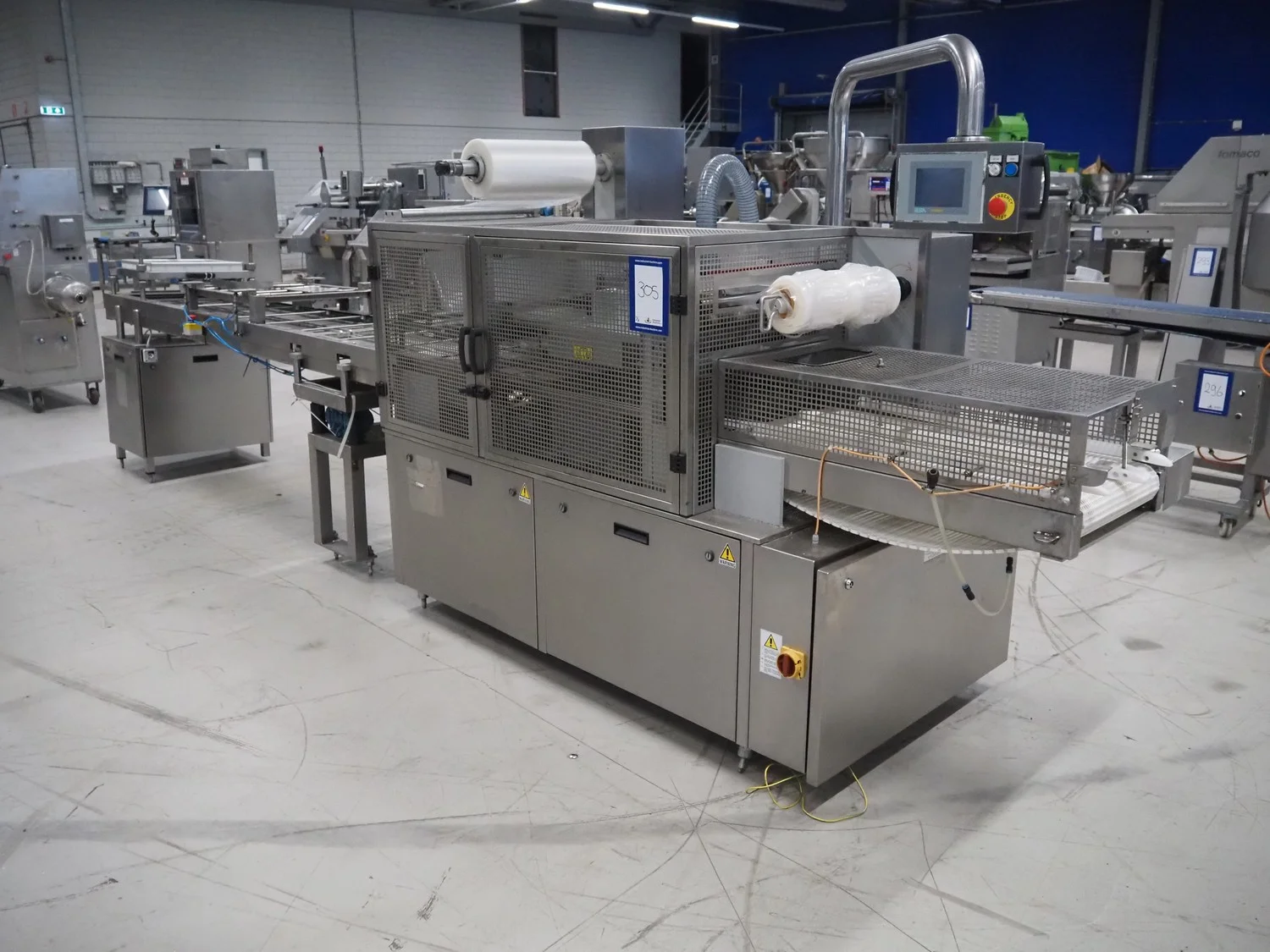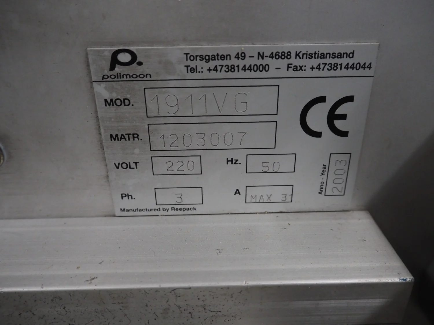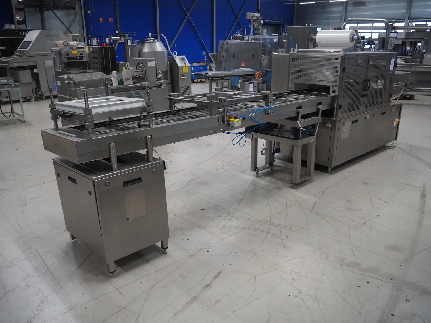 Polimoon traysealer, model: 1911VG, serial number: 1203007, year of construction: 2003, 220 V, 3 Ph, 50 Hz, 31 A, dye: (2x) 250 mm x 150 mm, film width: 430 mm, total dimensions: 5550 mm x 1000 mm x 1900 mm.