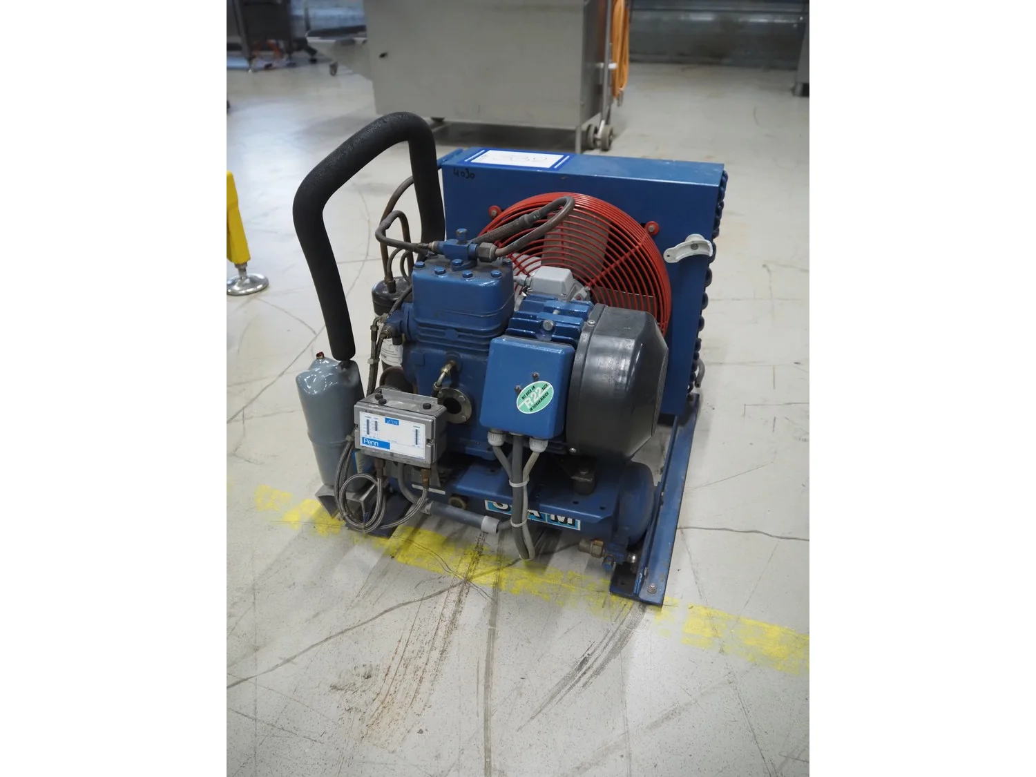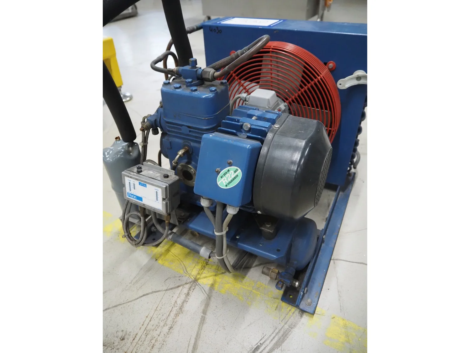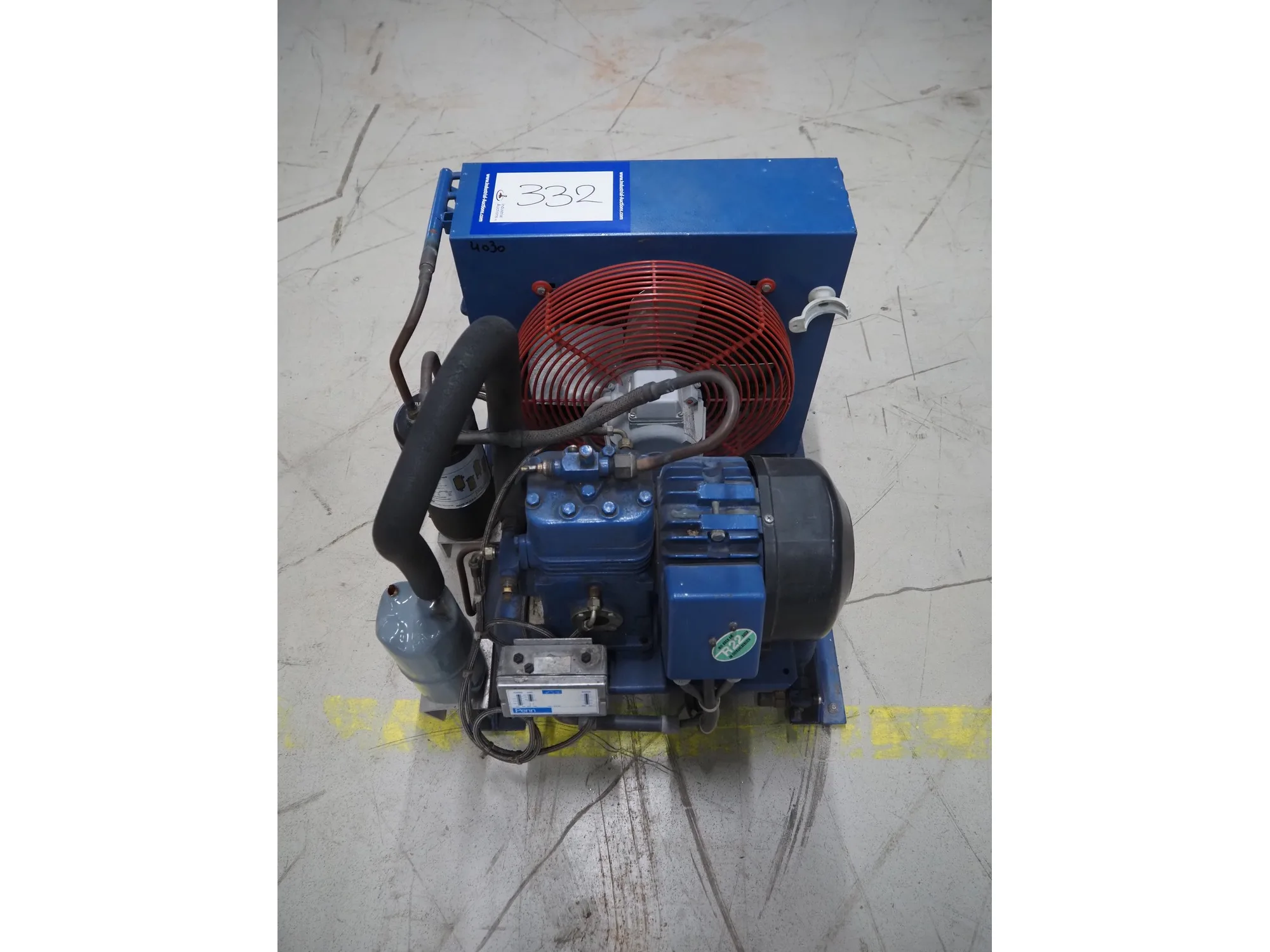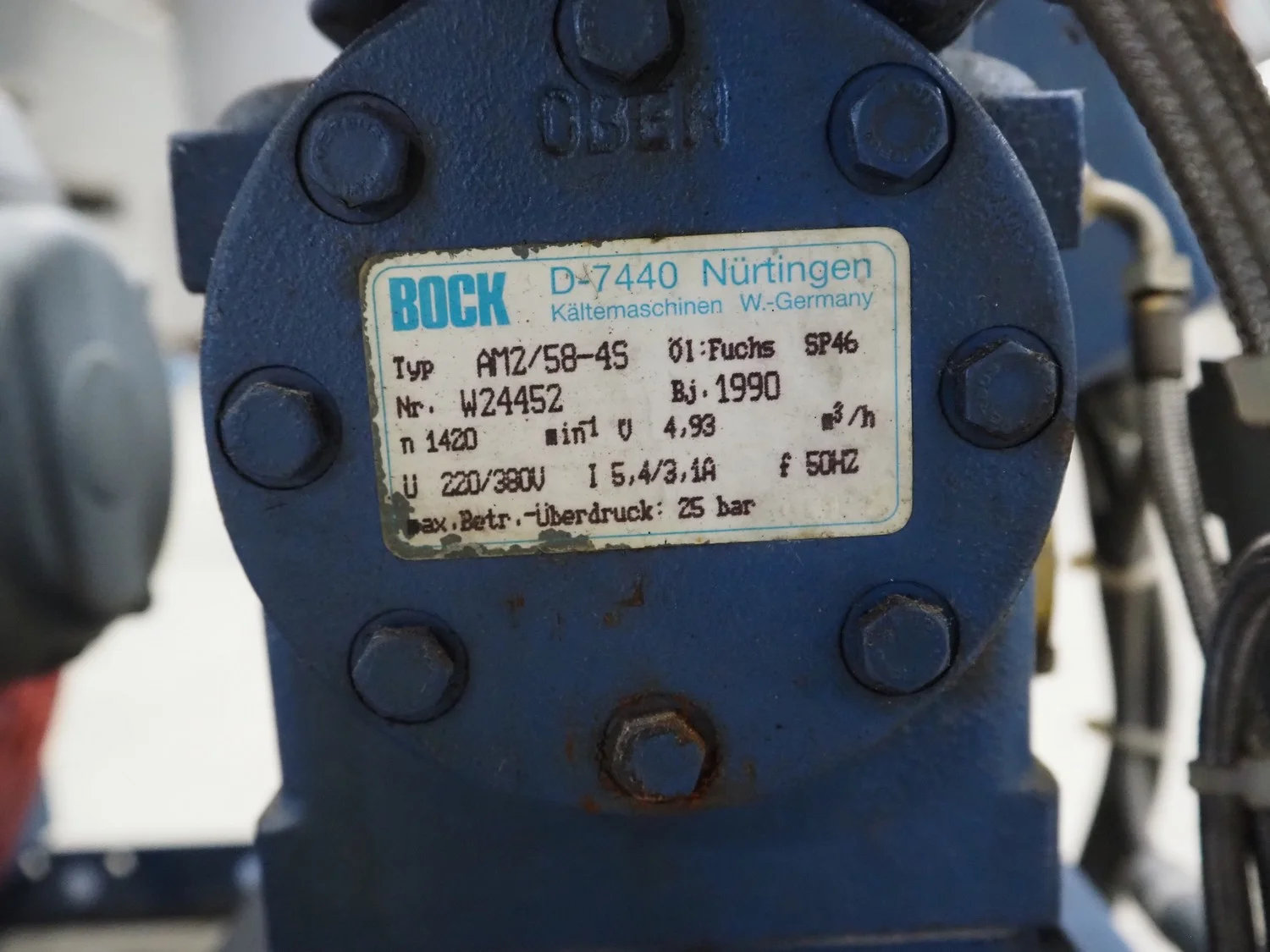 Bock condensing unit with cooling compressor, type: AM2/58-4S, number: W24452, year of construction: 1990, 220/380 V, 50 Hz, 5.4/3.1 A, capacity: 4.93 m³ per hour, dimensions: 650 mm x 550 mm x 630 mm.