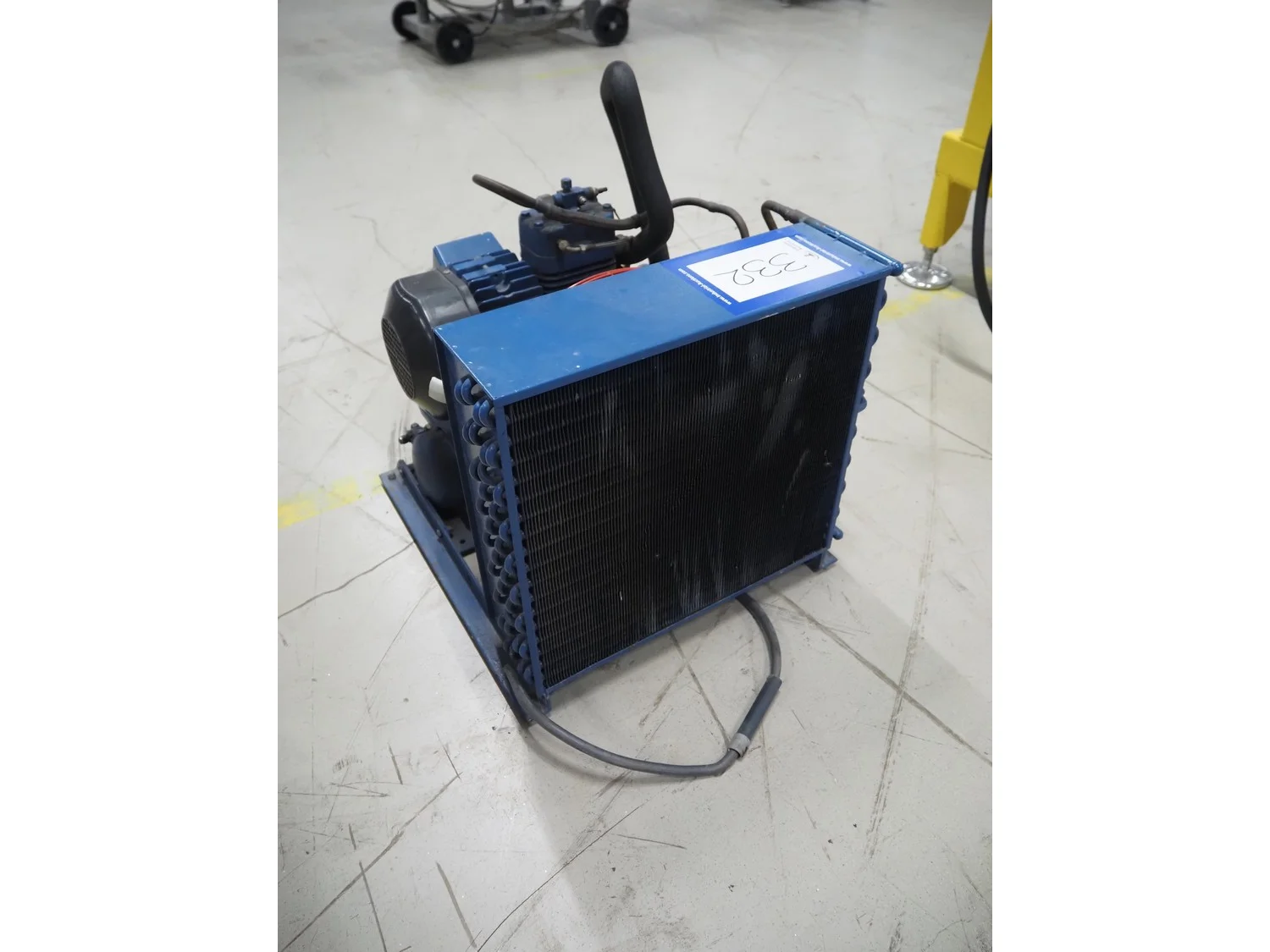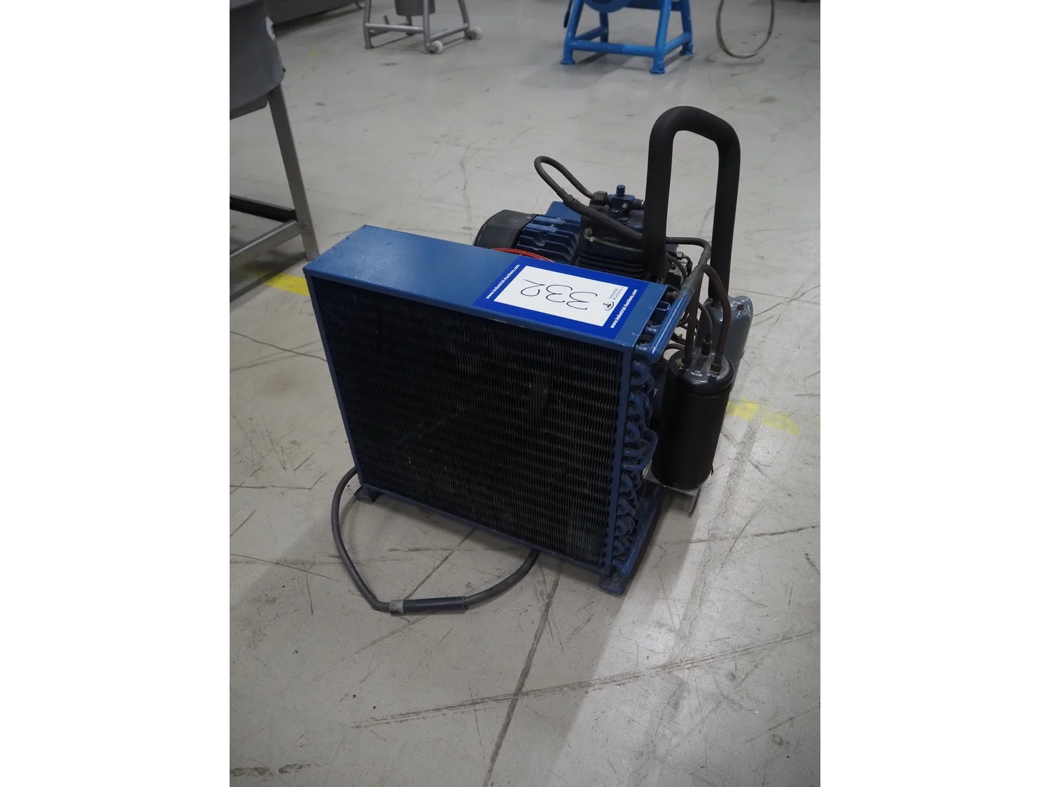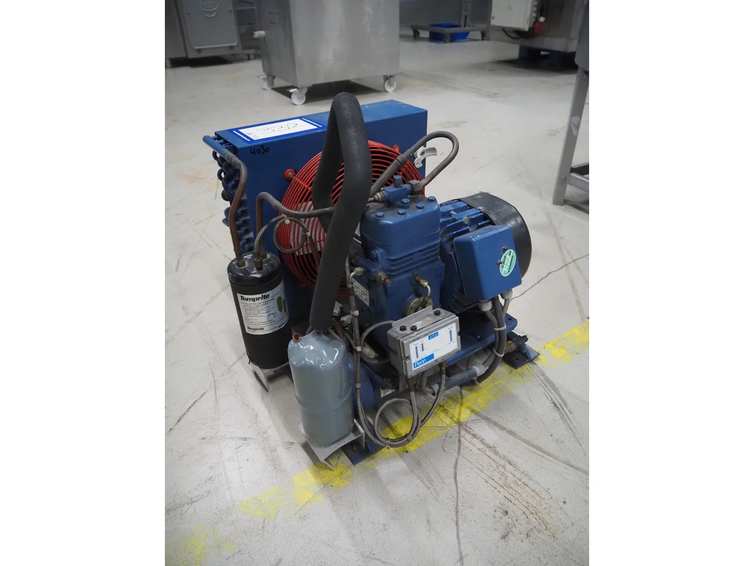 Bock condensing unit with cooling compressor, type: AM2/58-4S, number: W24452, year of construction: 1990, 220/380 V, 50 Hz, 5.4/3.1 A, capacity: 4.93 m³ per hour, dimensions: 650 mm x 550 mm x 630 mm.